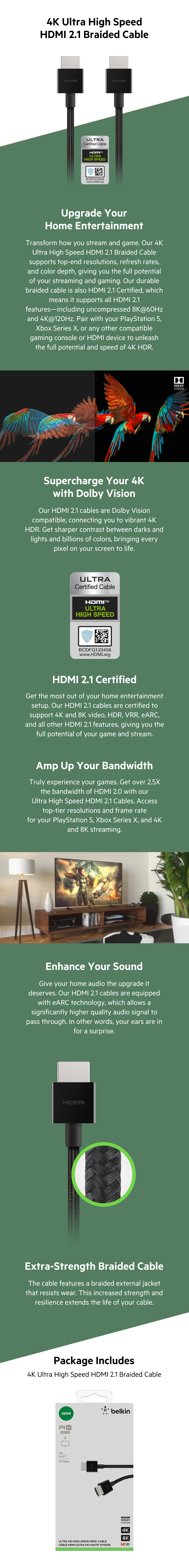 Our durable braided cable is also HDMI 2.1 Certified, which means it supports all HDMI 2.1 features—including uncompressed 8K@60Hz and 4K@120Hz.