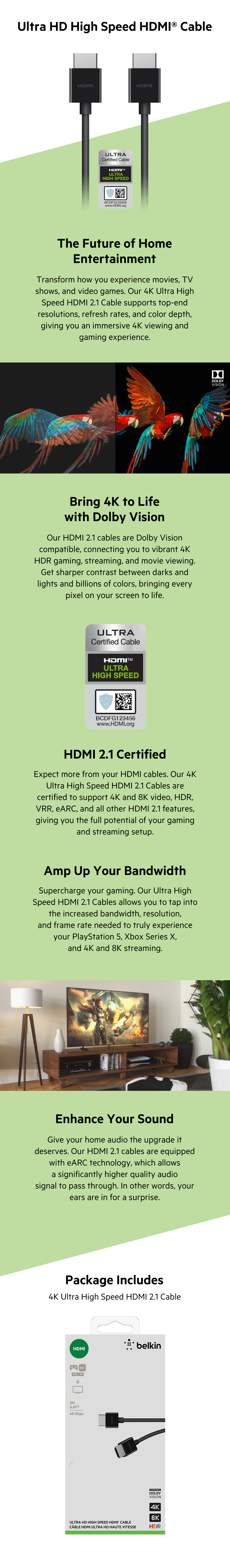 This 4K Ultra High Speed HDMI 2.1 cables support the highest resolution, frame rate, and color depth for an immersive 4K viewing and gaming experience.