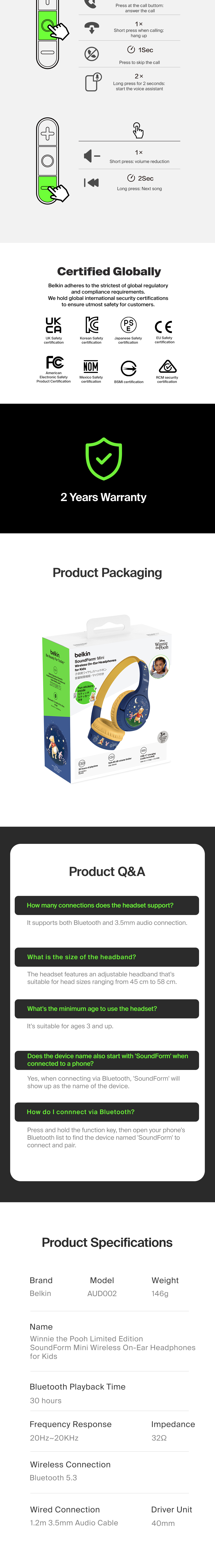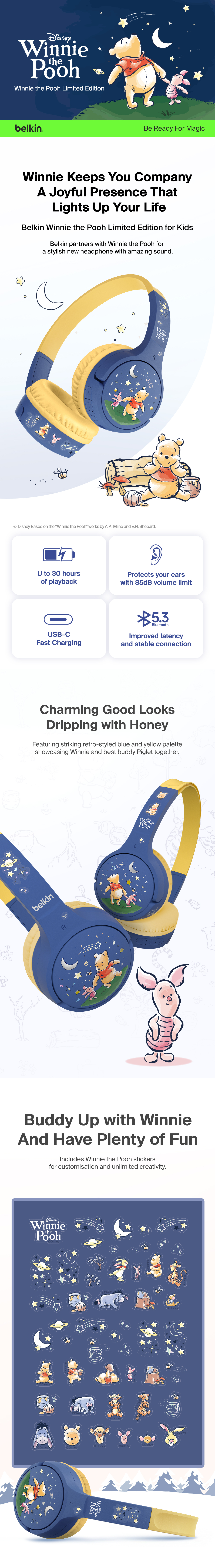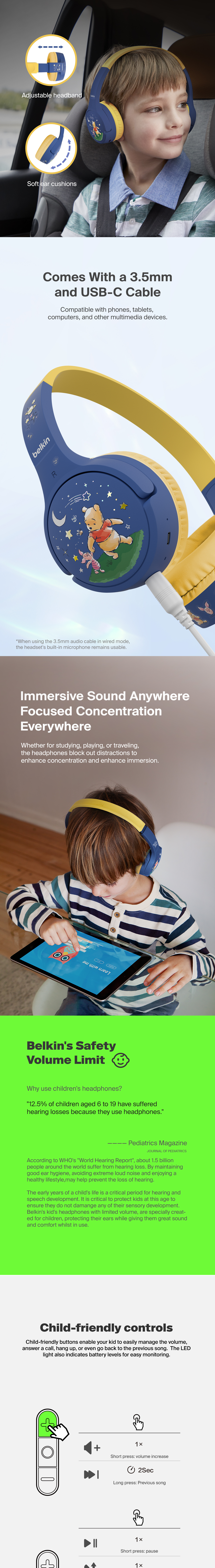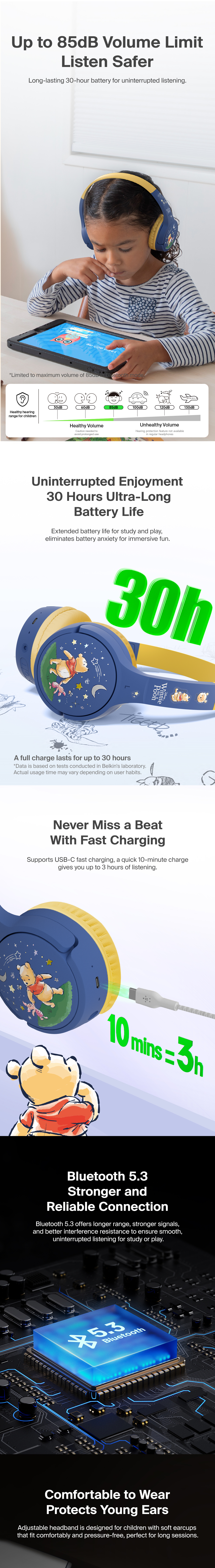 Perfect for distance learning, long car rides, and keeping them entertained, these on-ear headphones have been designed with kids 3 and up in mind. A volume cap of 85dB* protects young ears, and extended battery life keeps them listening all day long.
