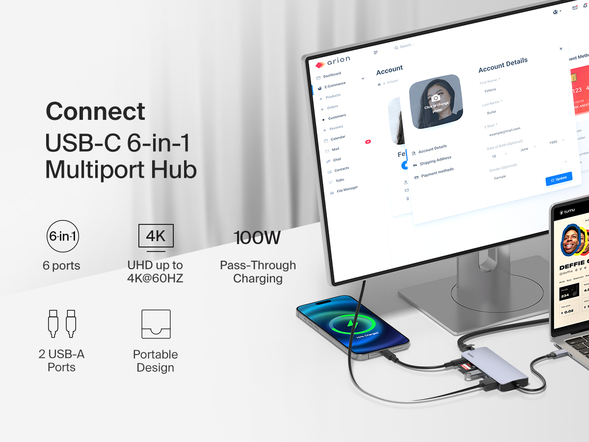 Connect to a 4K display and additional devices through one USB-C port on a MacBook, Chromebook or other laptop with our compact 6-in-1 USB-C® Hub. Create a mini workstation with its 4K HDMI port, an SD card reader, 1x USB-C PD 3.0 port and 2x USB-A ports.