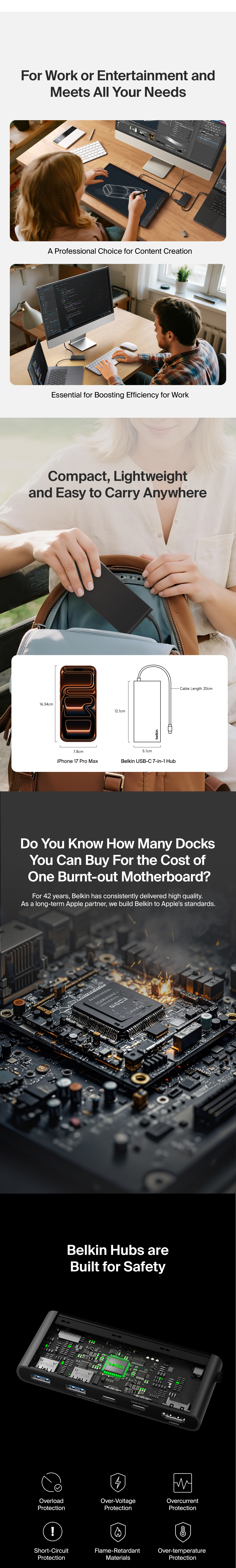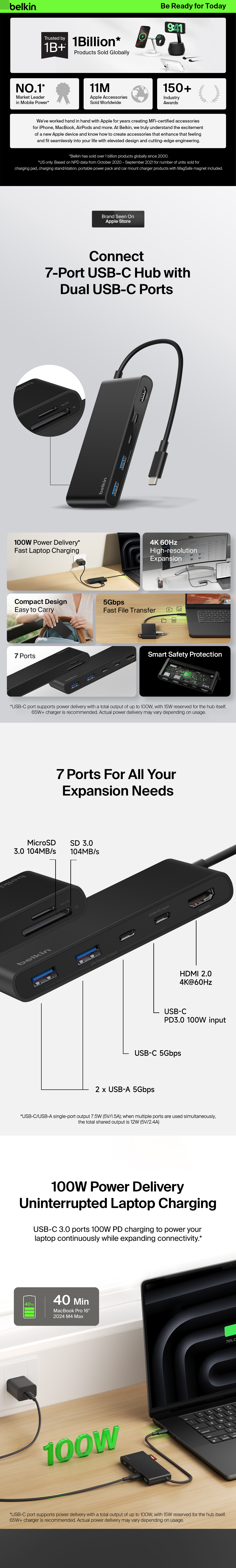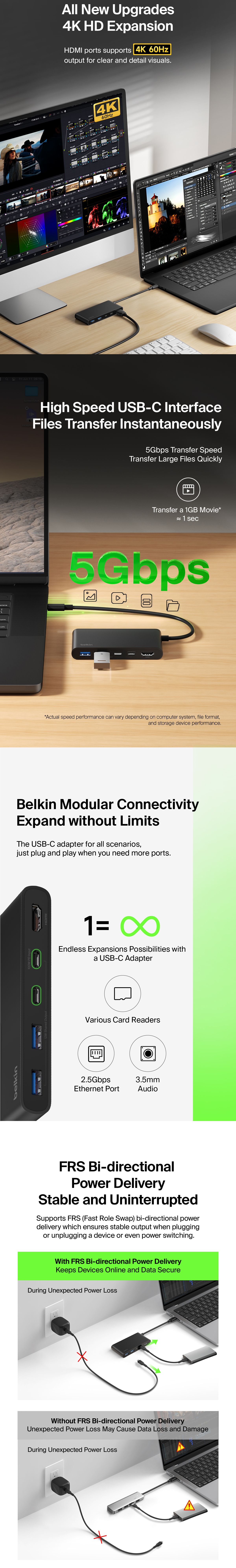 Content creators and professionals can instantly expand the number of USB-C and USB-A ports on their laptops to connect up to seven devices and optimize workstations. Upgraded HDMI 2.0† delivers crystal clear monitor resolutions, fast data transfer speeds reach up to 5Gbps.
