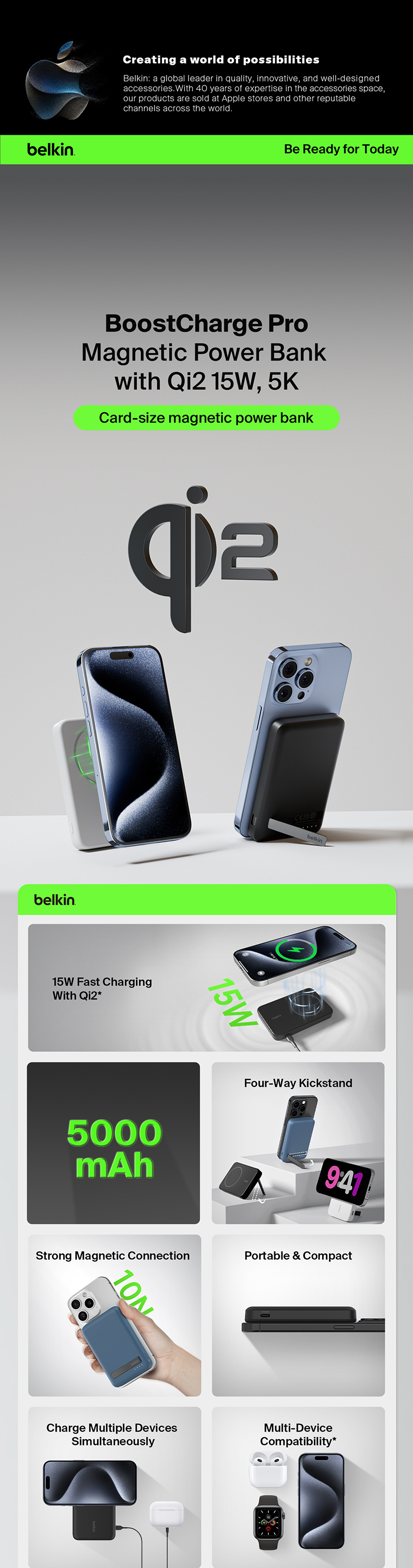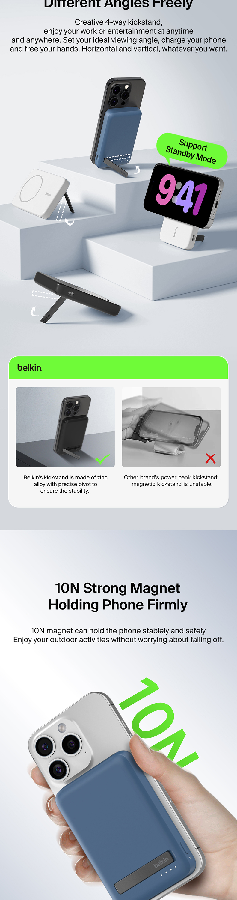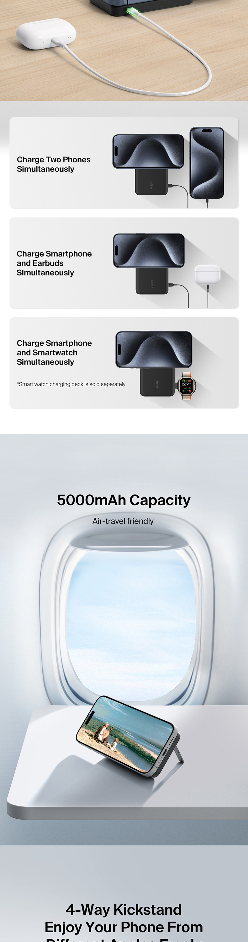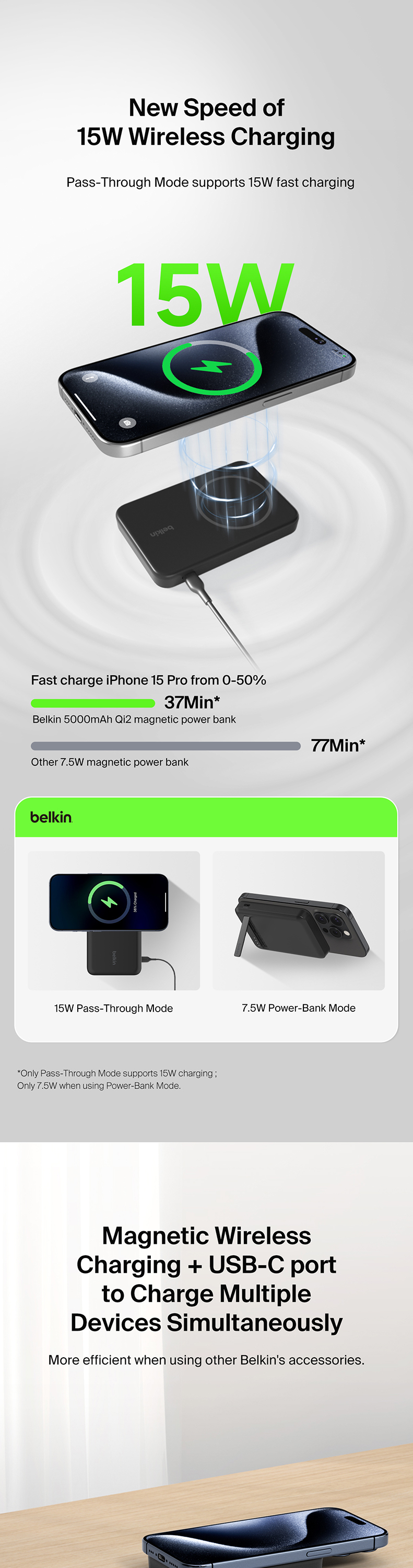 Wirelessly charge iPhone and other Qi2-enabled smartphones quickly and safely with our BoostCharge Pro Magnetic Power Bank with Qi2 15W 5K§. Your Qi2 and MagSafe compatible devices will have easy and seamless on-the-go charging up to 15W. Watch video, stream or create content at the perfect viewing angle with the integrated kickstand — even while your device is charging.