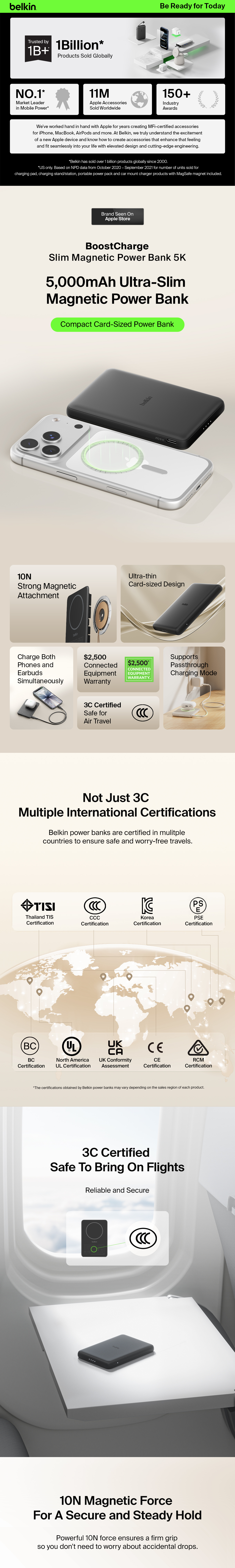 Stay powered on the go with a portable, 7.5W wireless power bank that’s so slim, you can comfortably slip it into your pocket while attached to your phone. Charge two devices at once via magnetic charging pad and USB-C port. This power bank is TSA Carry-on Compliant, providing peace of mind when you travel.