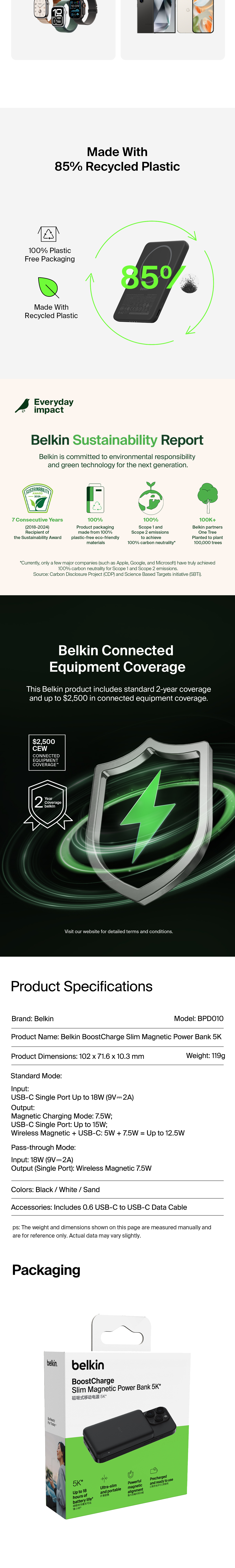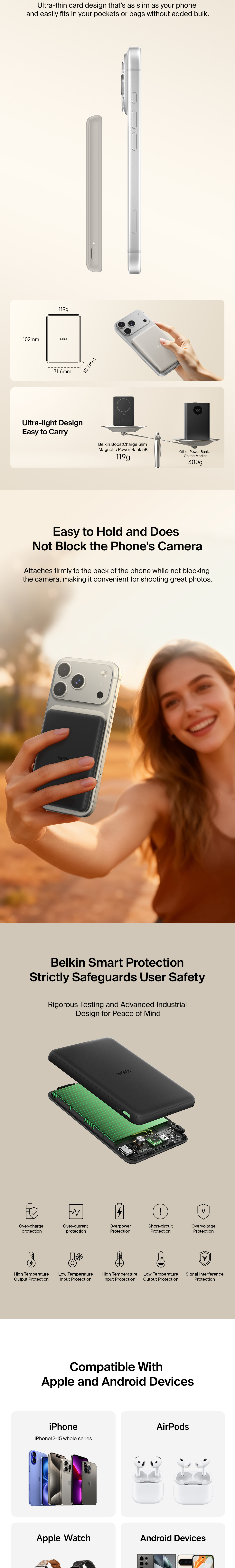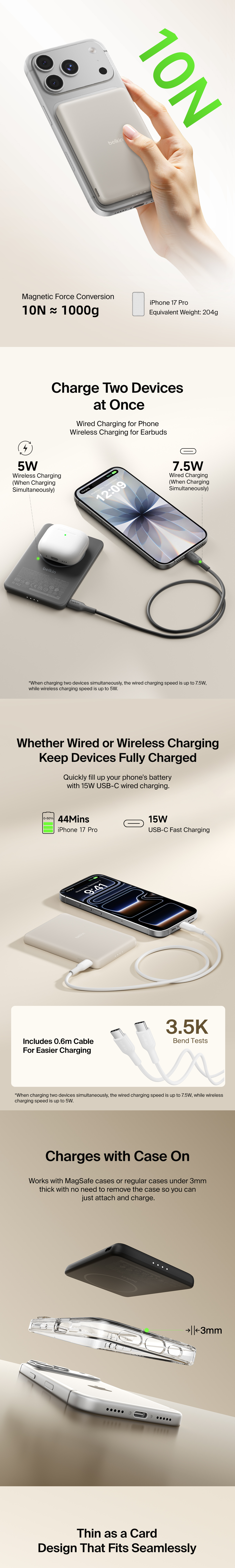 Stay powered on the go with a portable, 7.5W wireless power bank that’s so slim, you can comfortably slip it into your pocket while attached to your phone. Charge two devices at once via magnetic charging pad and USB-C port.