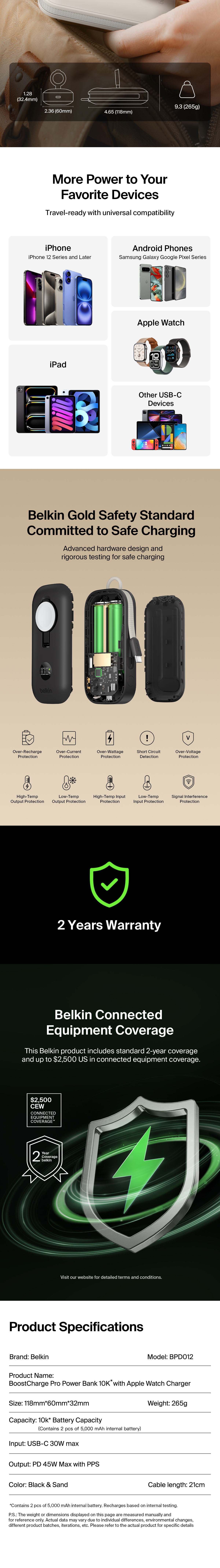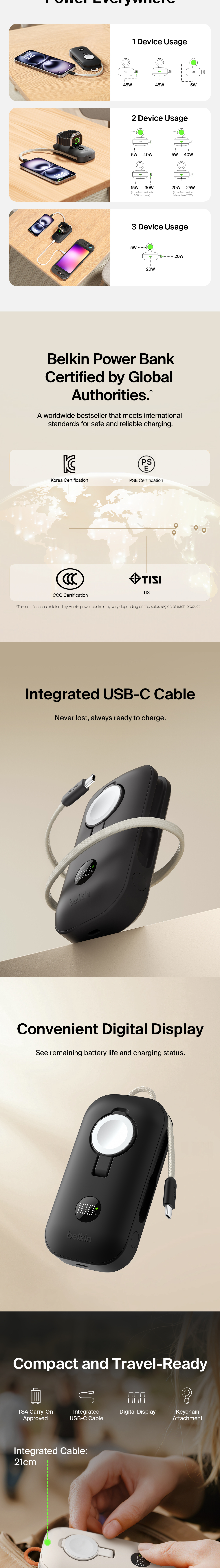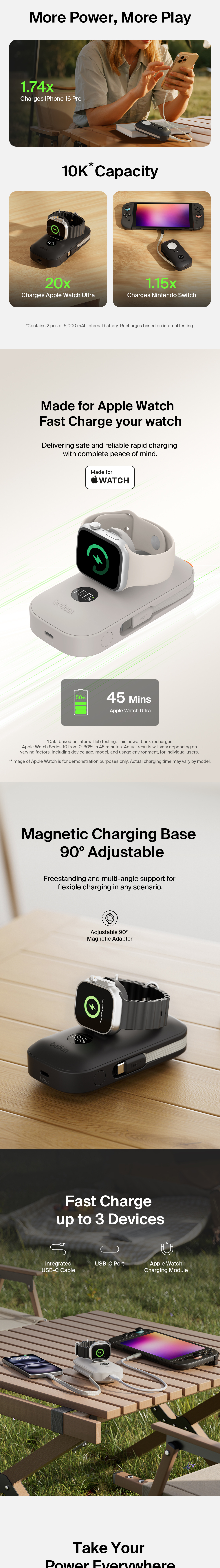 Fast charge your iPhone, Apple Watch, and any USB-C device all at once with this ultra-compact 3-in-1 power bank. Featuring a built-in Apple Watch charger, integrated USB-C braided cable and USB-C port, you can fuel everything from smartphones to gaming consoles.
