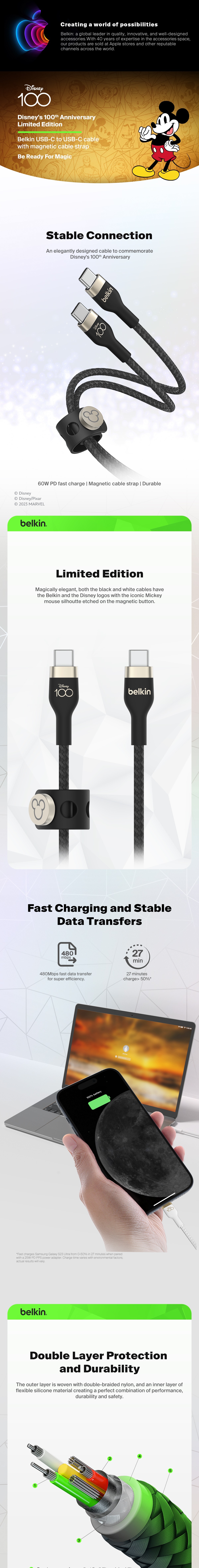 Built with a double-braided exterior, BoostCharge Pro Flex silicone cables are up to 30x more durable. Includes a magnetic cable management system. Including the Disney 100th Anniversary Edition in black, white and Marvel edition.