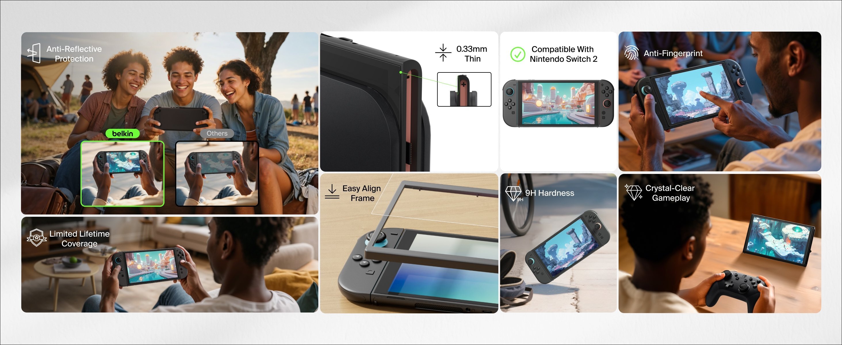 *Do not remove the factory-installed screen protector on Switch 2. Please apply the Belkin screen protector directly over it to ensure optimal protection.