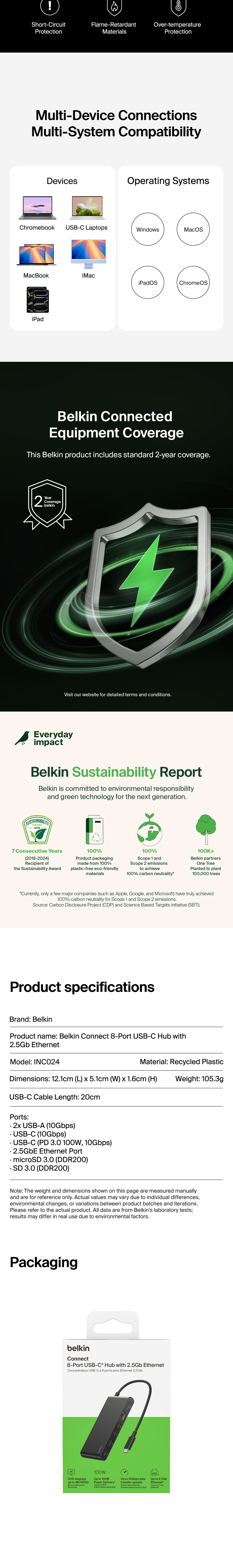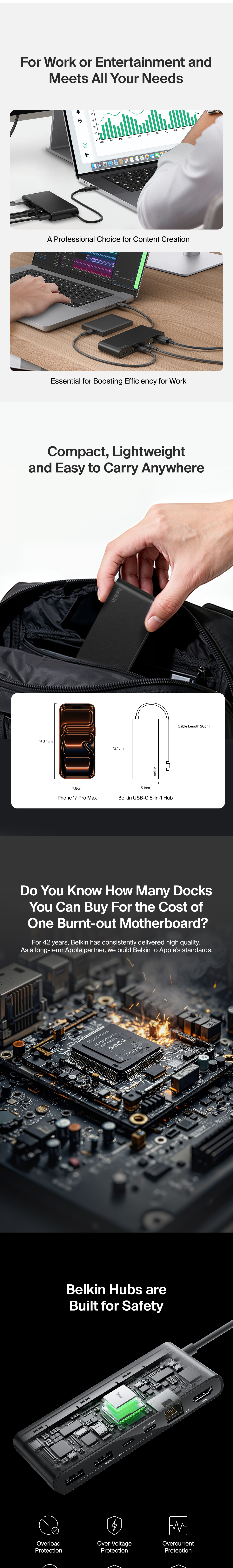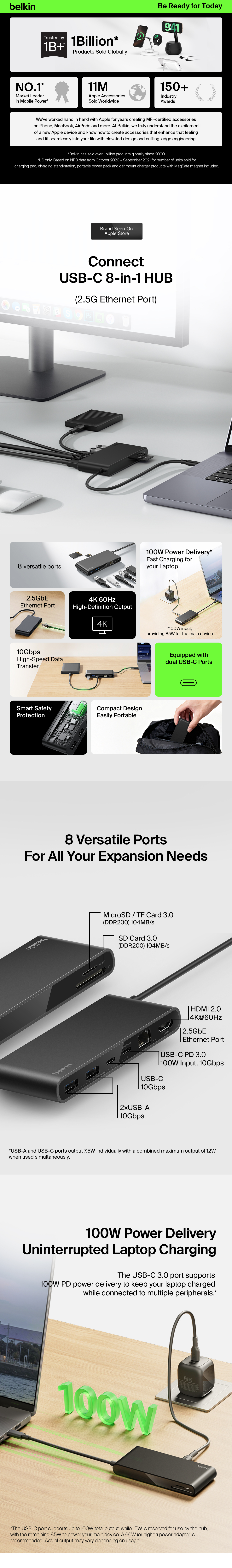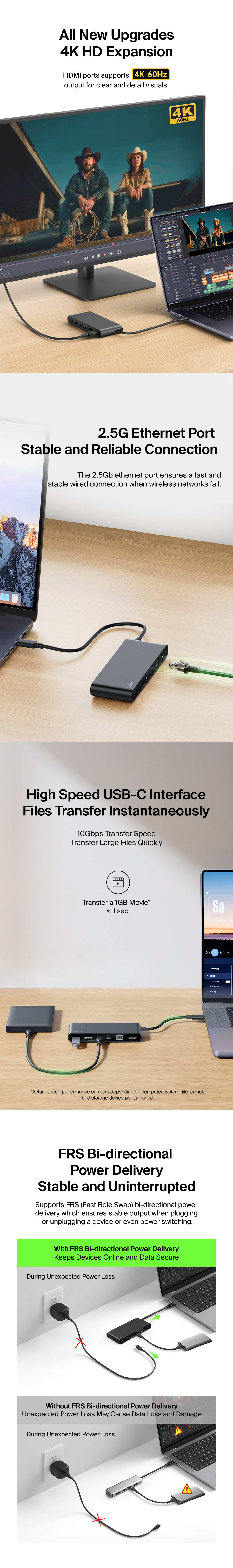 Professionals seeking more ports for peripherals can connect up to eight devices from a single USB-C cable to power and expand workstations. This hub packs up to 100W Power Delivery to your host device,† 4K@60Hz resolutions and up to 2.5Gb Ethernet.§ Whether you’re looking to boost productivity or quickly transfer files, it’s ready when you’re at home, in the office or on the go.