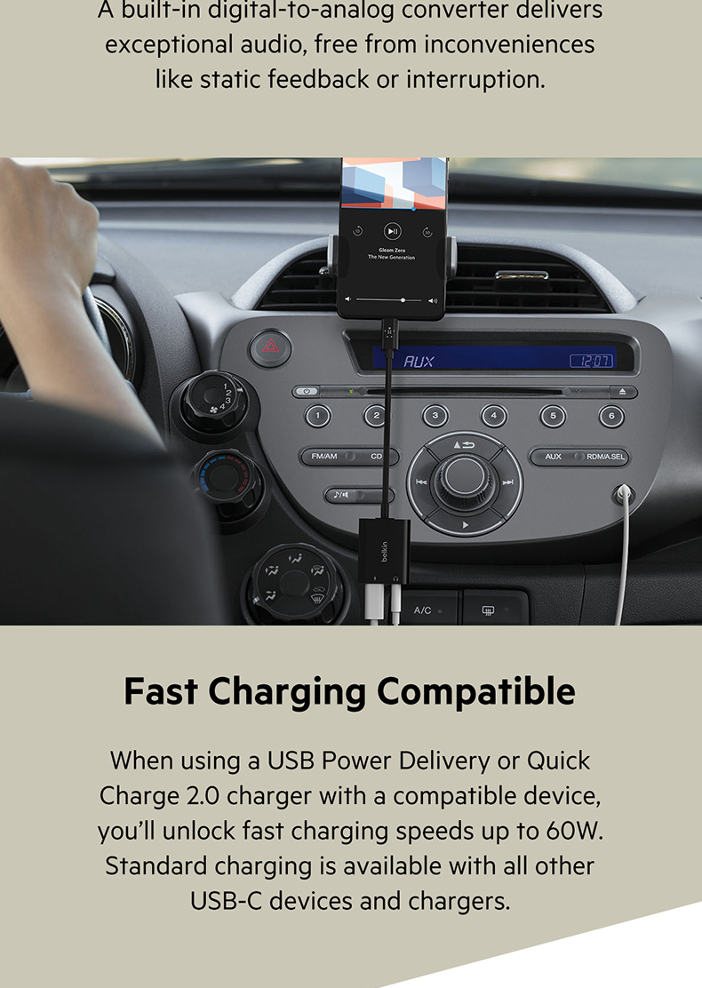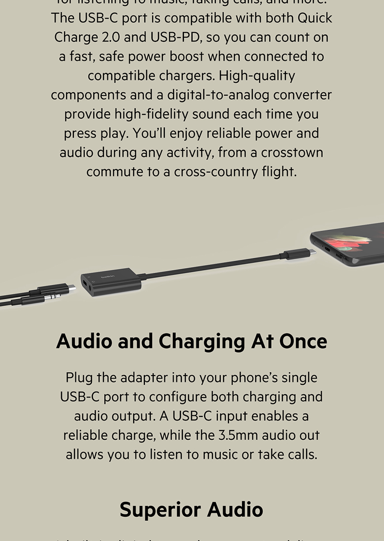 Listen to music and take calls while getting up to 60W of passthrough power. Keep an open USB-C port with single-port devices to enjoy uninterrupted function while maintaining the fast charging capabilities of your device.