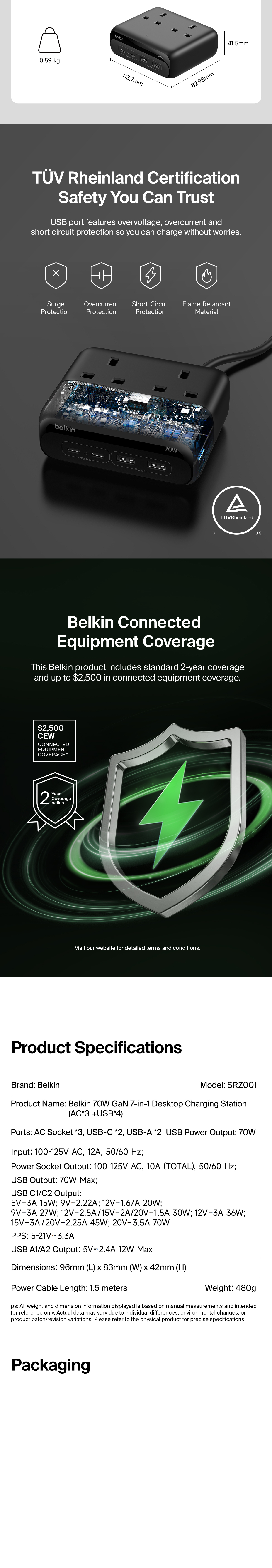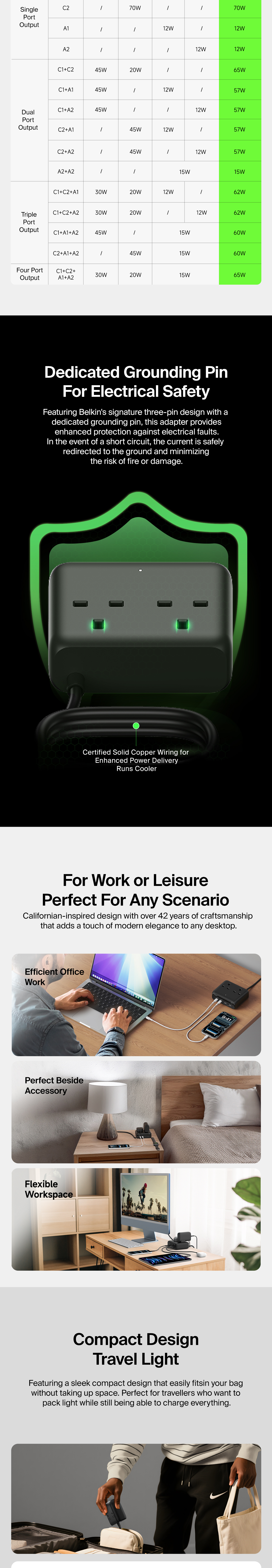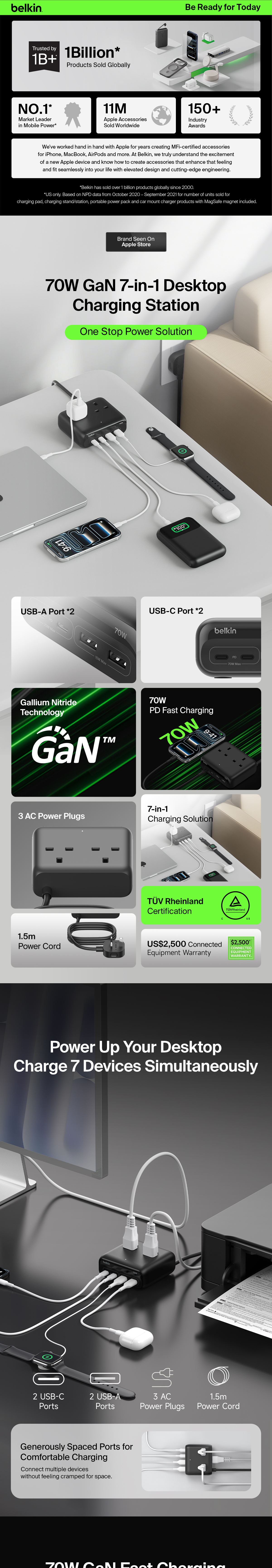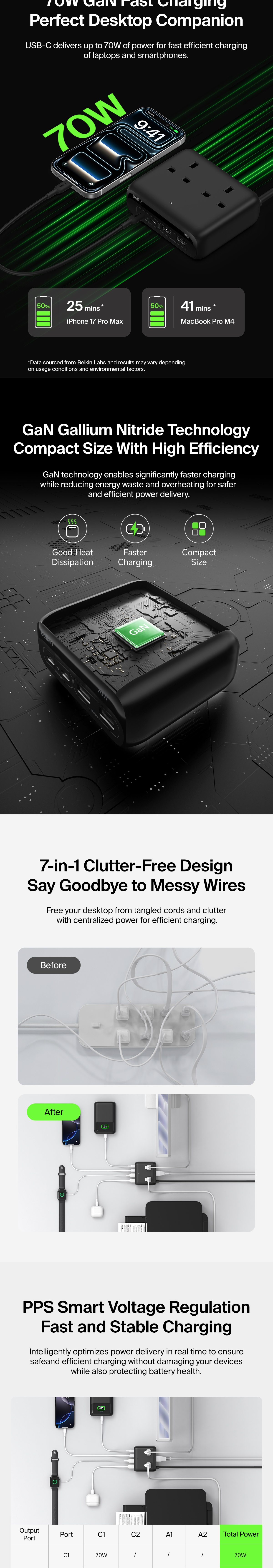Power and charge up to 6 devices with a fast-charging GaN technology station ideal for home and office desktops. 70W max Power Delivery from dual USB-C ports to charge your laptop, iPhone, Apple Watch and more. Plus, 2 AC outlets to power monitors, lamps and other equipment.