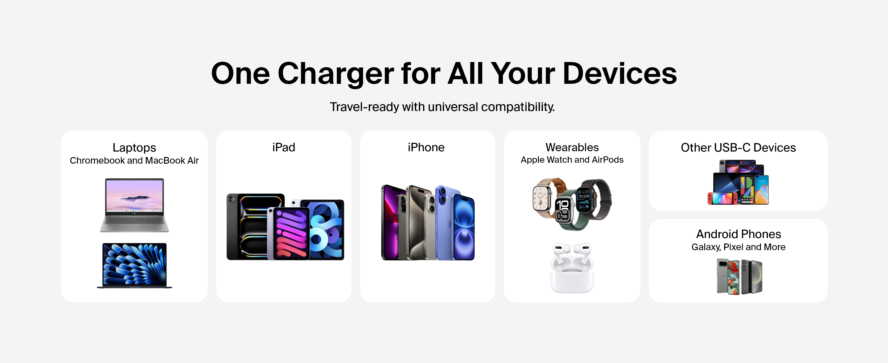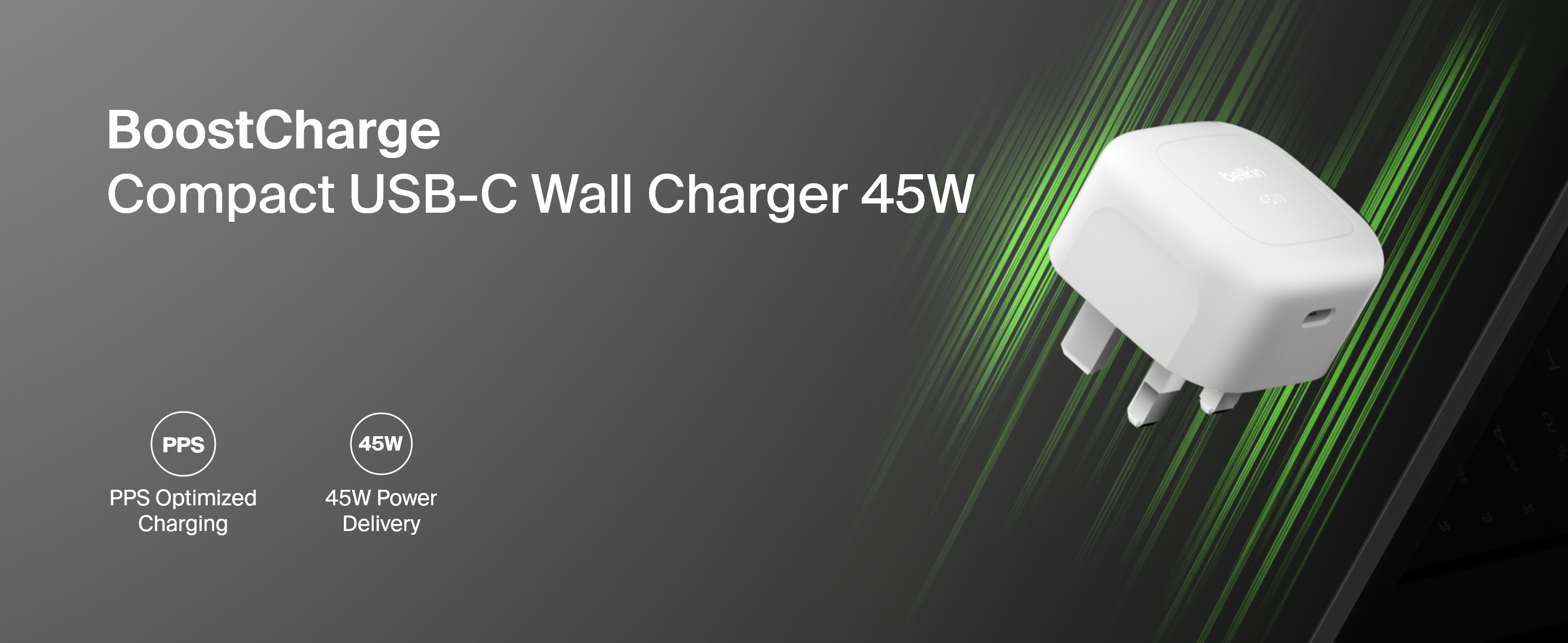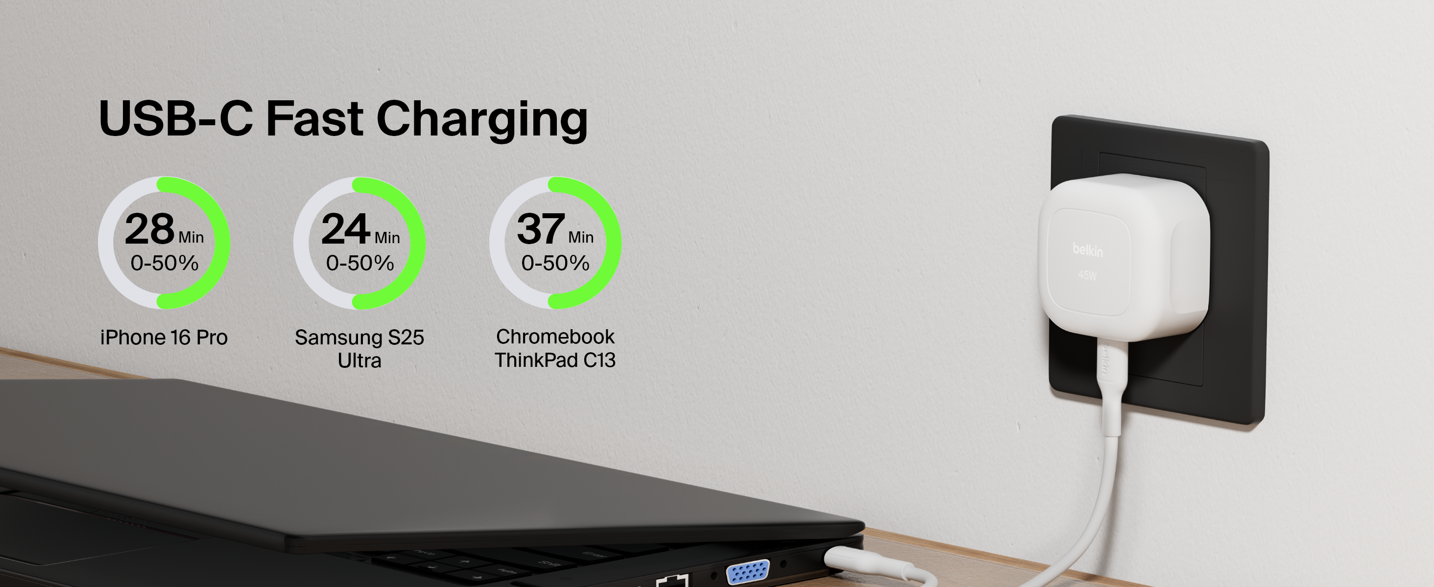This compact charger offers up to 45 watts of power to charge your phone, Chromebook or tablet, or to power your MagSafe-enabled accessories at their optimal speed.