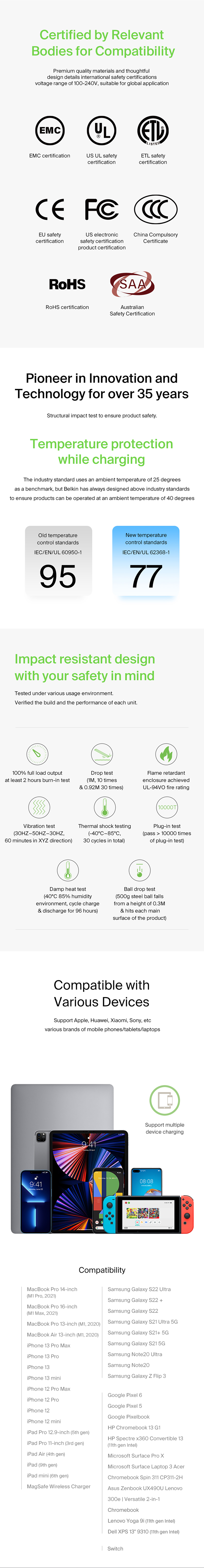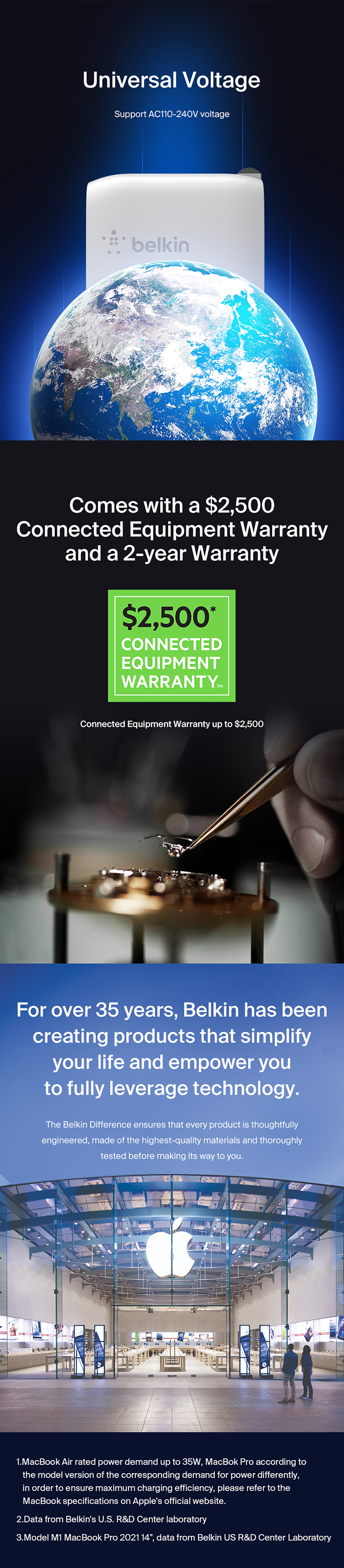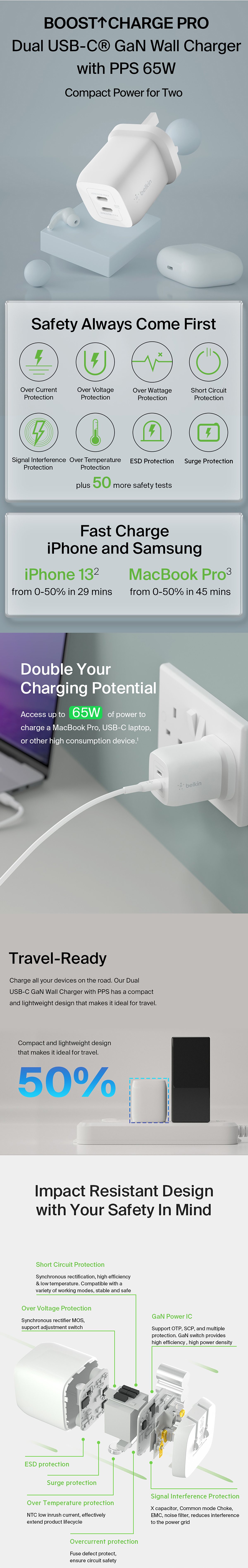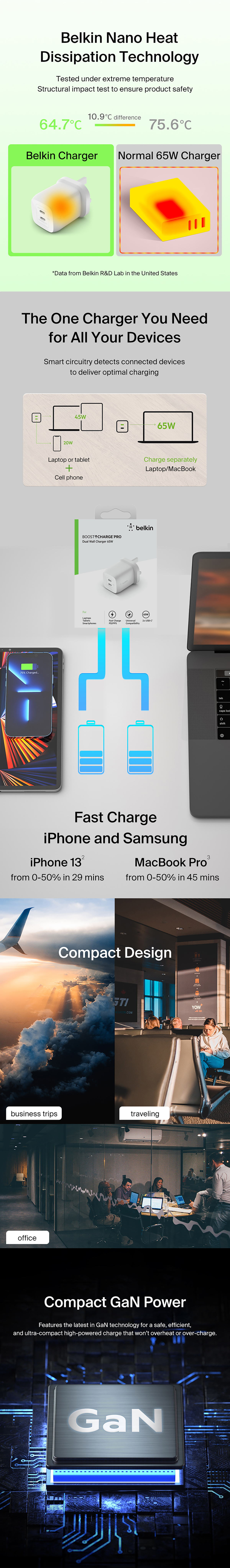 Our 65W dual USB-C home charger allows you to charge your MacBook†† and iPhone simultaneously. To provide safe and fast charging for Apple and Samsung, it uses GaN, USB-C PD 3.0, and PPS charging technology.