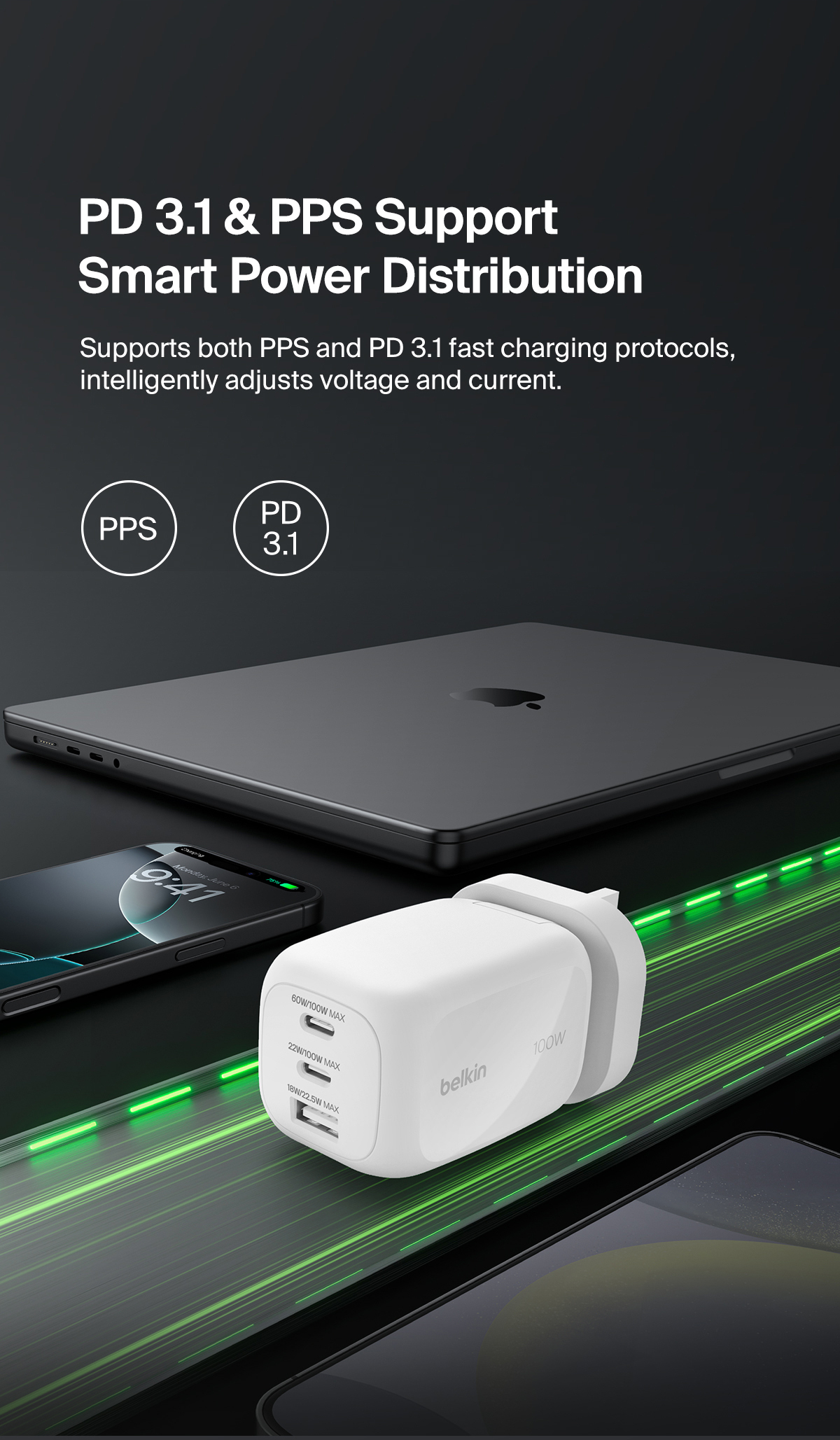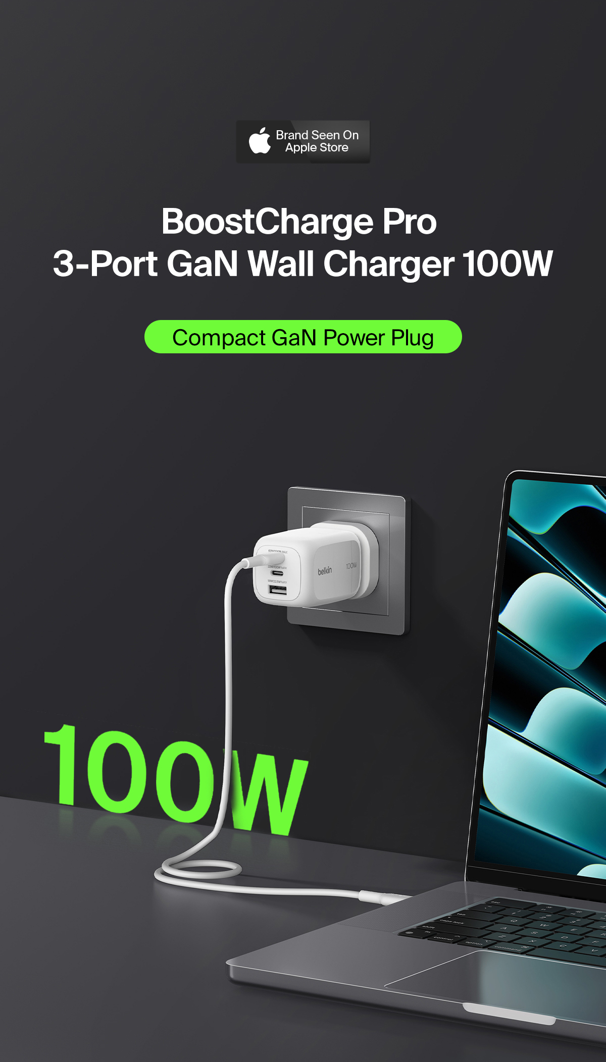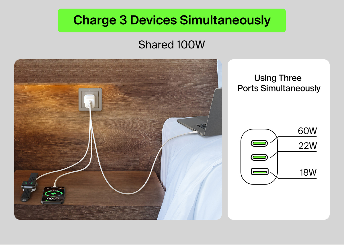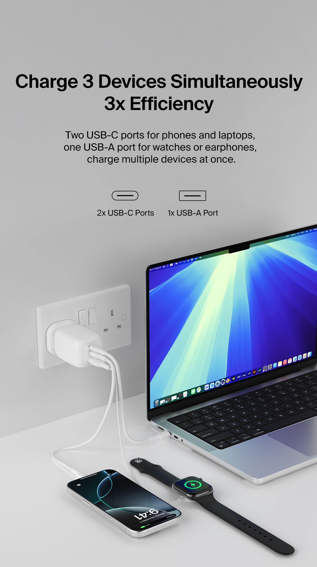 Power a laptop and two additional devices with our 3-Port GaN Wall Charger 100W. Two USB-C PD ports with PPS offer fast charging for all compatible devices, with a convenient USB-A port for standard charging.