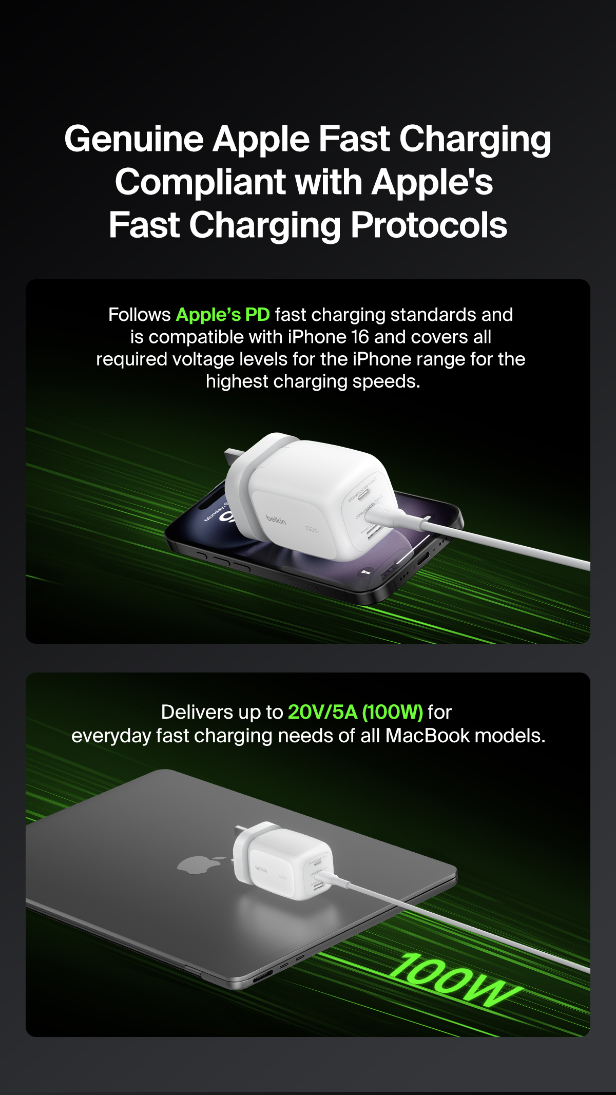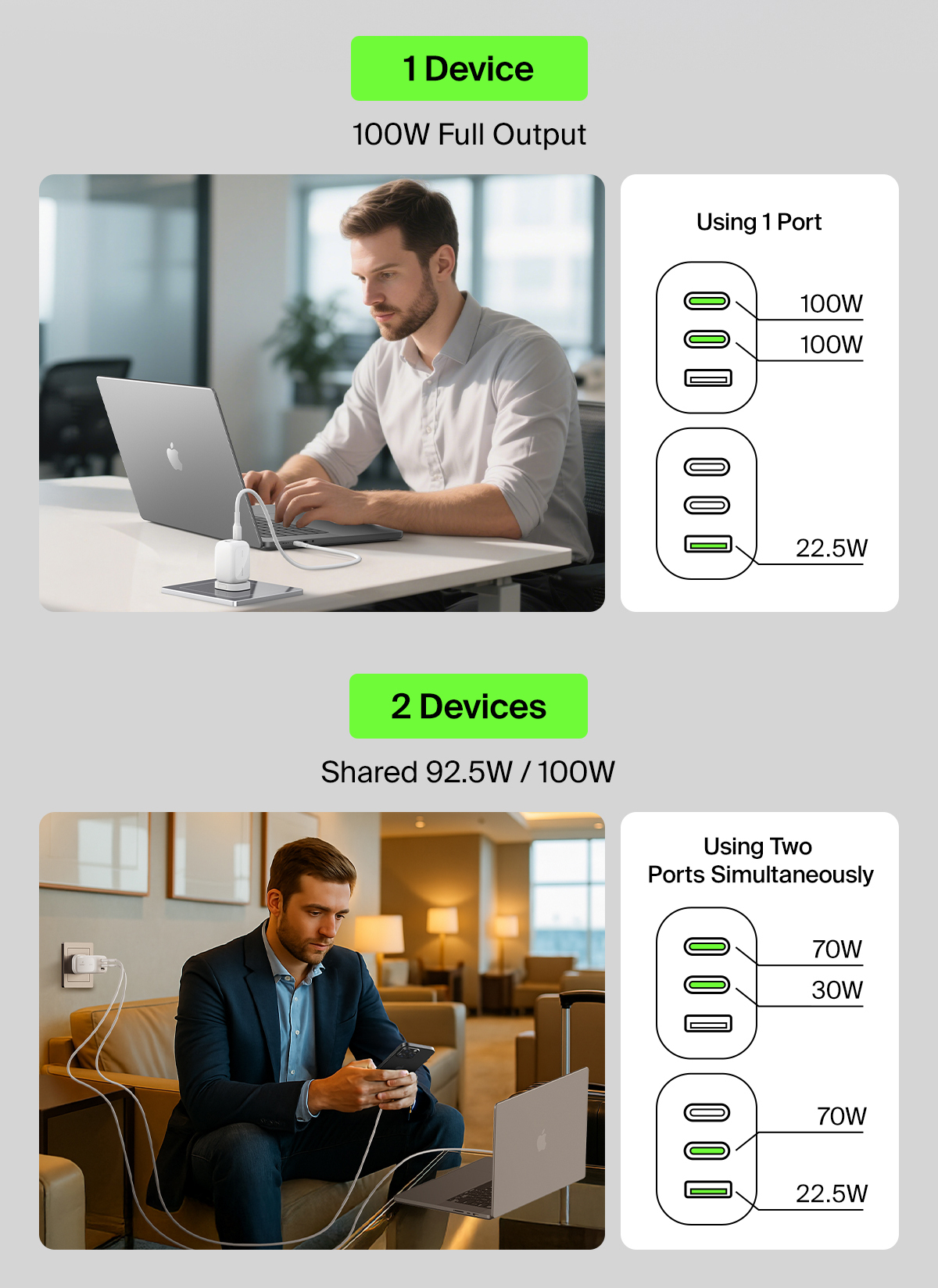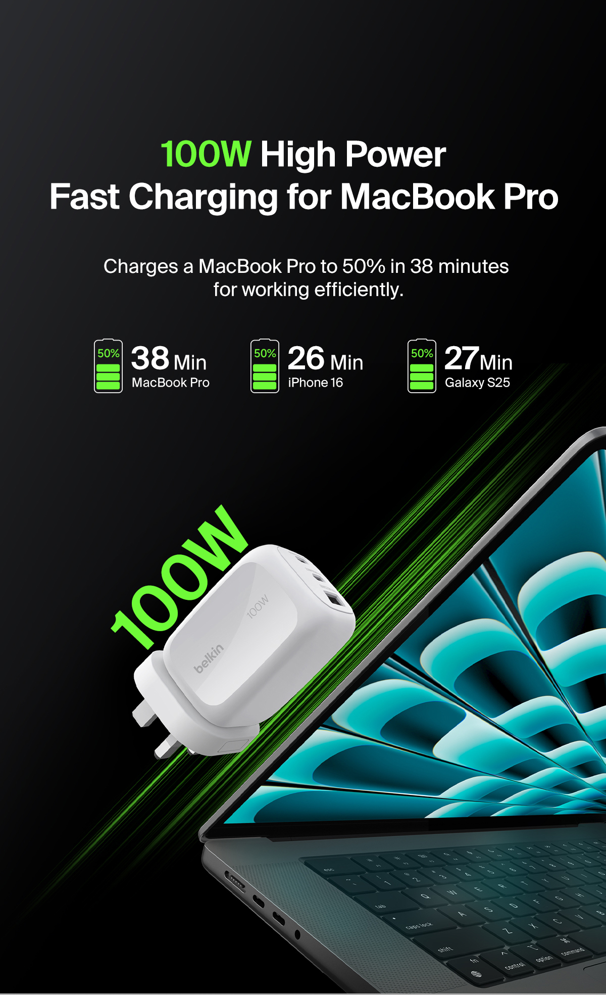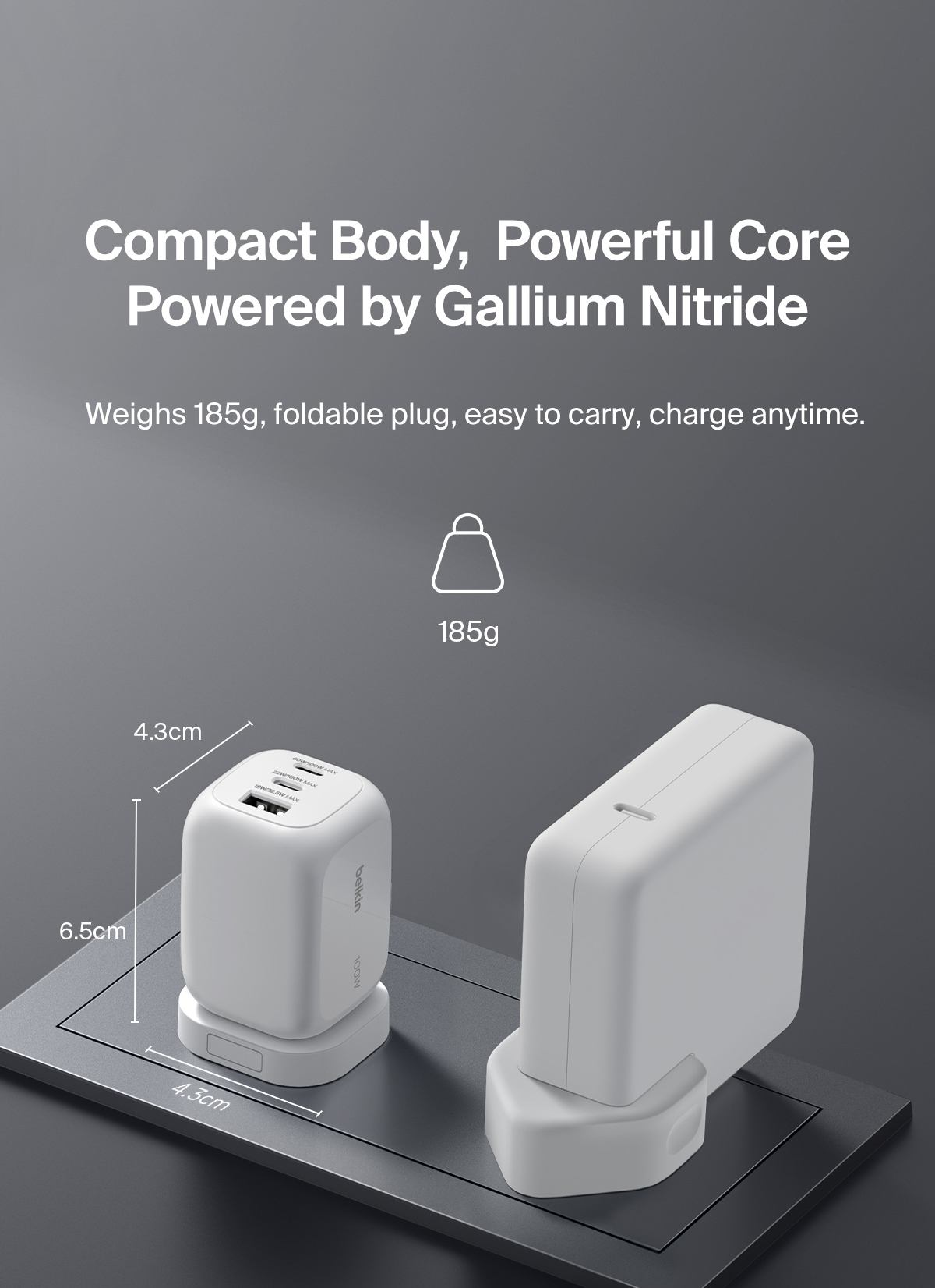 Power a laptop and two additional devices with our 3-Port GaN Wall Charger 100W. Two USB-C PD ports with PPS offer fast charging for all compatible devices, with a convenient USB-A port for standard charging.