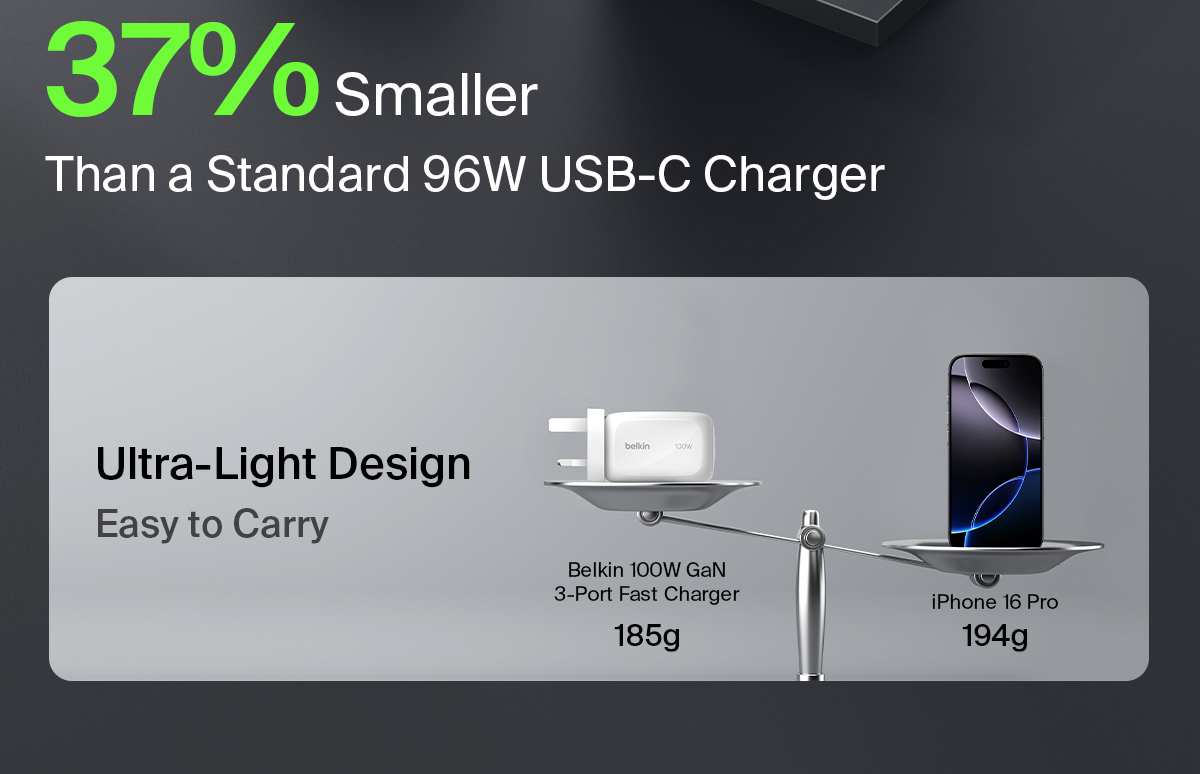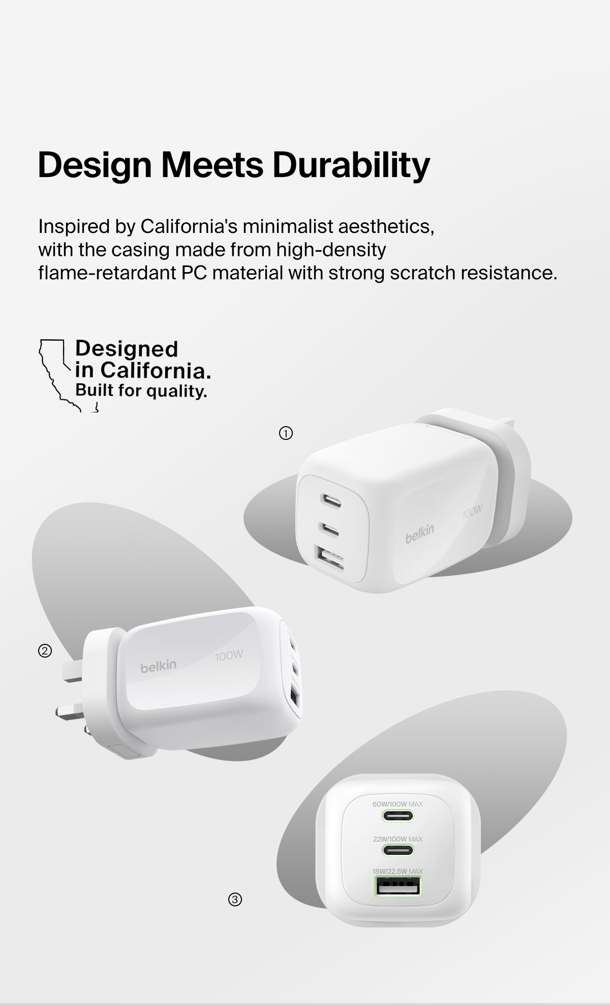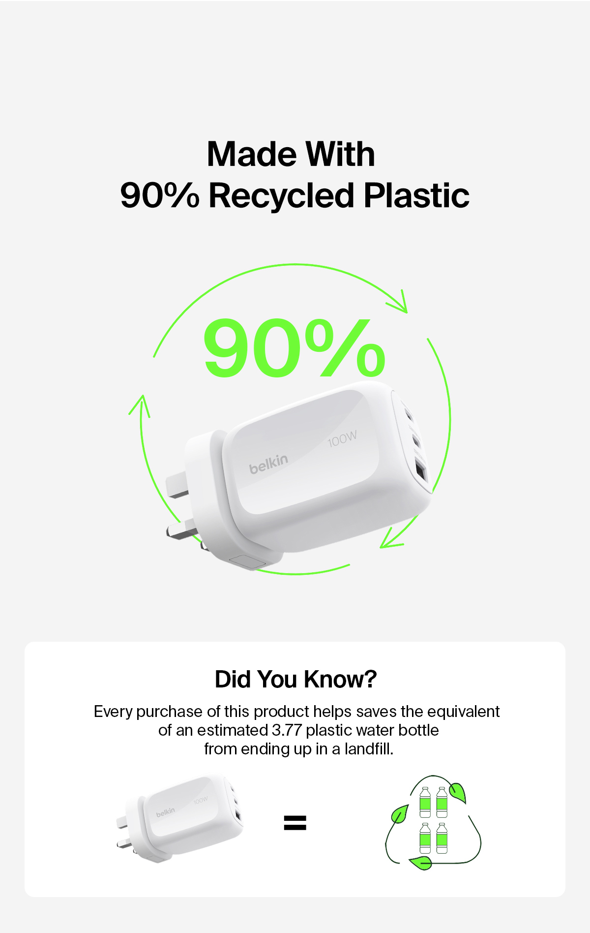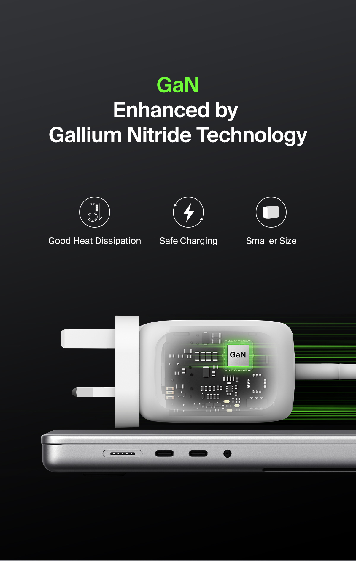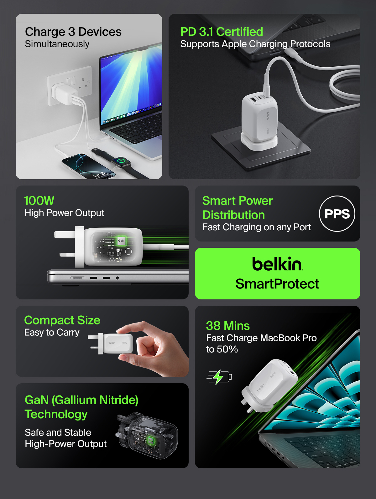 Power a laptop and two additional devices with our 3-Port GaN Wall Charger 100W. Two USB-C PD ports with PPS offer fast charging for all compatible devices, with a convenient USB-A port for standard charging.