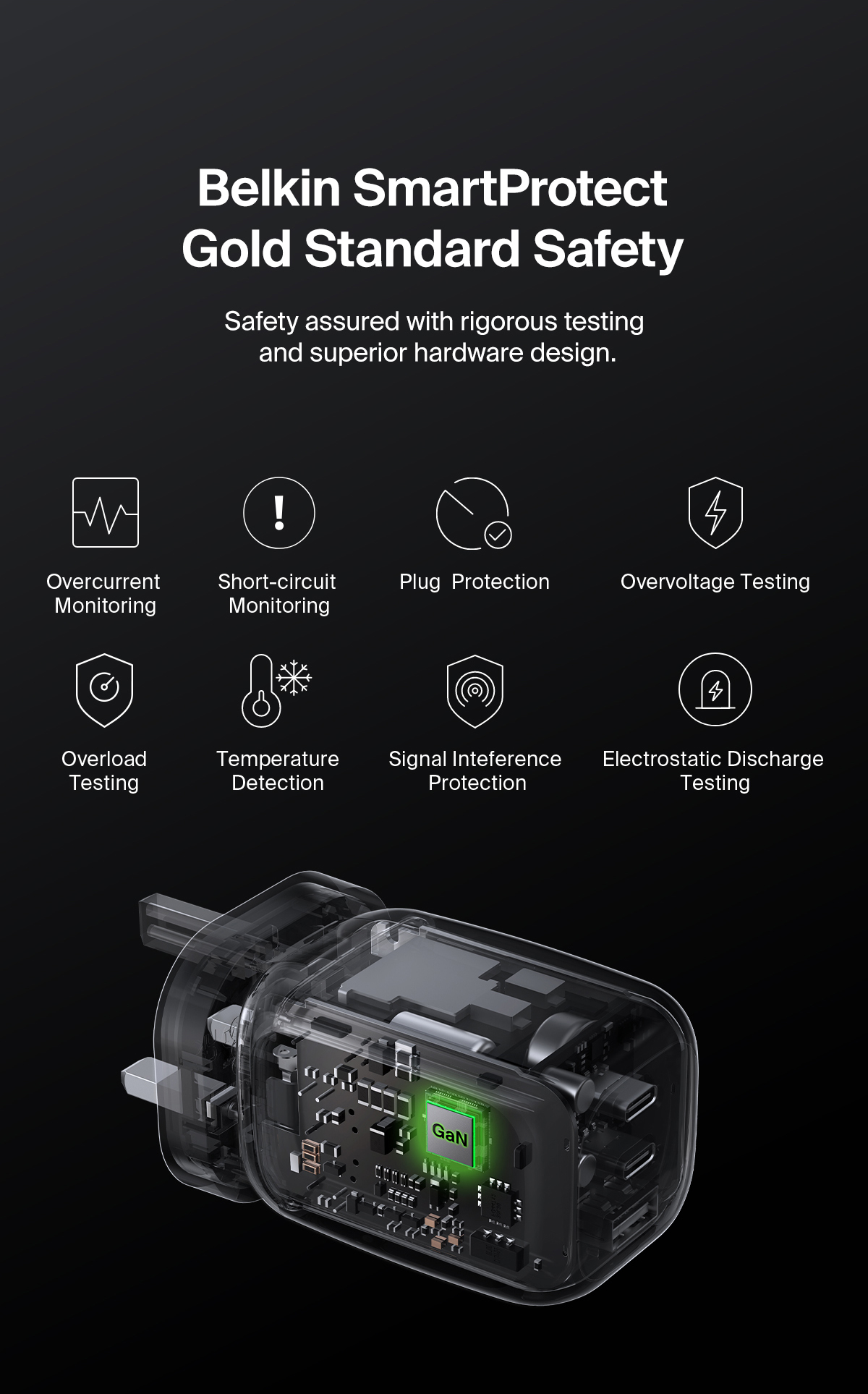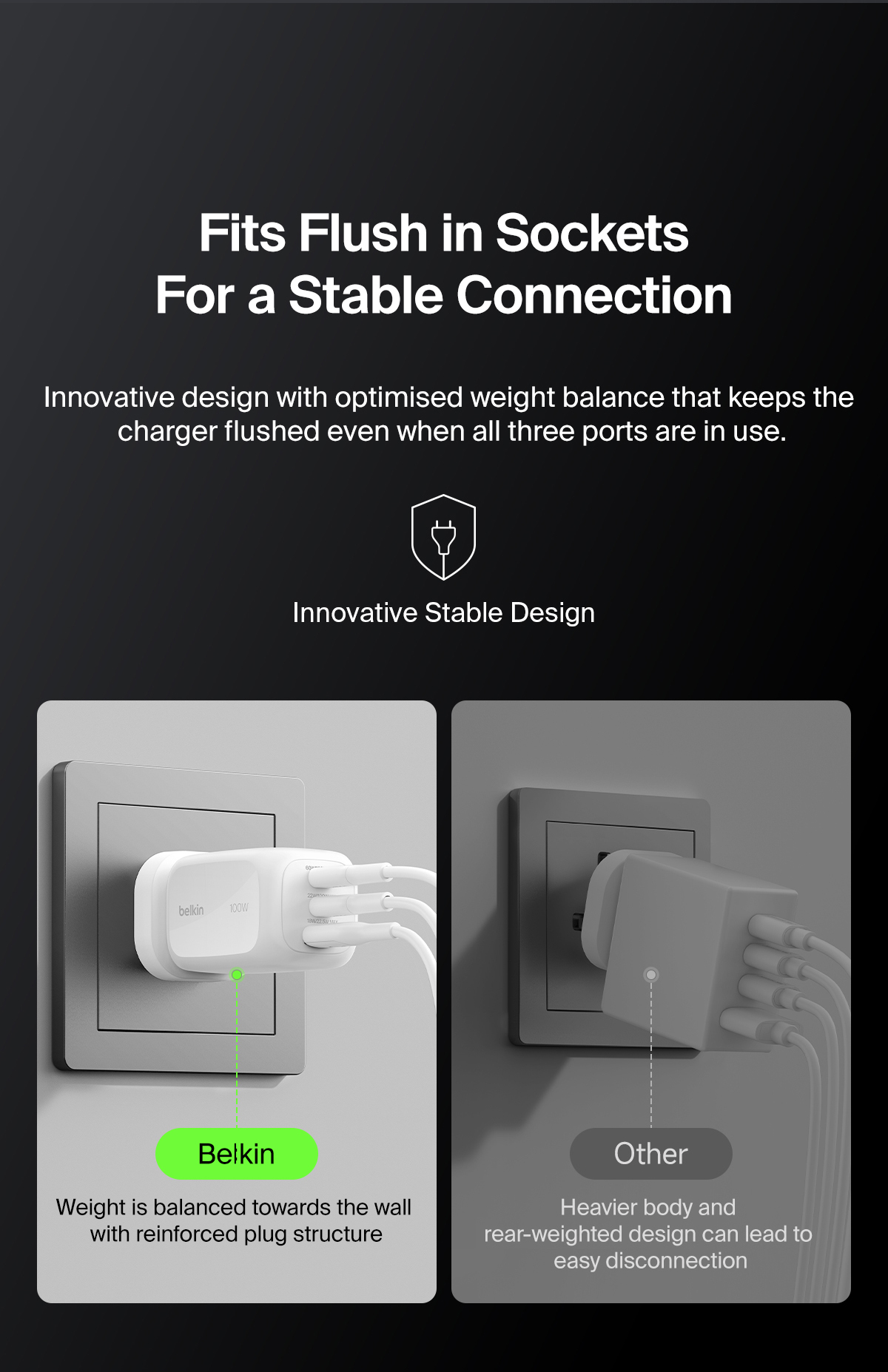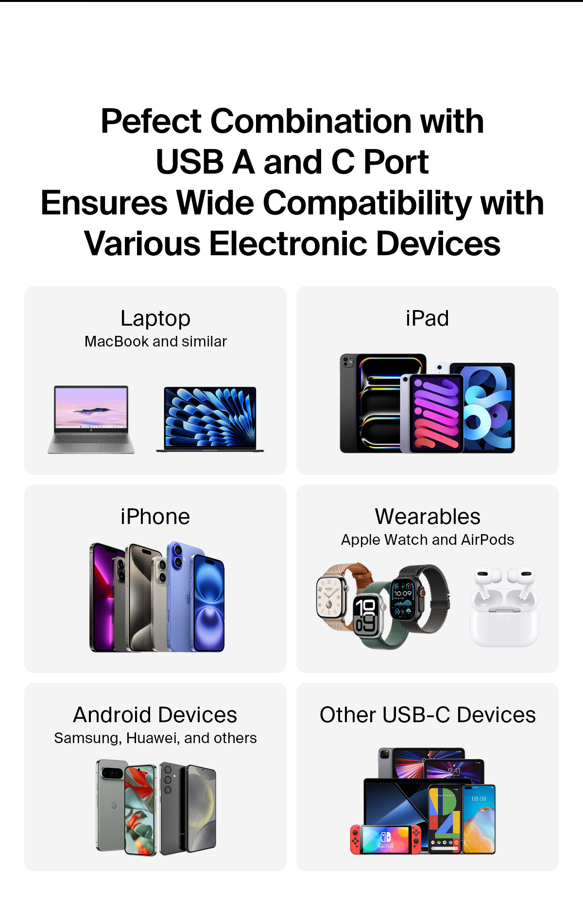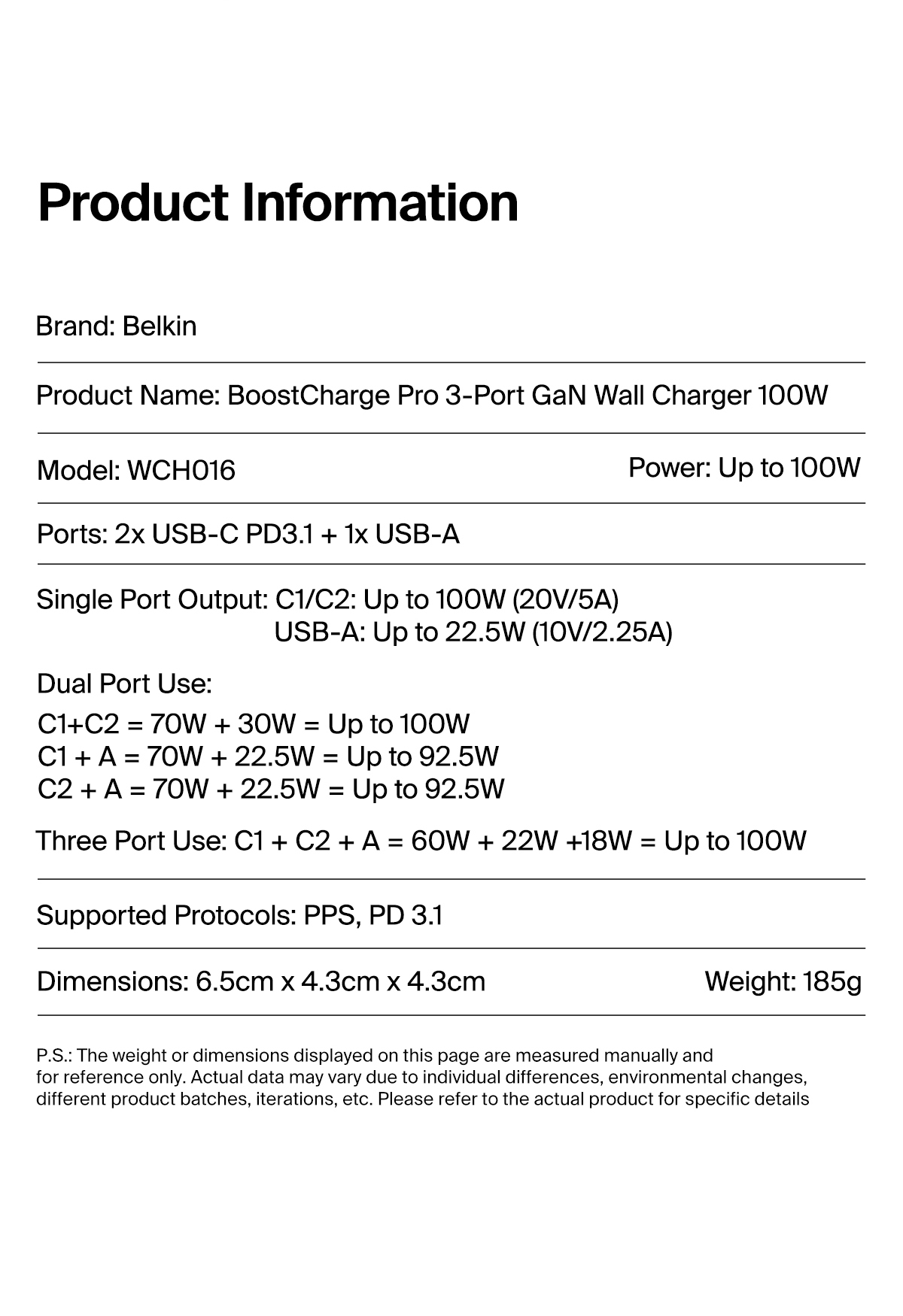 Power a laptop and two additional devices with our 3-Port GaN Wall Charger 100W. Two USB-C PD ports with PPS offer fast charging for all compatible devices, with a convenient USB-A port for standard charging.
