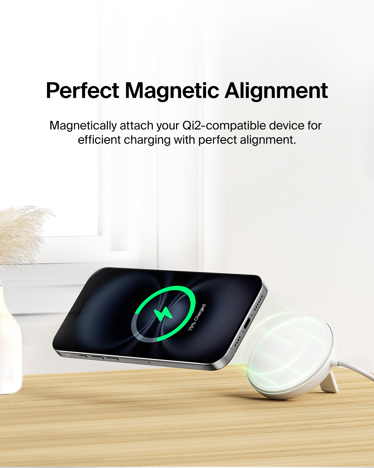 Elevate your iPhone charging experience with our Magnetic Wireless Charging Pad with Qi2. Offering up to 15W fast wireless charging, this sleek and efficient pad ensures your device is ready for use. Its powerful magnetic technology keeps your phone securely in place, even during incoming calls or vibrations. It is the perfect addition to your desktop for seamless and stylish charging.