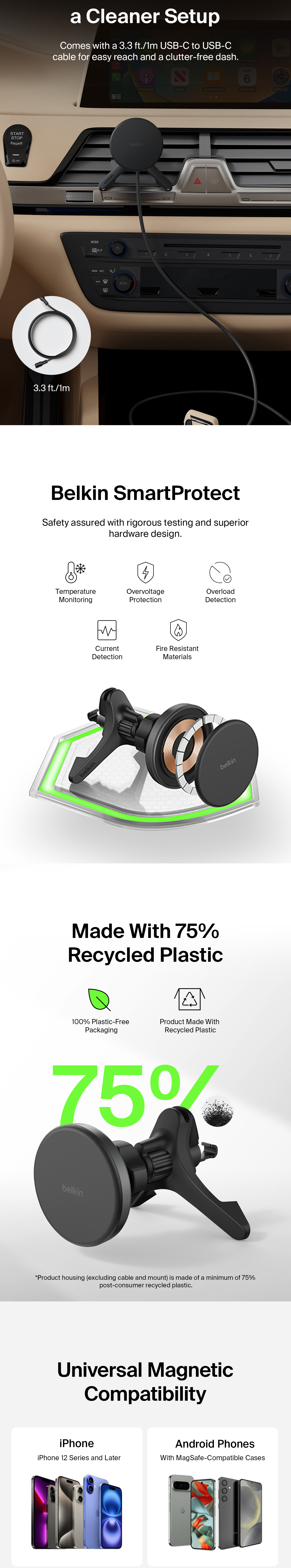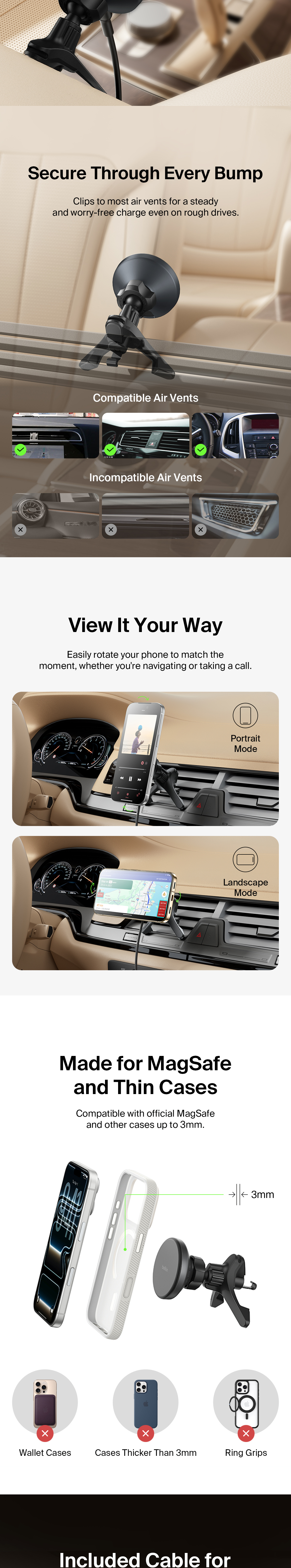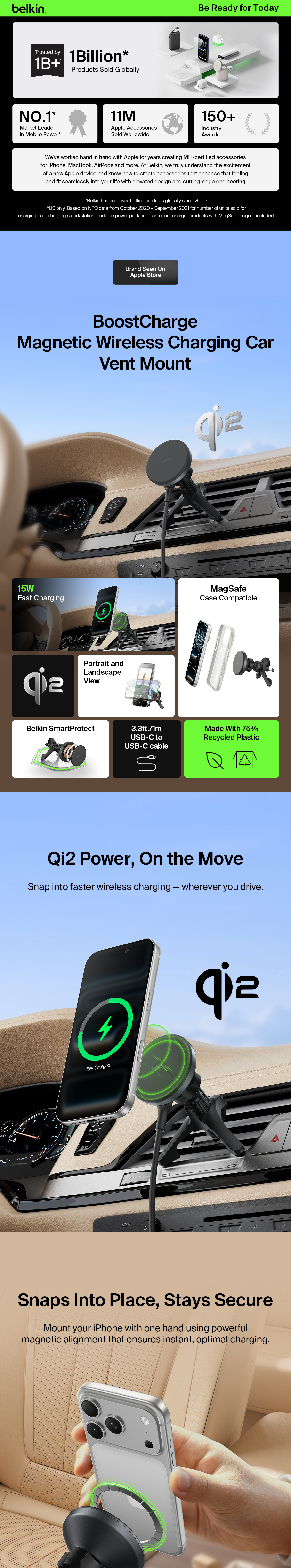 This wireless Qi2 charger is a road warrior that delivers up to 15 watts of top speed phone charging. Combining safety and a secure mount for your device while it charges, its strong magnetic alignment holds your phone in portrait or landscape mode.