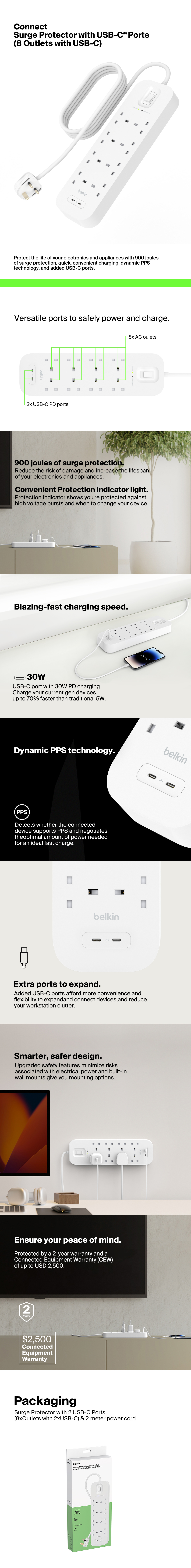 Keep your electronic devices protected with 900 joules of surge protection and dual USB-C ports for added convenience. Built with safety in mind, the protection indicator light signals your devices are safe. Save time with USB-C PD.