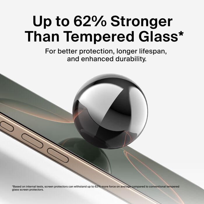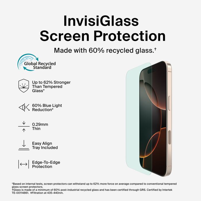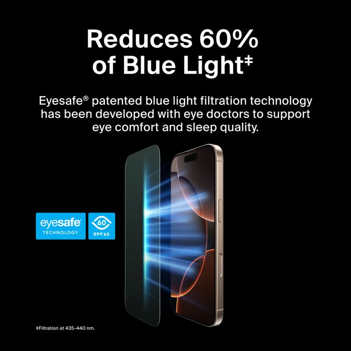 Our screen protector offers an Eyesafe blue light filter technology* to support eye comfort and sleep quality. Up to 62% stronger than tempered glass,‡ InvisiGlass is engineered to look and feel just like your original screen and protect against impact