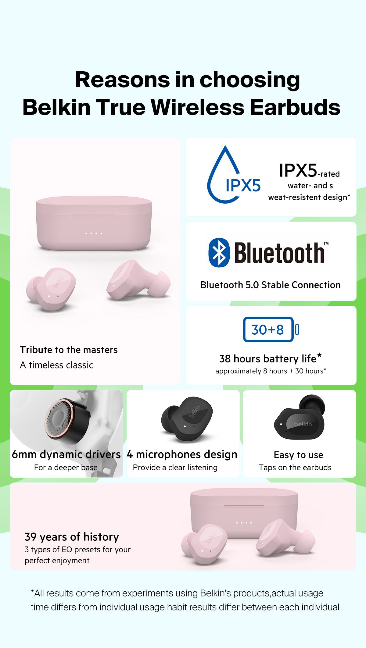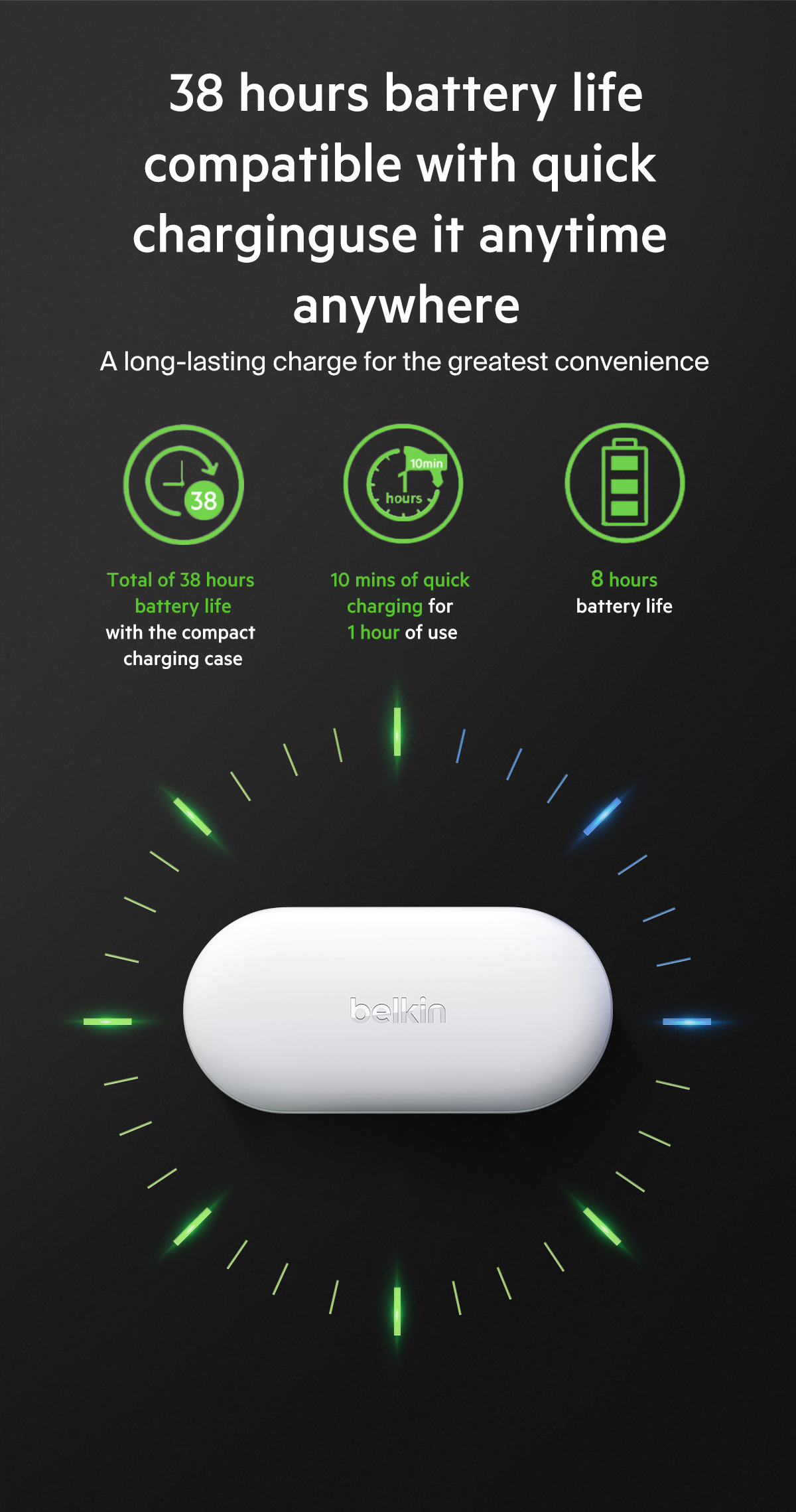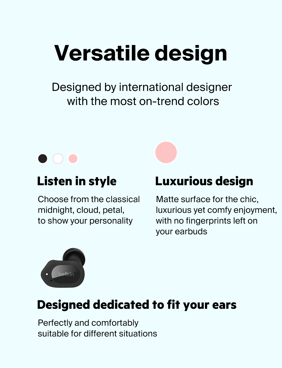 Add style to your daily audio adventures. Our True Wireless Earbuds offer 38 hours of high-quality listening, three EQ presets, and four fashionable color options to match your outfit, device, or mood.