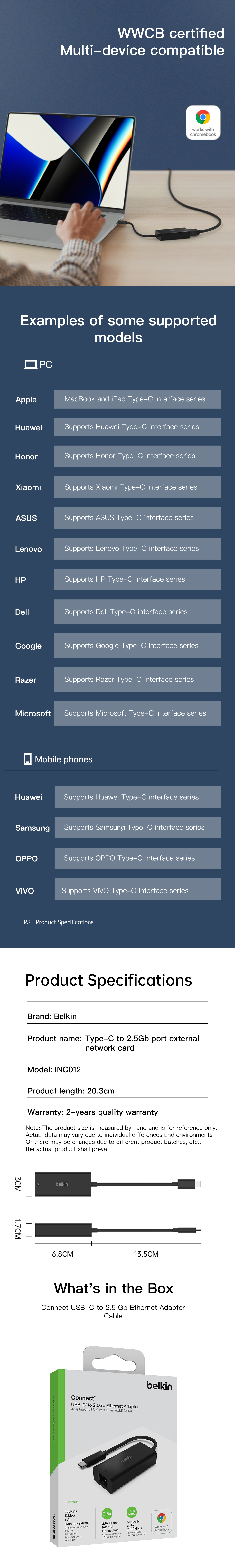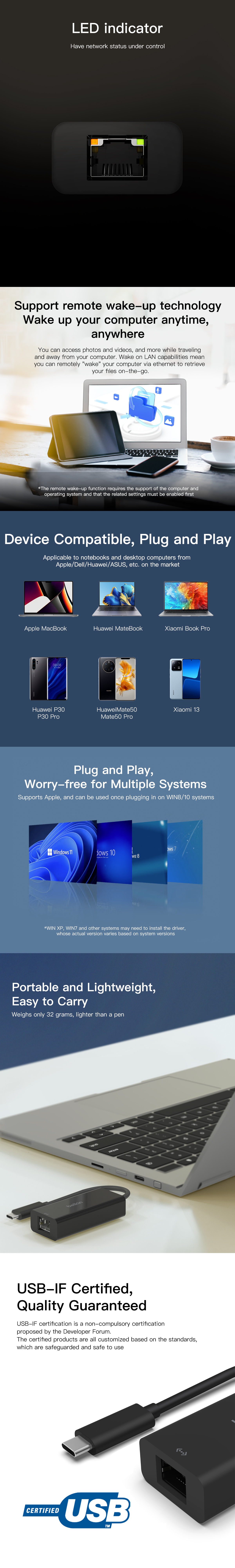 This compact adapter easily meets the demand for a stable and reliable network connection for gaming, streaming, and video conferencing. Works with most laptops, including Chromebooks and USB-C devices.
