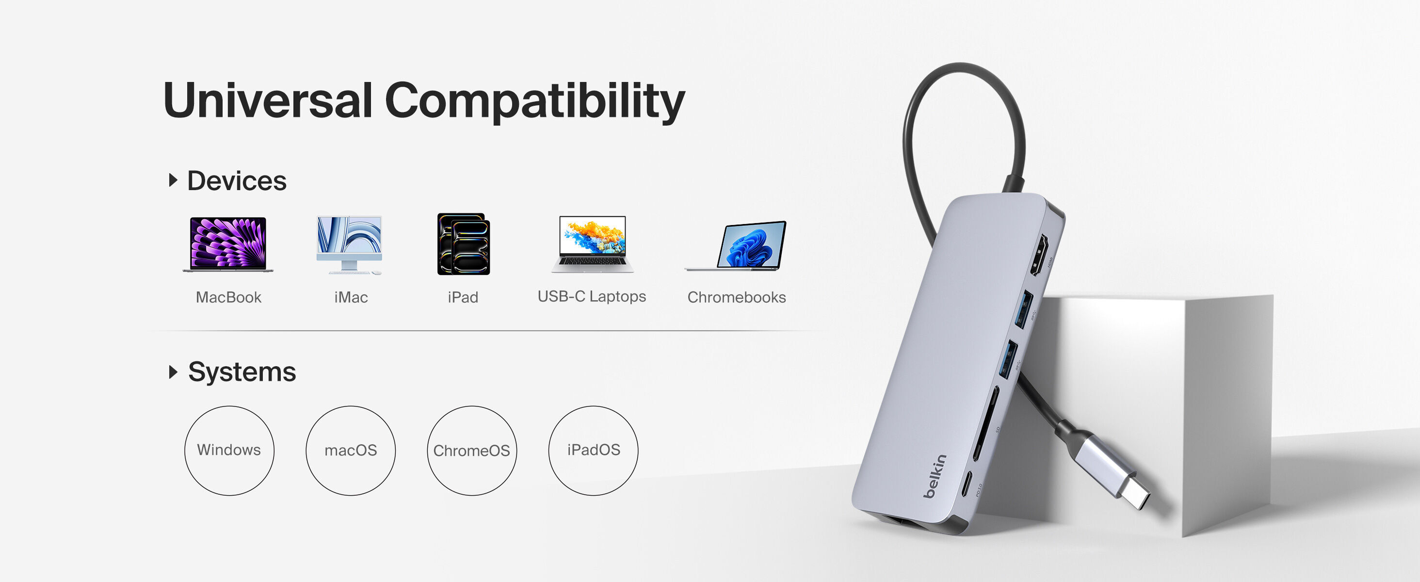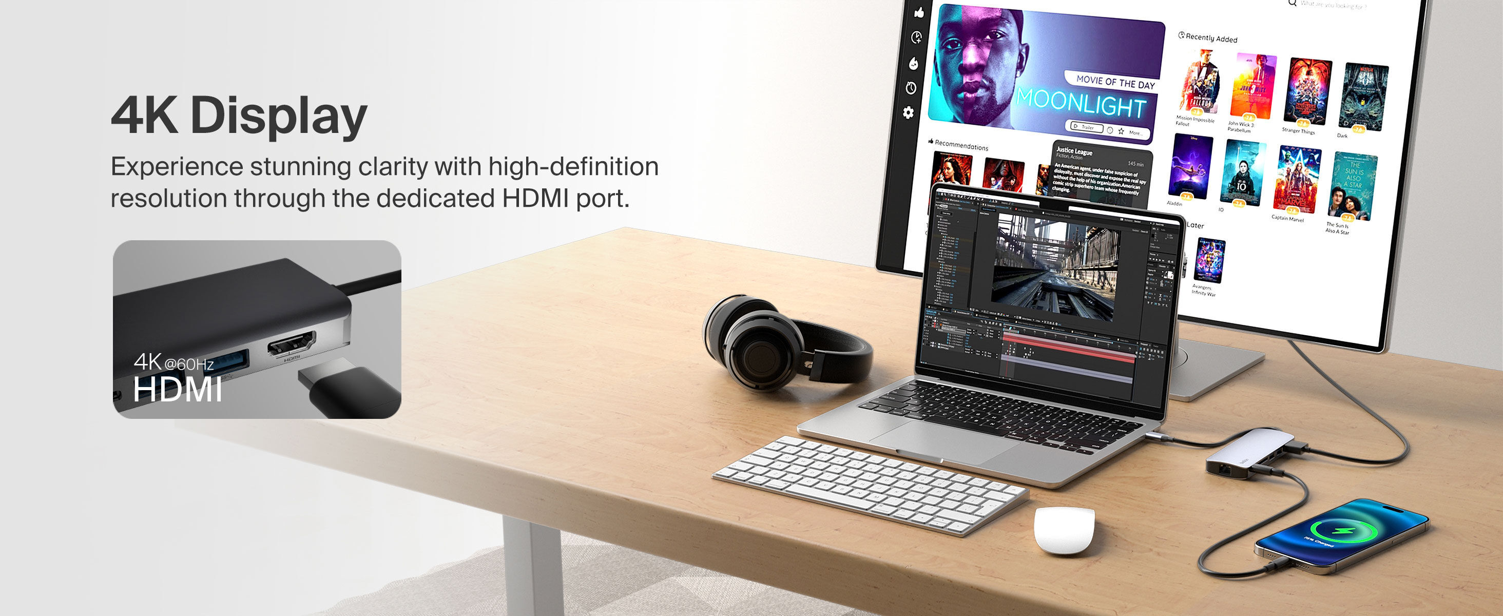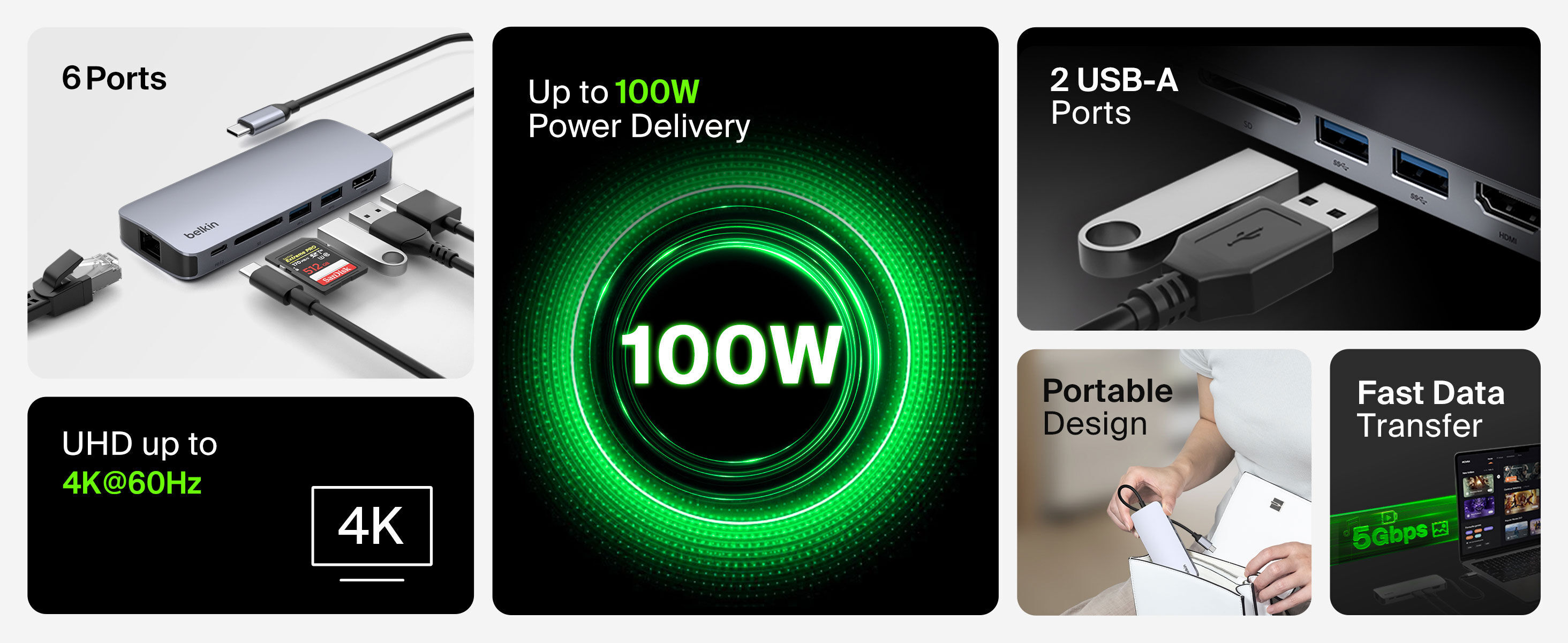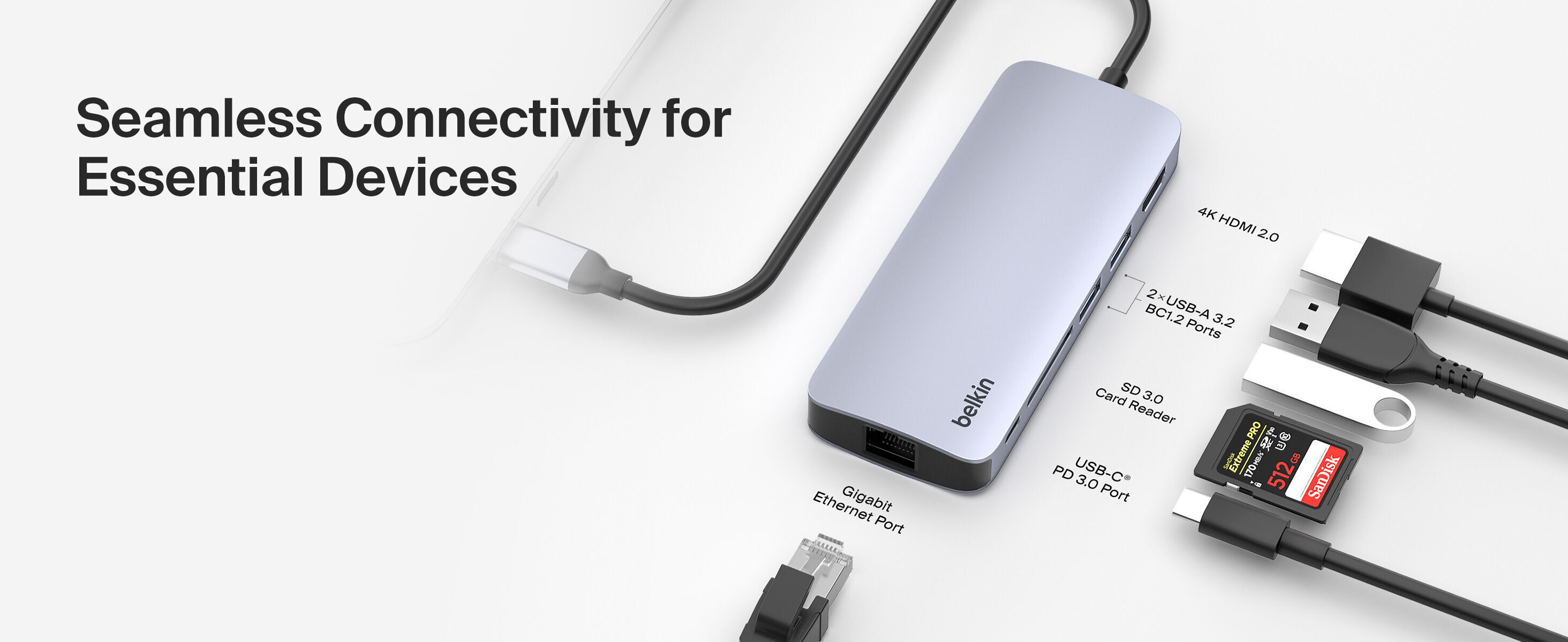 產品包含 4K HDMI 、SD 讀卡槽、1Gbps 乙太網路、USB-C PD 3.0 及 2 個 USB-A ,體積輕巧,功能強大。適用於含 USB-C 埠的裝置,如MacBook、Chromebook 或其他筆電。