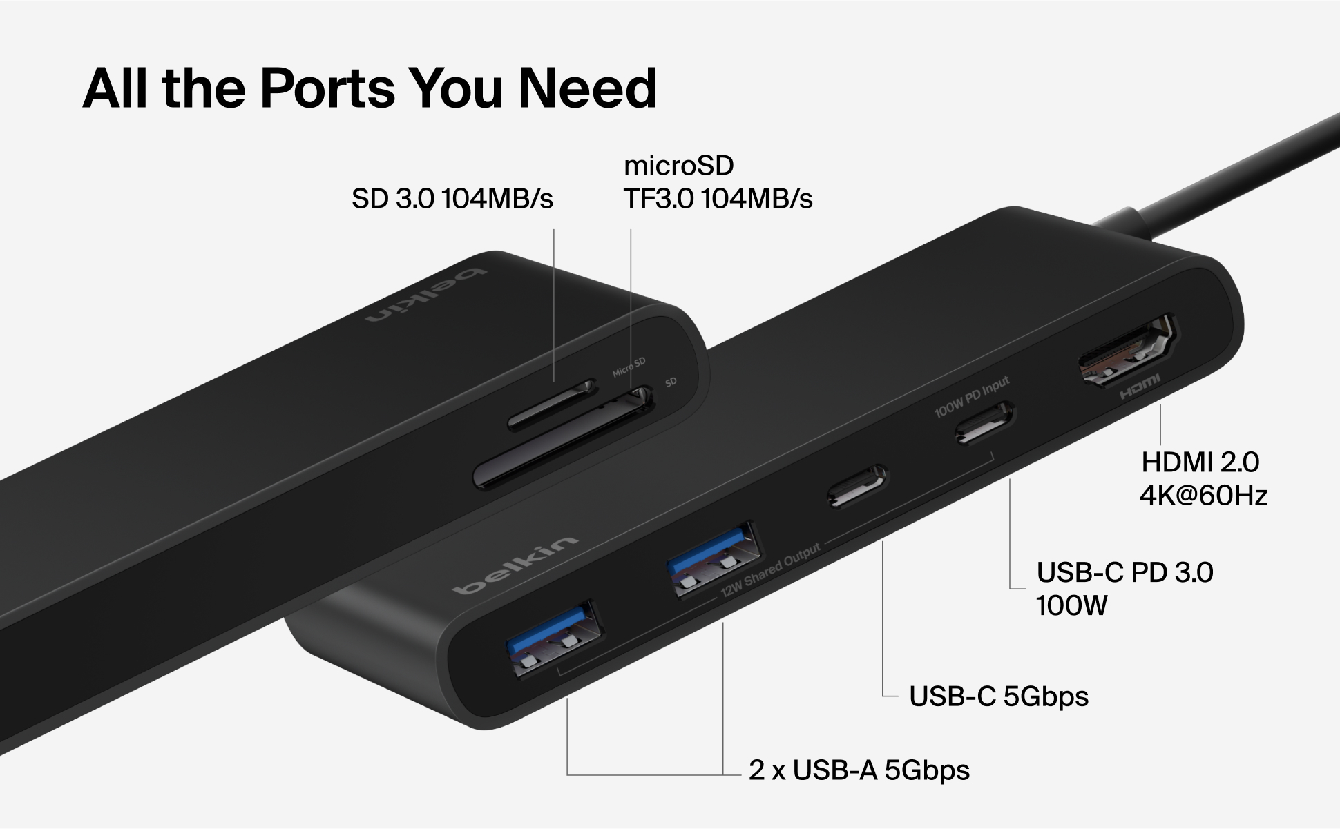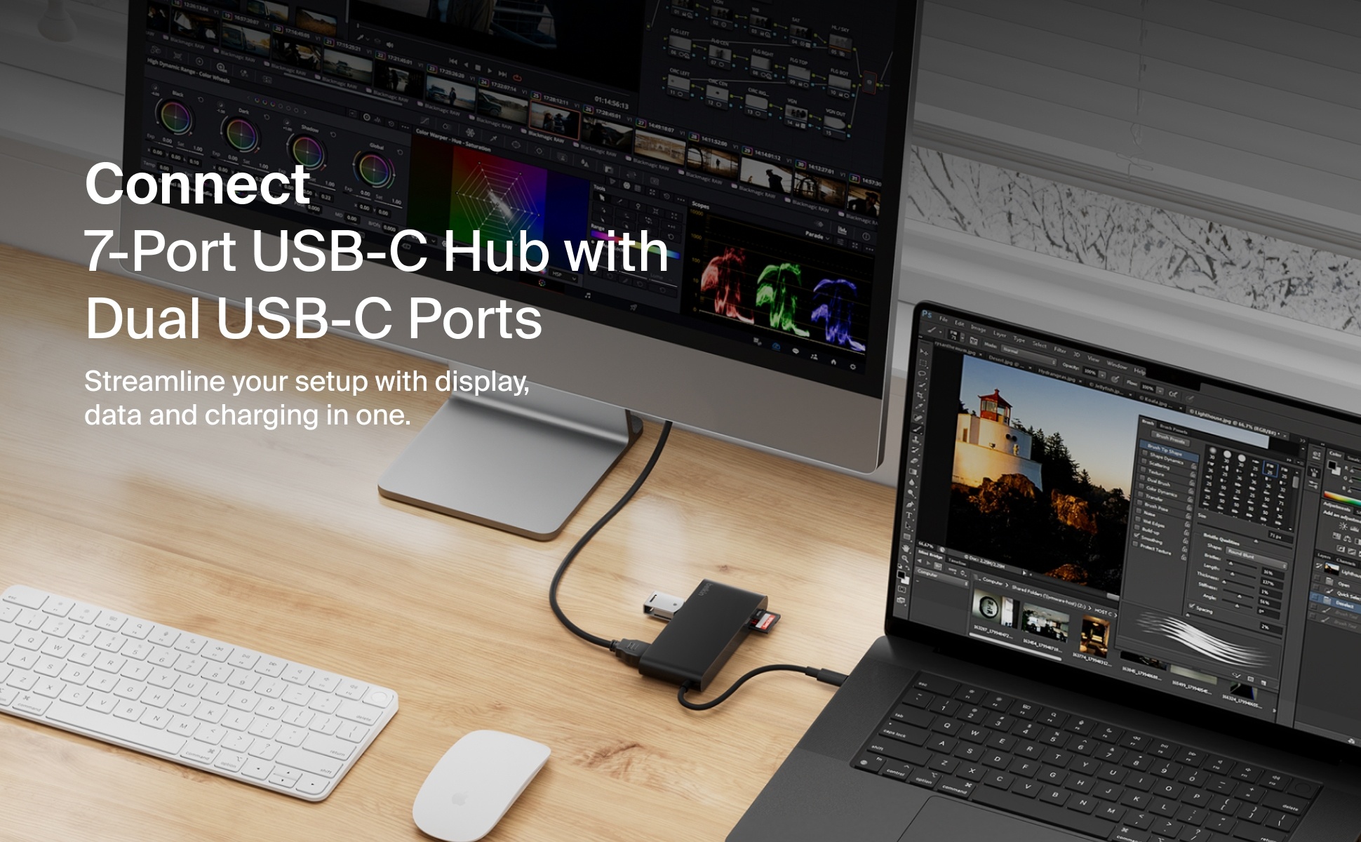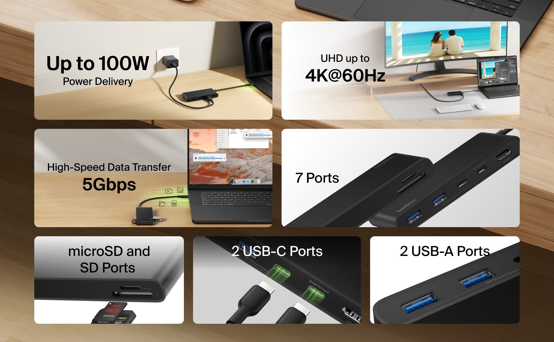 這款 USB-C 集線器可即時為筆記型電腦提供額外的 USB-C 與 USB-A 連接埠,輕鬆連接多達 7 個裝置,大幅提升工作效率,是內容創作者及專業人士的理想之選。配備升級版 HDMI 2.0†,為顯示器提供極致清晰的解像度;資料傳輸速度高達 5Gbps,確保資料傳輸迅捷;一個 USB-C 連接埠更支援高達 100W PD,為您的主機裝置快速充電。此外,這款 USB-C 集線器專為行動應用、辦公室或居家環境而設,無論身處何地,都能時刻維持高效無縫的連接體驗。