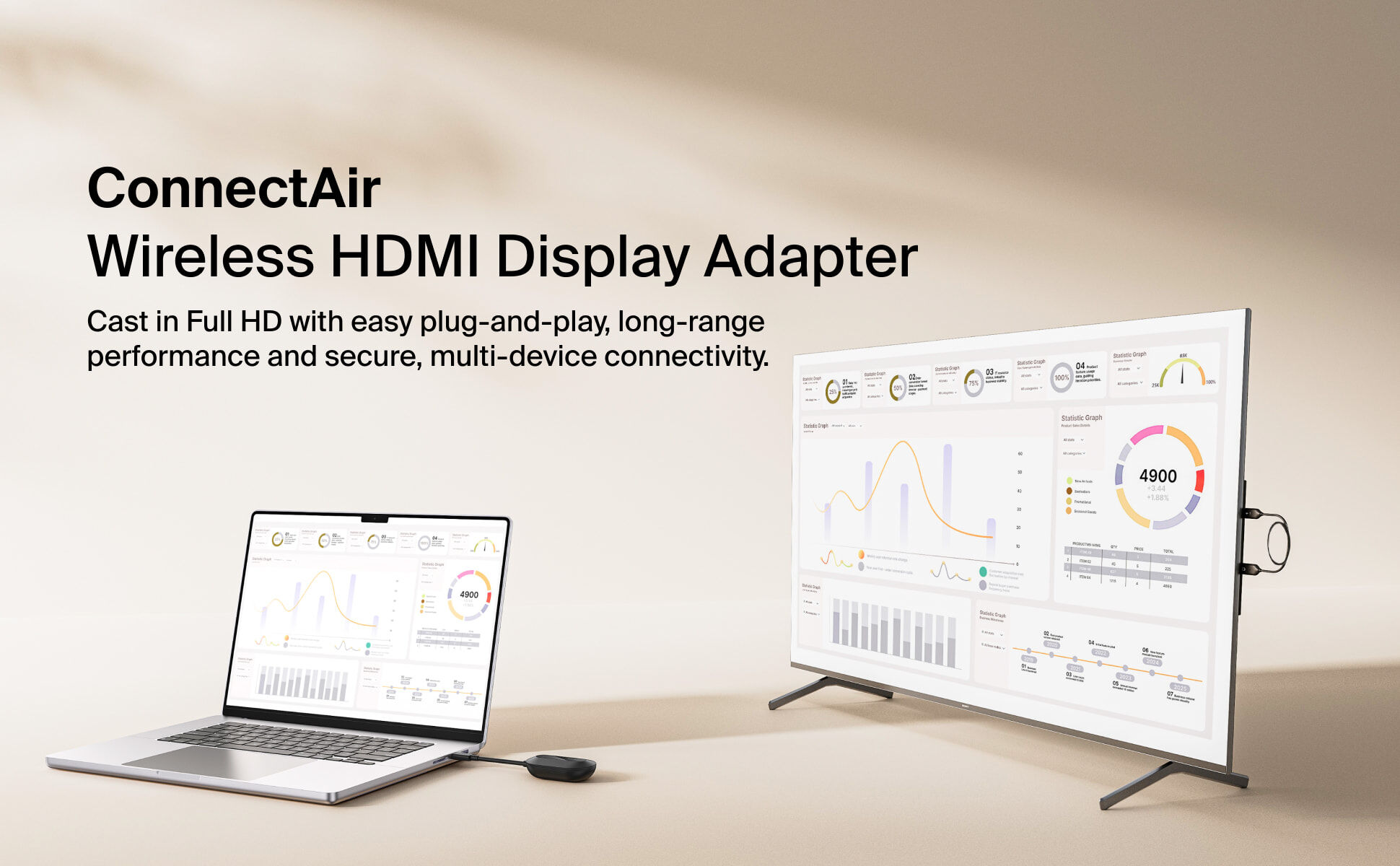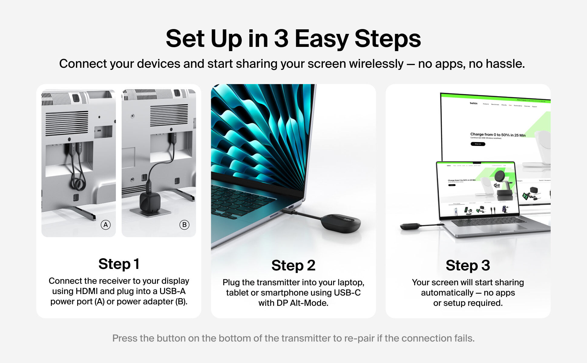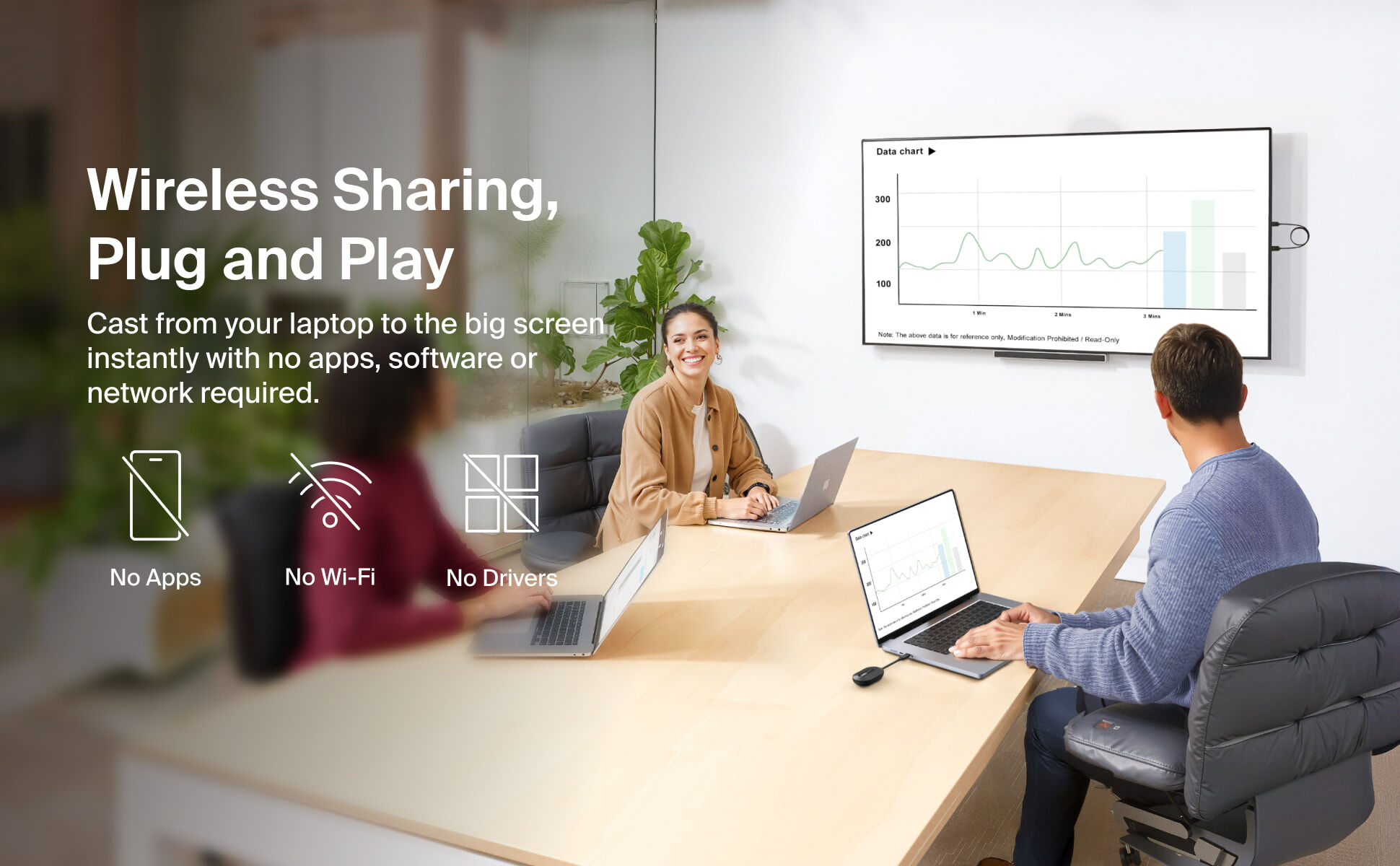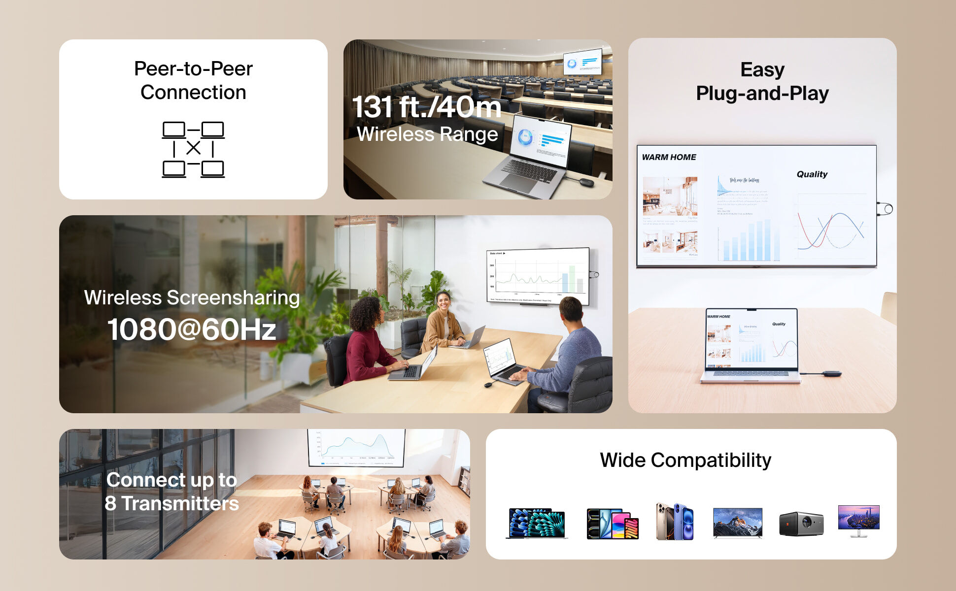 透過 USB-C 主機裝置進行無線鏡像或延伸顯示,專為會議室、教室等商務場景而設。支援筆記型電腦、平板與手機,讓簡報與內容分享更輕鬆。免除複雜設定,無需網路、Wi-Fi 或藍牙,即插即用,保持穩定連線。支援 HDMI† 顯示器,提供高達 1080p@60Hz 的極致清晰解像度,並具備最遠 40 米的傳輸範圍,讓您暢享靈活體驗,隨時展現專業效能。
