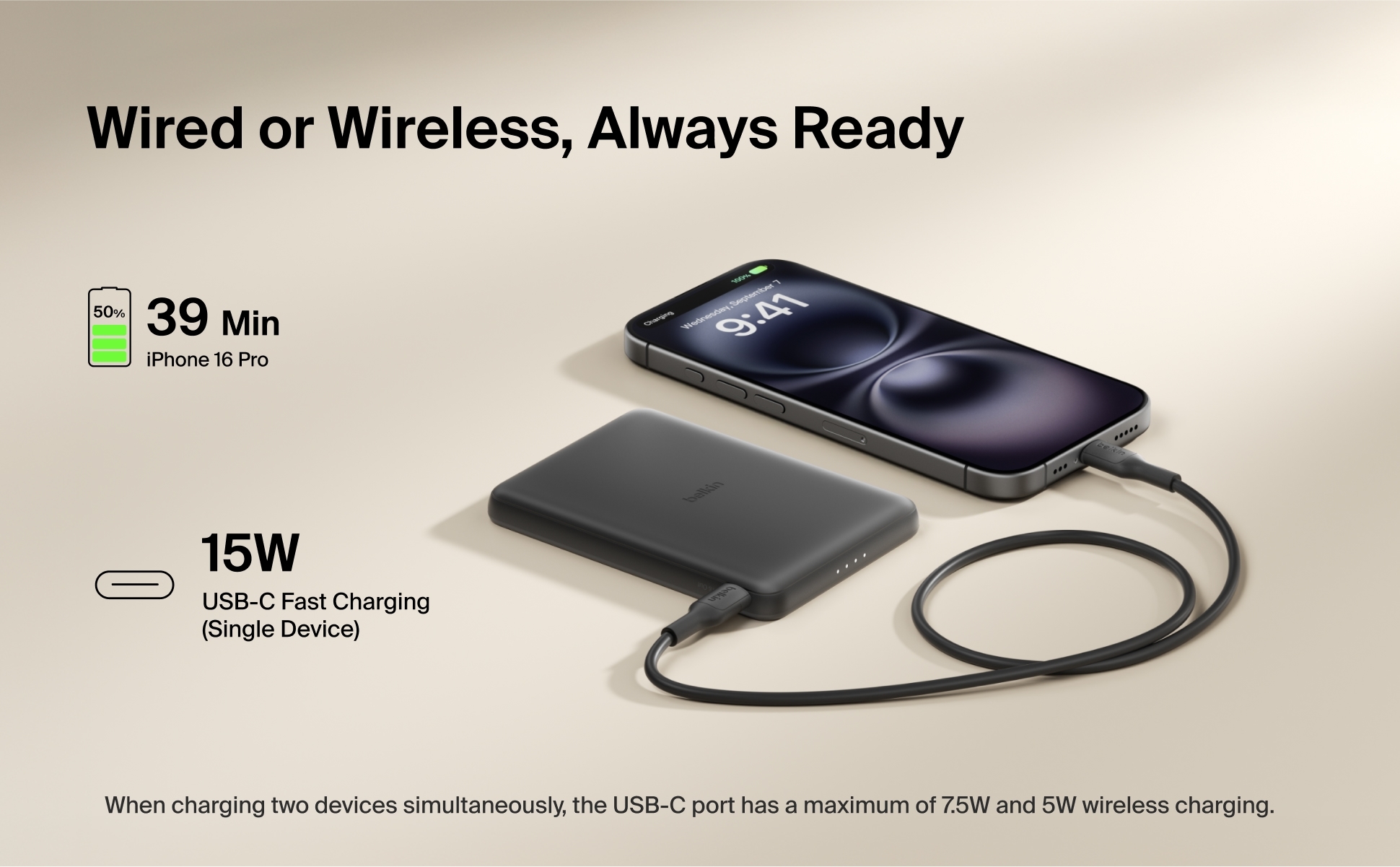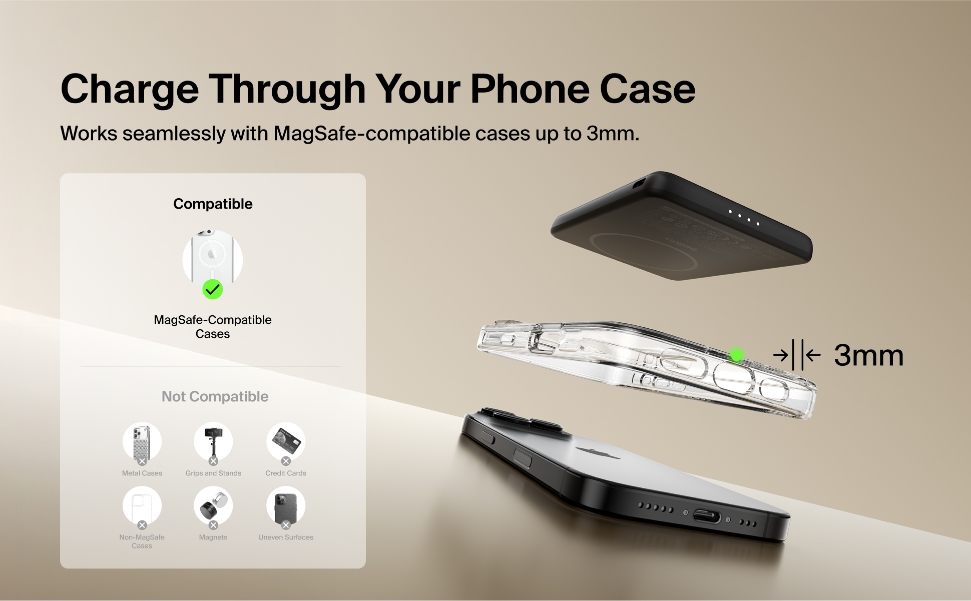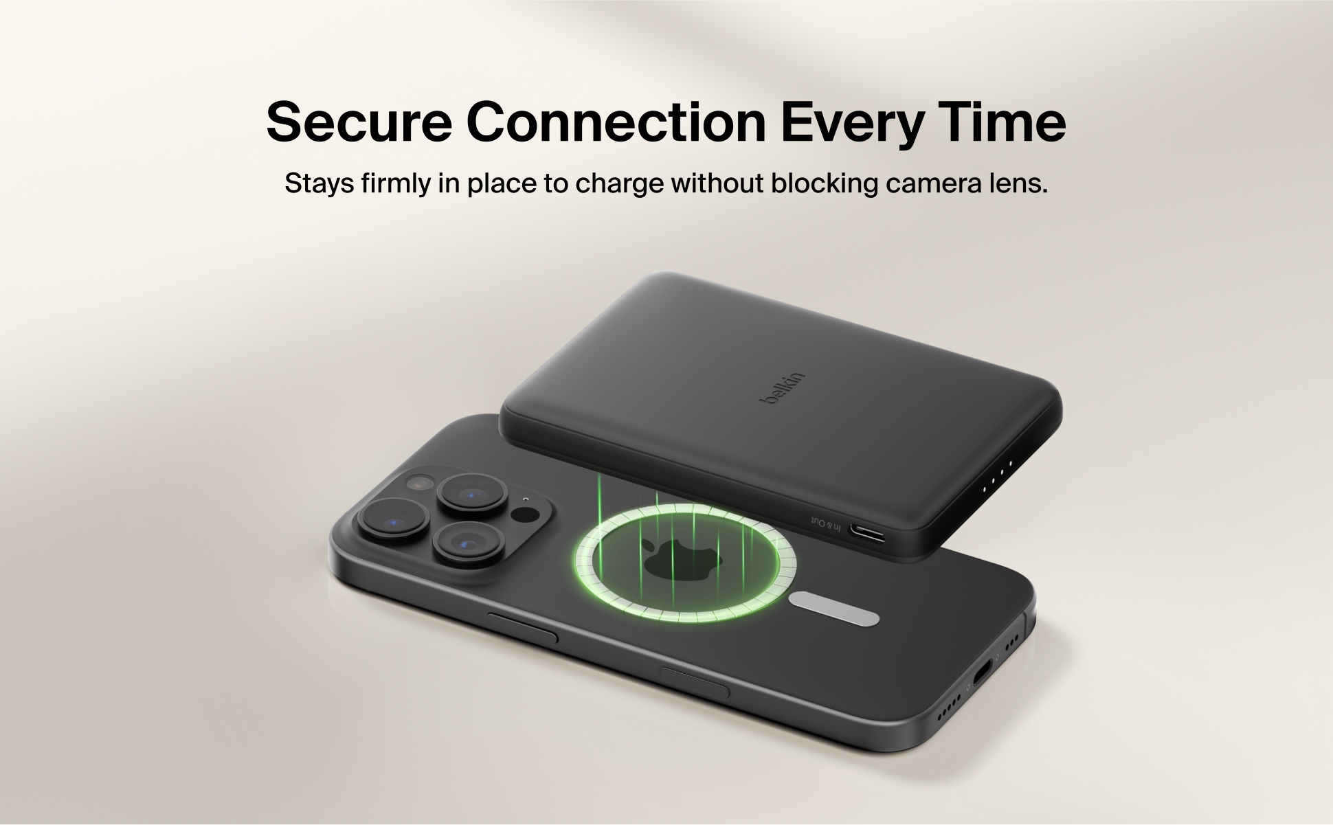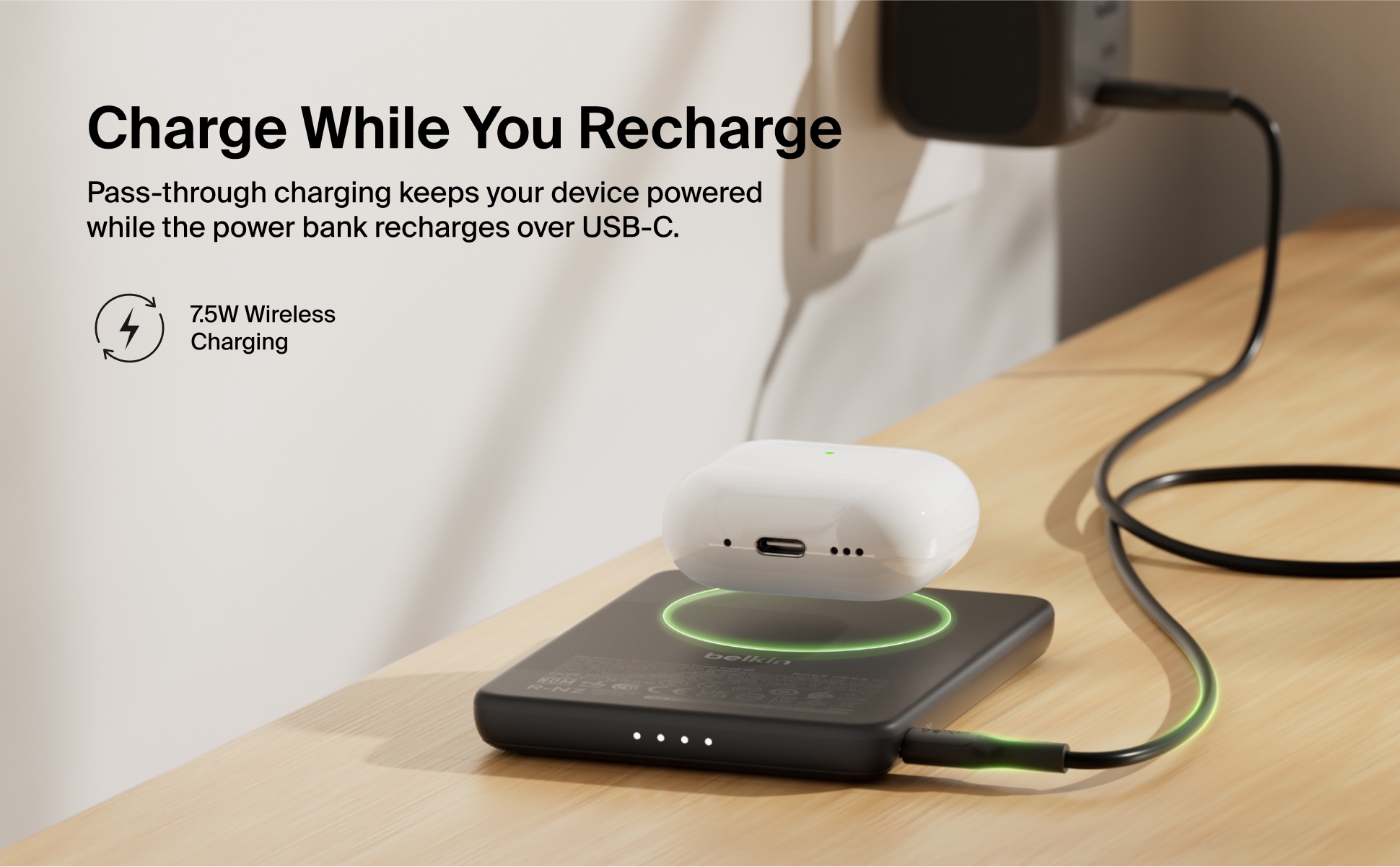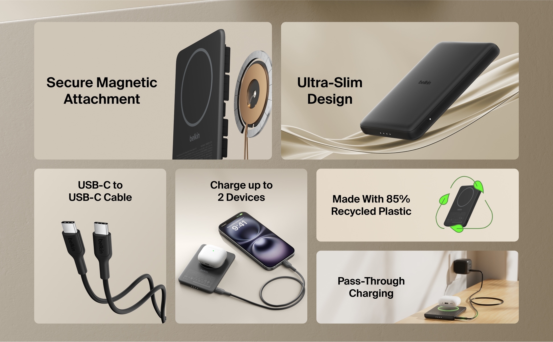 這款纖薄小巧的 7.5W 無線行動電源,讓電力隨時隨地保持充沛。即使磁吸在手機上,也能輕鬆放入口袋。透過磁吸充電板和 USB-C 連接埠,即可同時為兩個裝置充電。此外,行動電源符合 TSA 手提攜帶規範,讓您旅行時安心無虞。