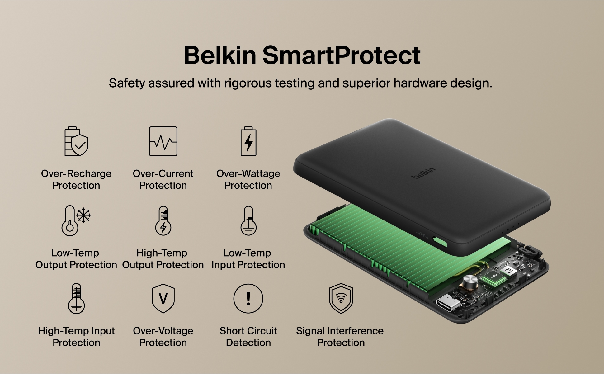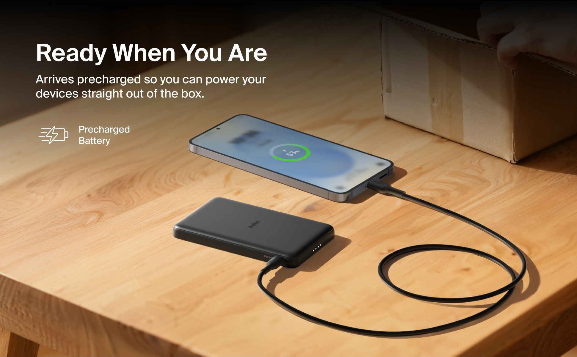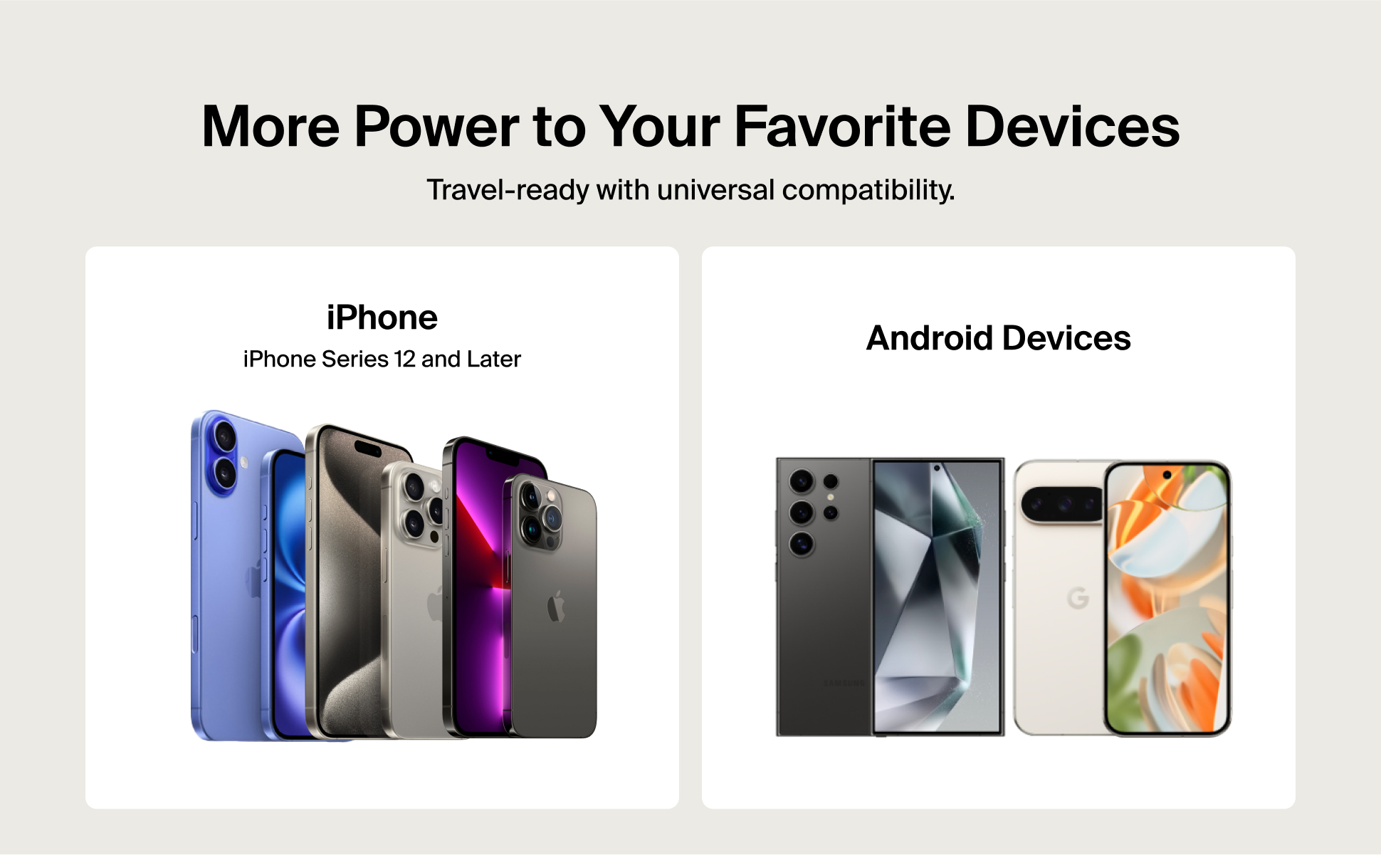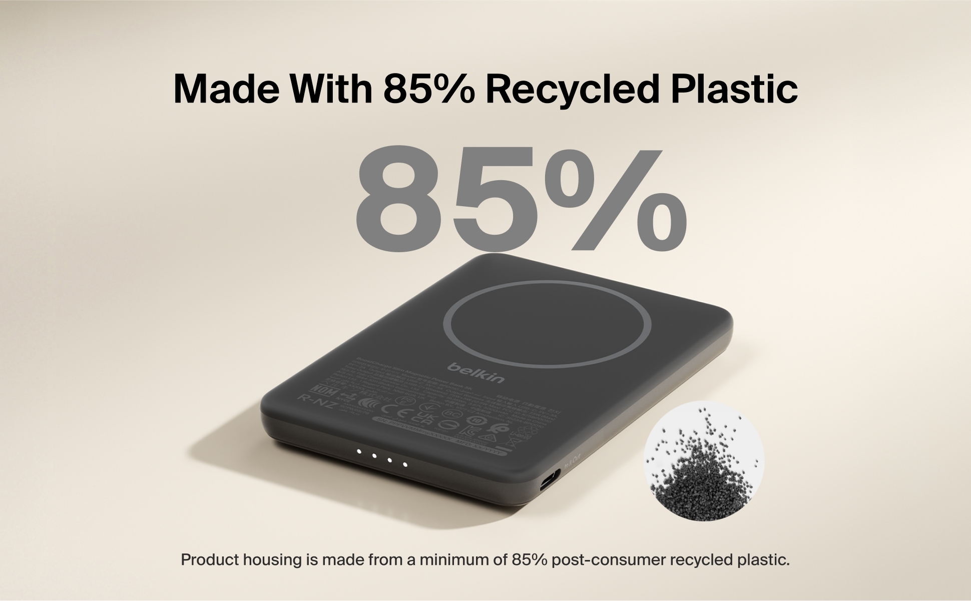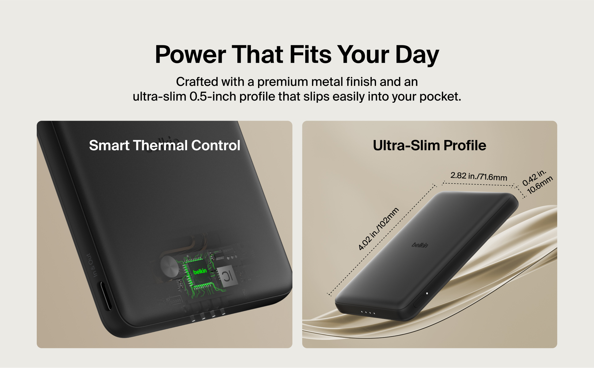 這款纖薄小巧的 7.5W 無線行動電源,讓電力隨時隨地保持充沛。即使磁吸在手機上,也能輕鬆放入口袋。透過磁吸充電板和 USB-C 連接埠,即可同時為兩個裝置充電。此外,行動電源符合 TSA 手提攜帶規範,讓您旅行時安心無虞。