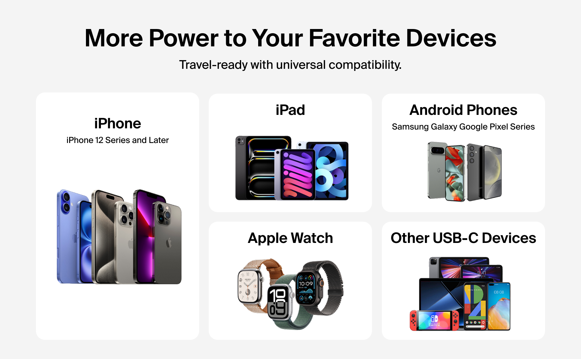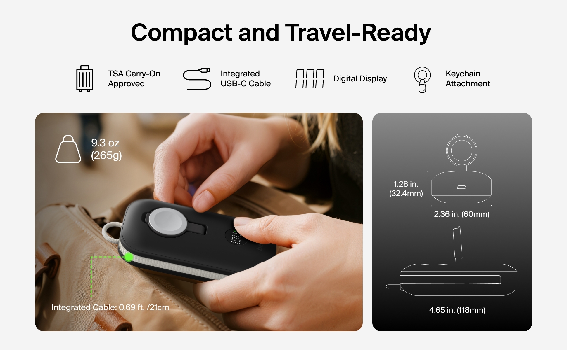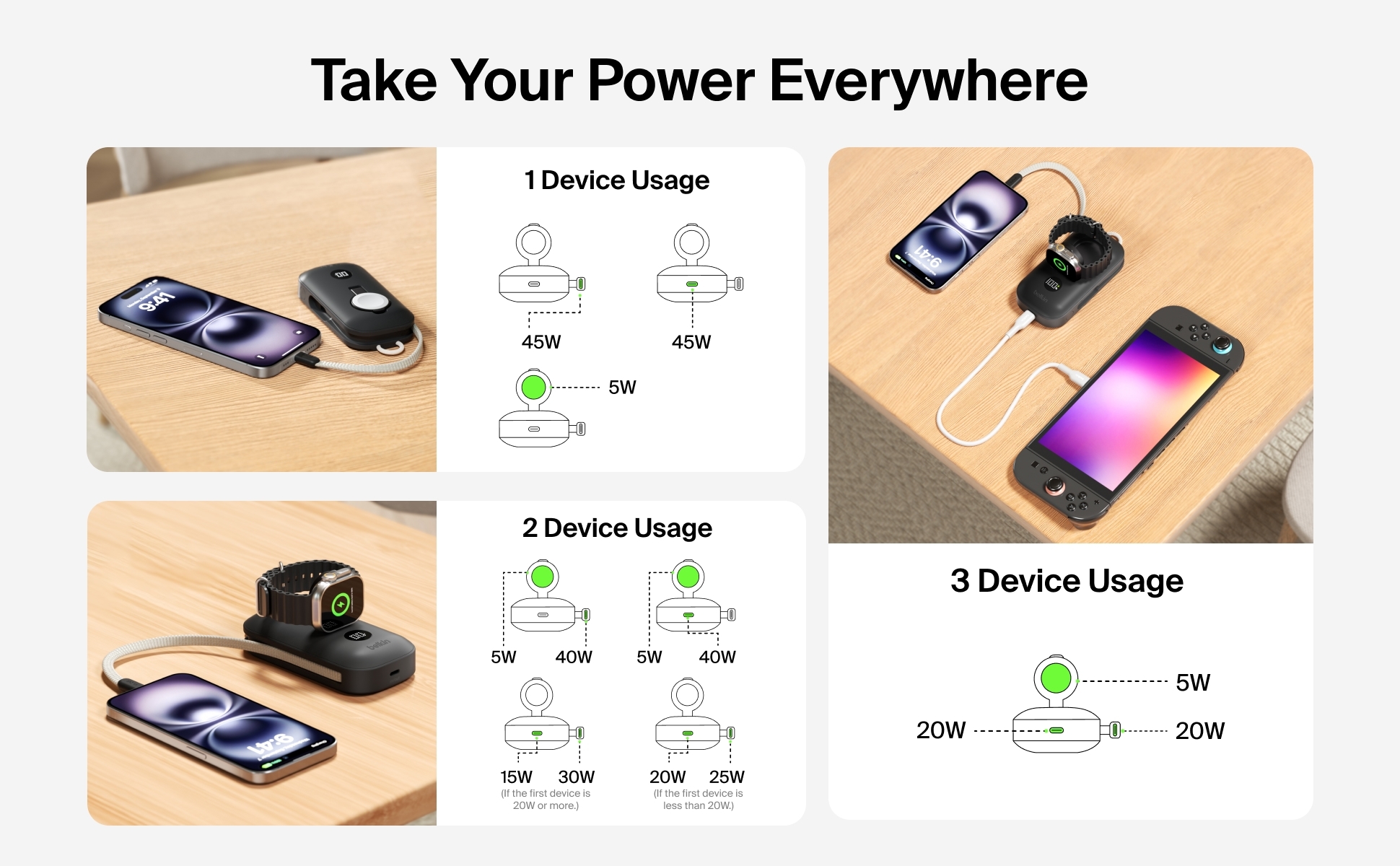 使用這款輕巧的 3合1 行動電源,同時為 iPhone、Apple Watch 以及任何 USB-C 裝置快速充電。配備 Apple Watch 充電器、內置 USB-C 充電線與額外 USB-C 連接埠,無論是智能手機還是遊戲主機,出門在外都能隨時充電。行動電源由再生物料製成,展現環保理念;並搭載螢幕顯示器與掛圈設計,讓出行更方便。