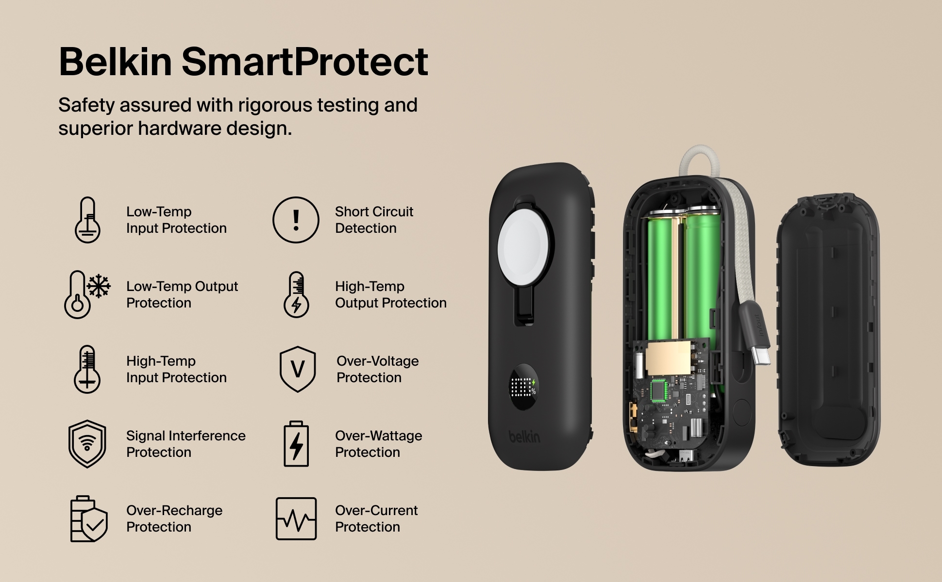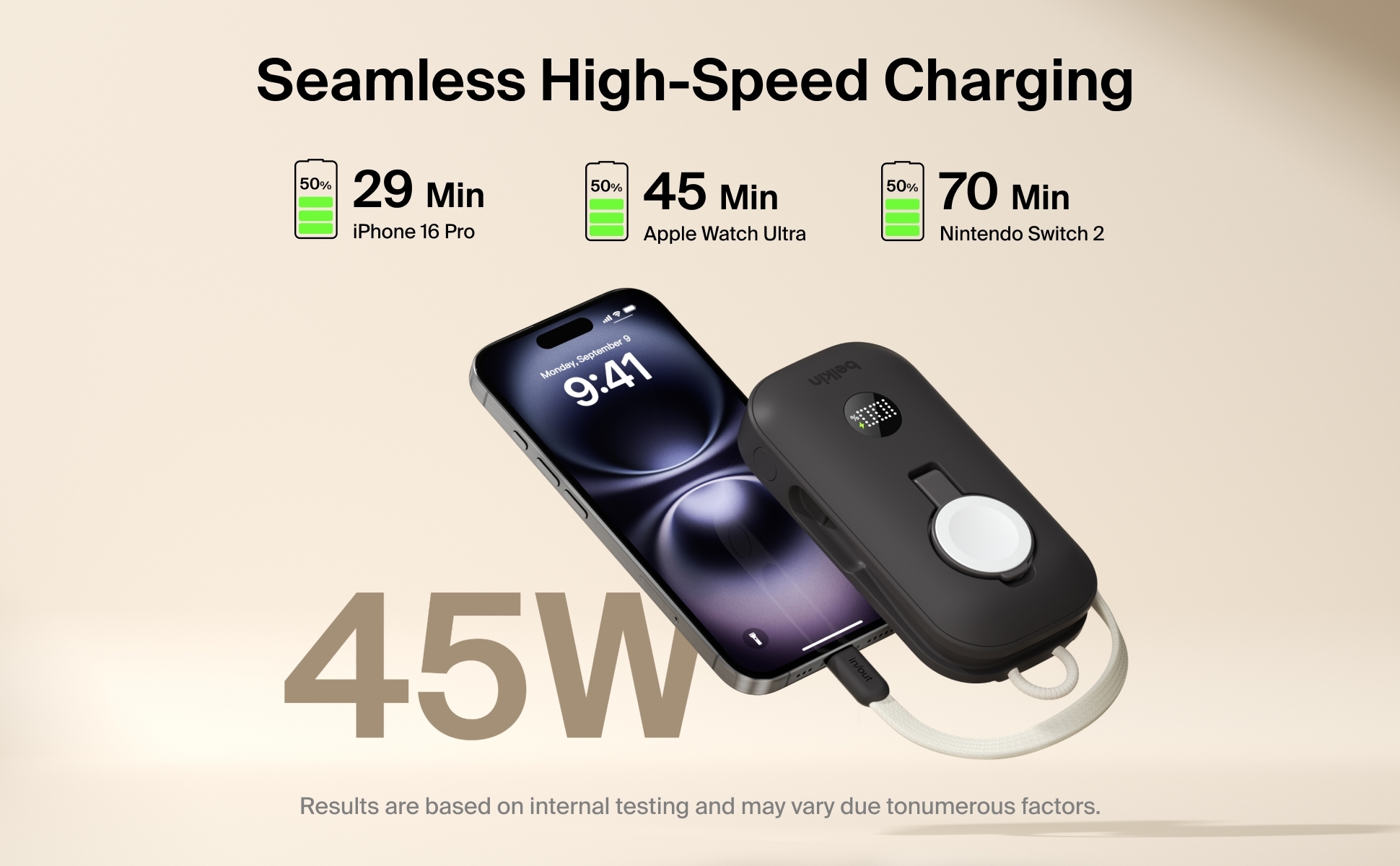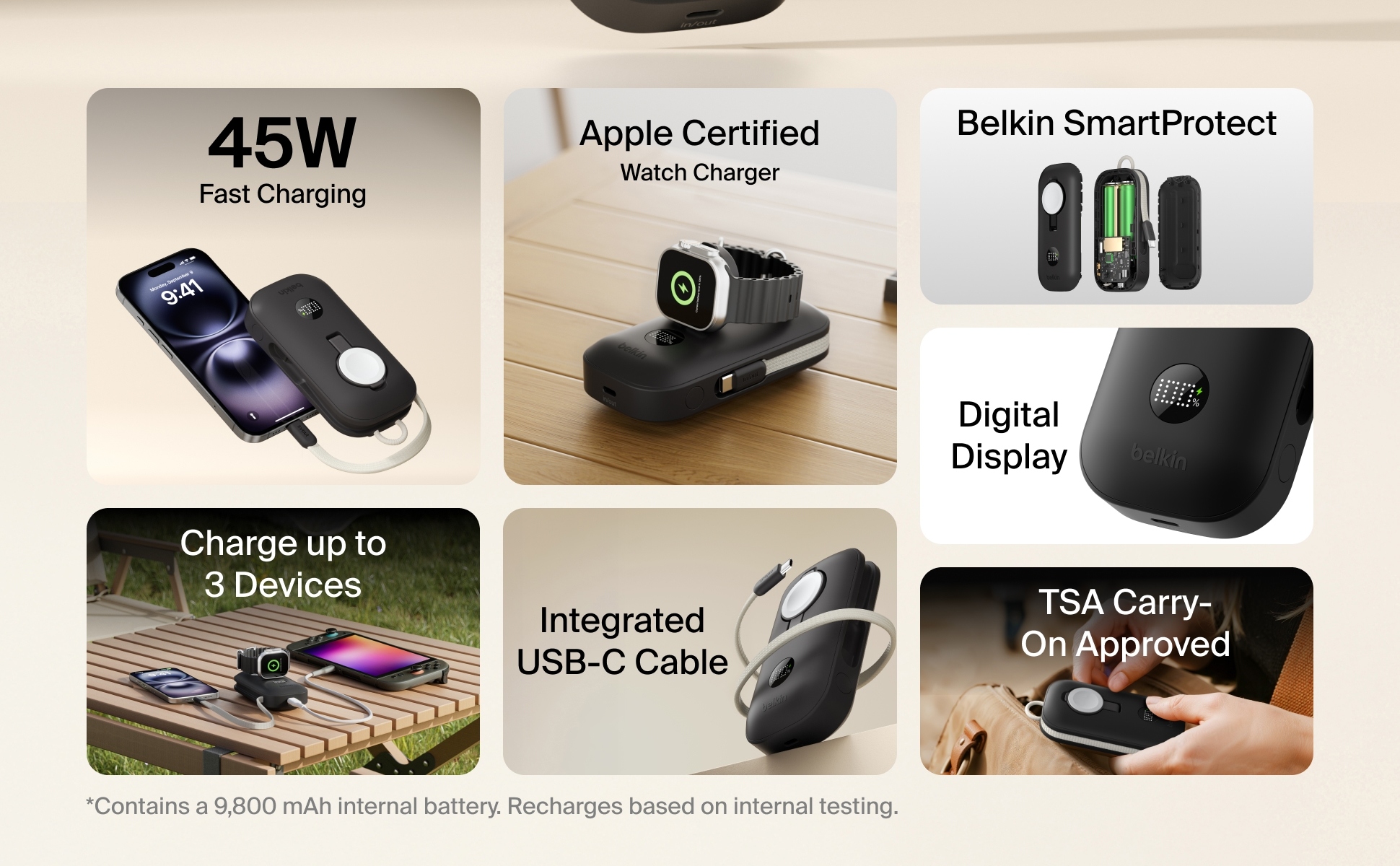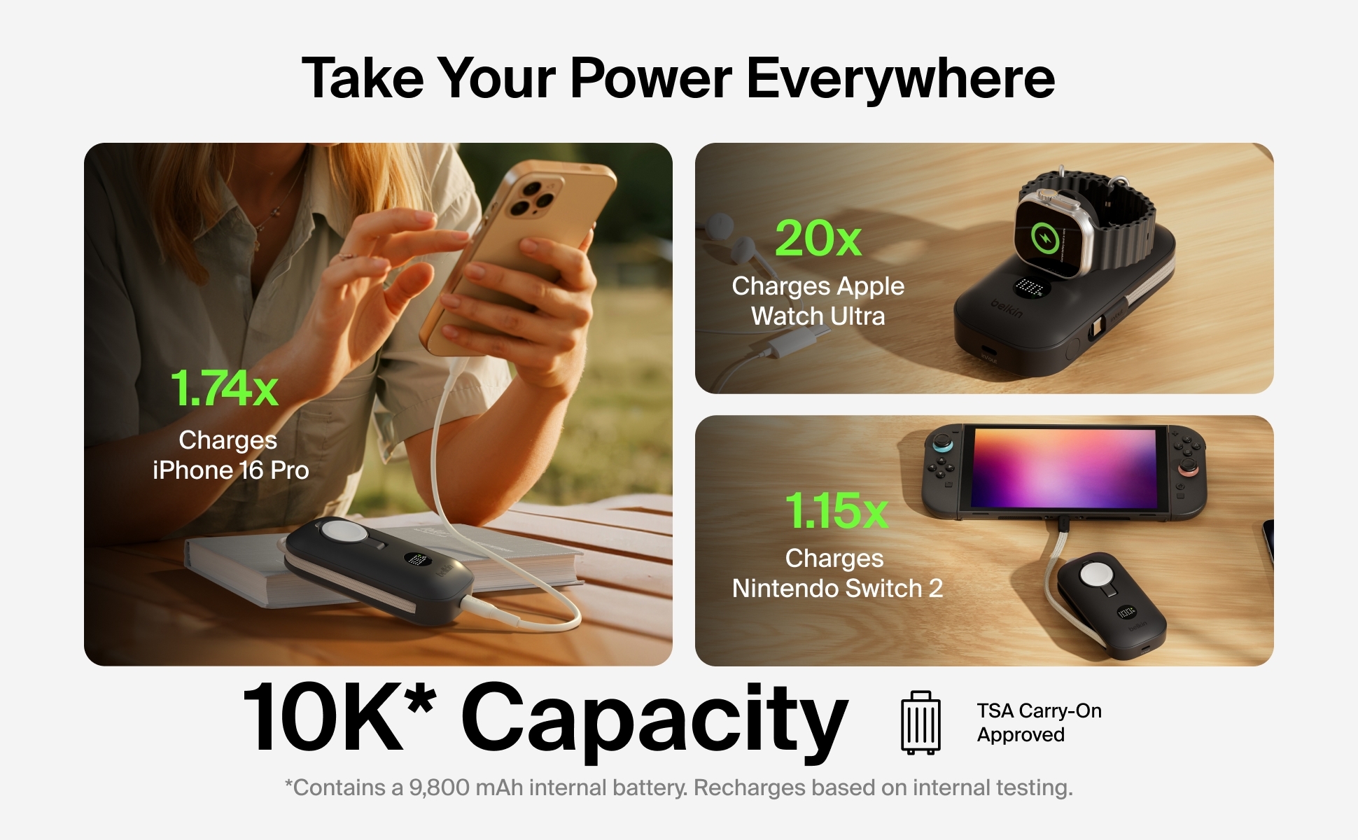 使用這款輕巧的 3合1 行動電源,同時為 iPhone、Apple Watch 以及任何 USB-C 裝置快速充電。配備 Apple Watch 充電器、內置 USB-C 充電線與額外 USB-C 連接埠,無論是智能手機還是遊戲主機,出門在外都能隨時充電。行動電源由再生物料製成,展現環保理念;並搭載螢幕顯示器與掛圈設計,讓出行更方便。