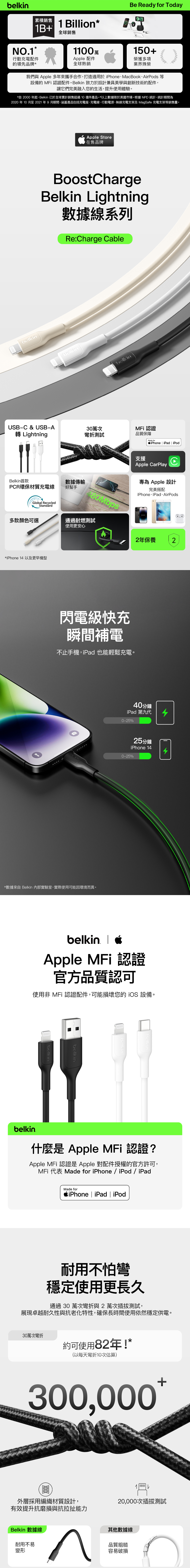 這款 USB-C 轉 Lightning 編織連接線兼具快速充電效能及卓越耐用性,且由回收材料製成*。只需 25 分鐘,即可將 iPhone 14 從 0% 充電至 50%†,並提供多種尺寸選擇,滿足居家或外出時的充電需求。