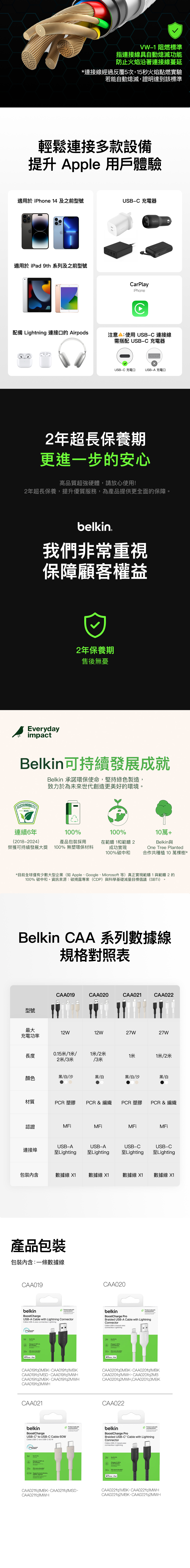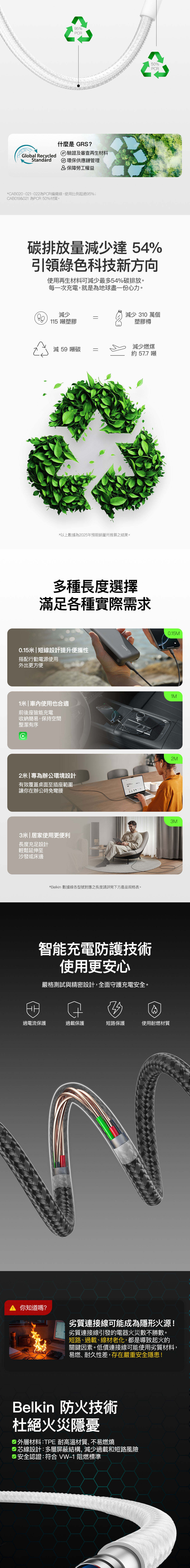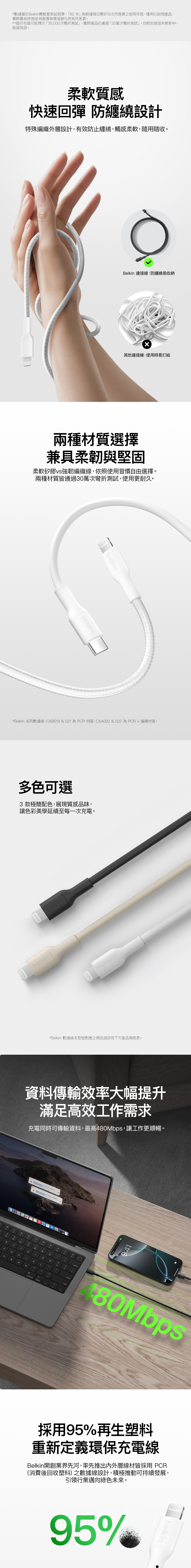 • 連接線外層編織層由 95% PCR PET 製成,接頭與外層護套含 50% PCR TPE ,有助減少塑膠廢料,且不會影響充電效能