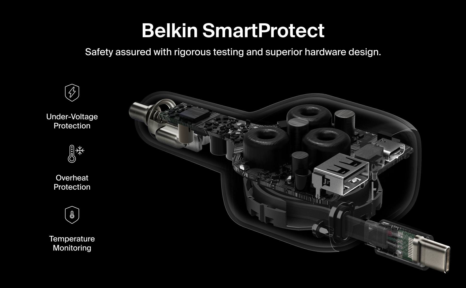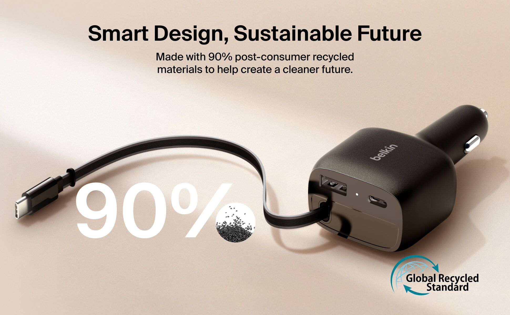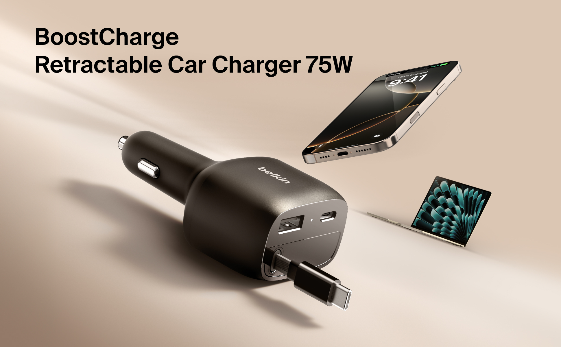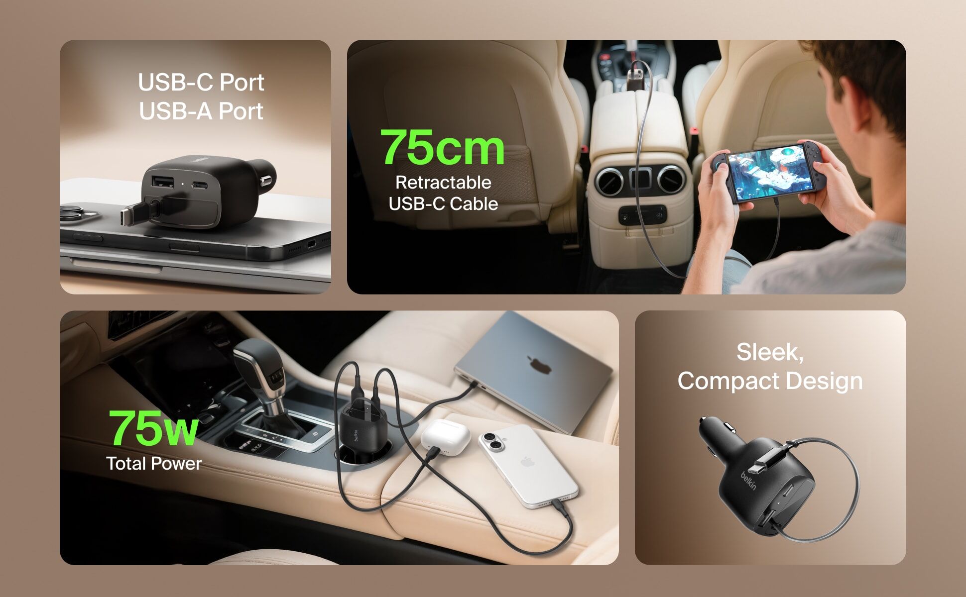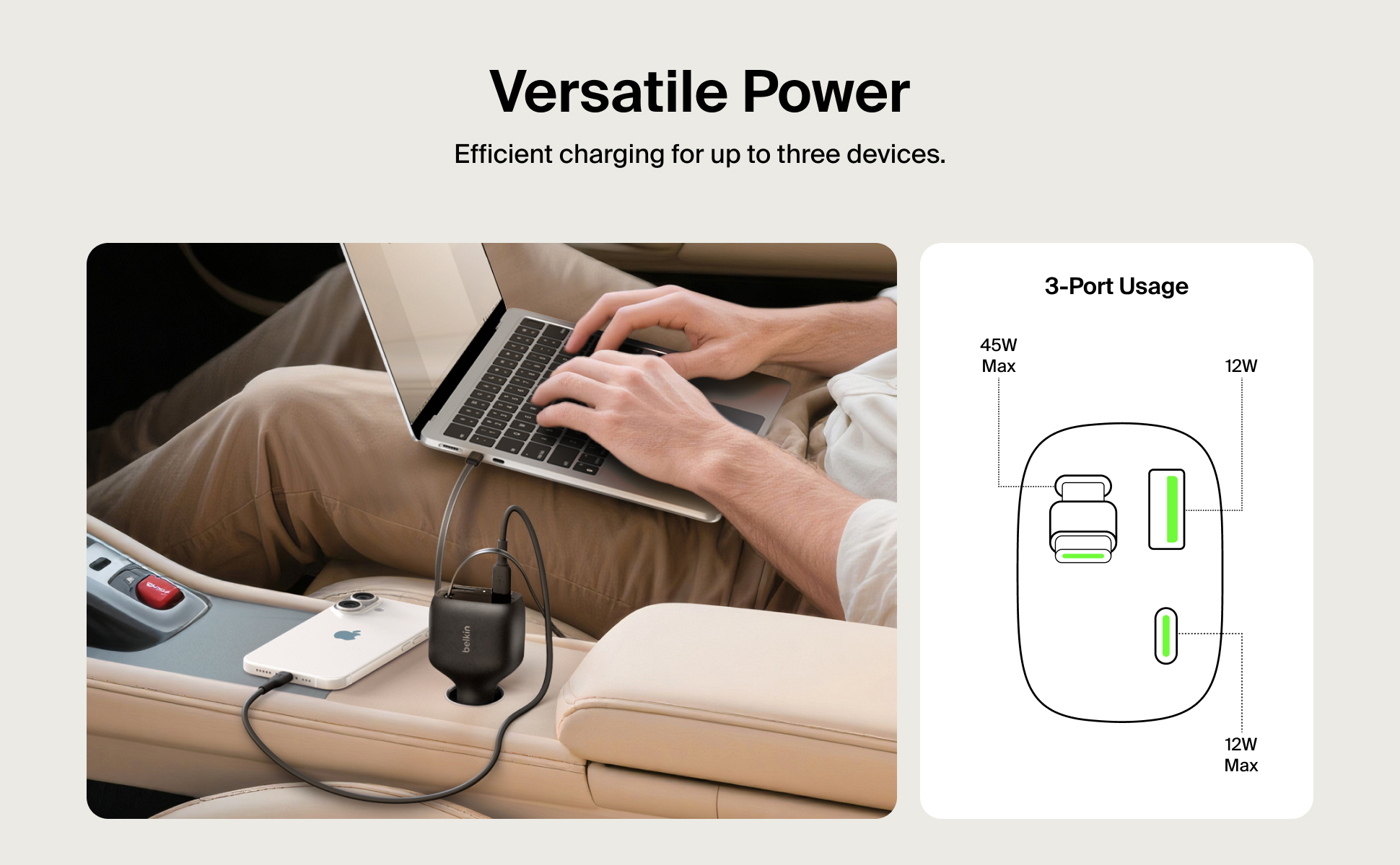這款車用充電器配備 USB-C 和 USB-A 雙連接埠,並巧妙整合一條可伸縮的 USB-C 連接線,徹底革新您的車載充電體驗。內建的 75 厘米防纏繞連接線能提供最高 60W 輸出,滿足市面上大部分手提電腦的充電需求。憑藉此配置,充電器可同時為三部裝置快速充電:包括您的 iPhone 或 Samsung Galaxy,以及另外兩部 USB-C 或 USB-A 裝置。 透過動態功率分配技術,確保充電器高效運作,為所有連接裝置提供最佳電力輸出。