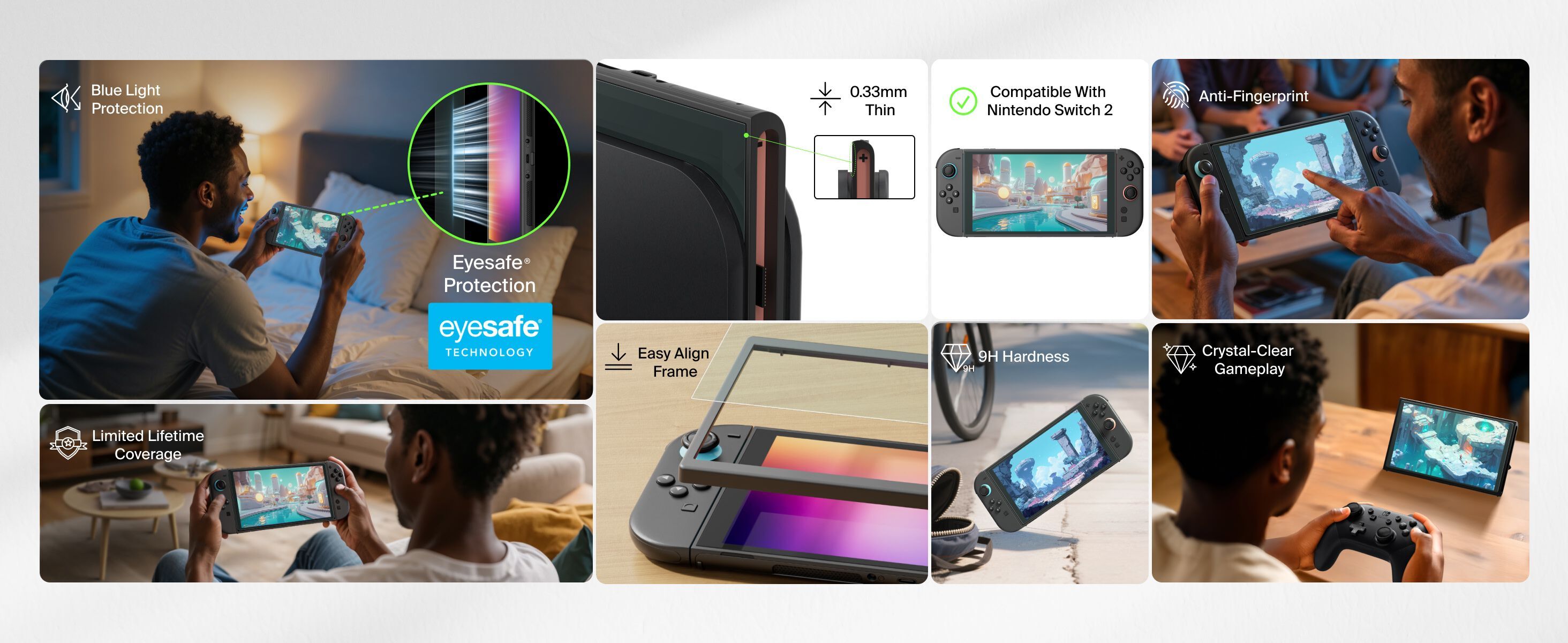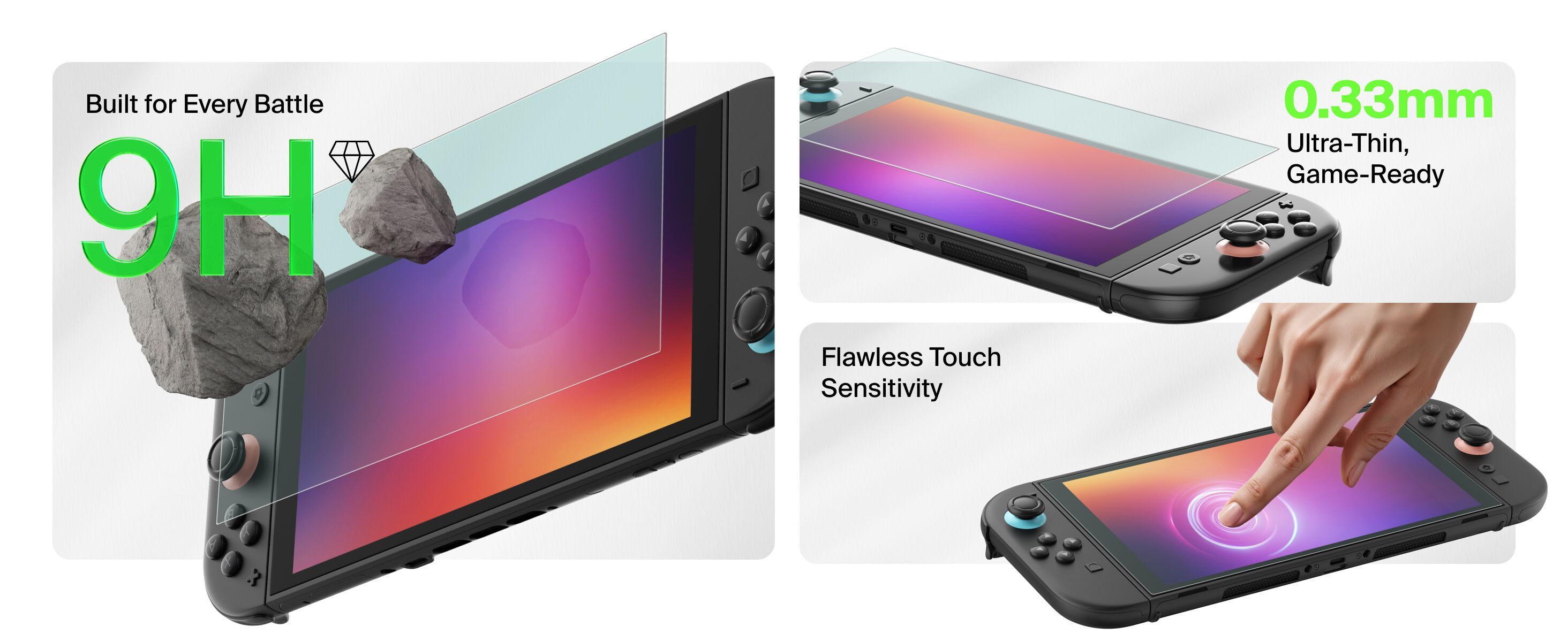 選擇 ScreenForce TemperedGlass 濾藍光鋼化玻璃螢幕保護貼,守護您的 Nintendo Switch 2。