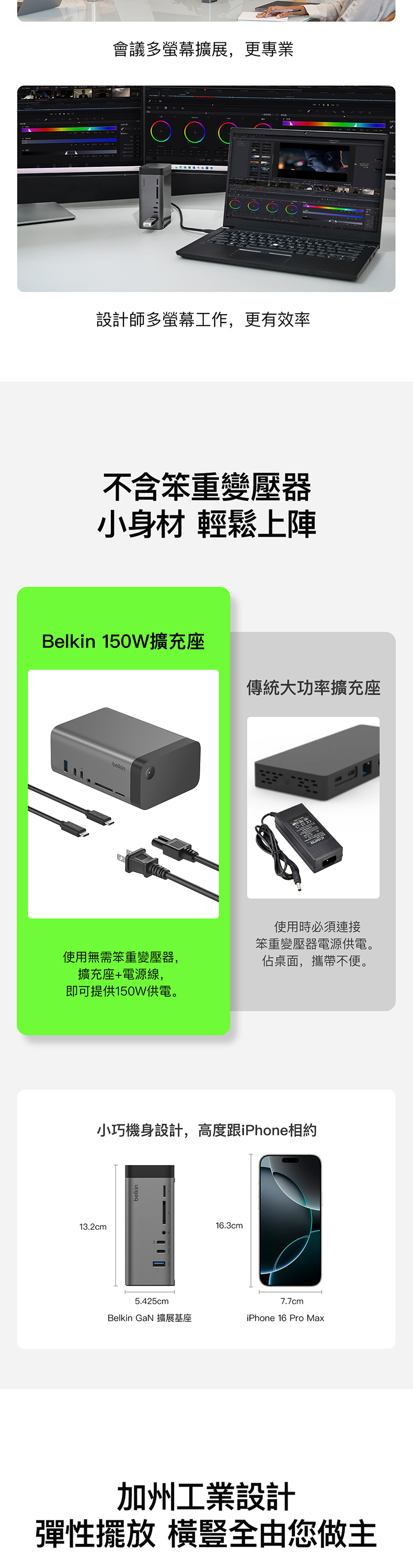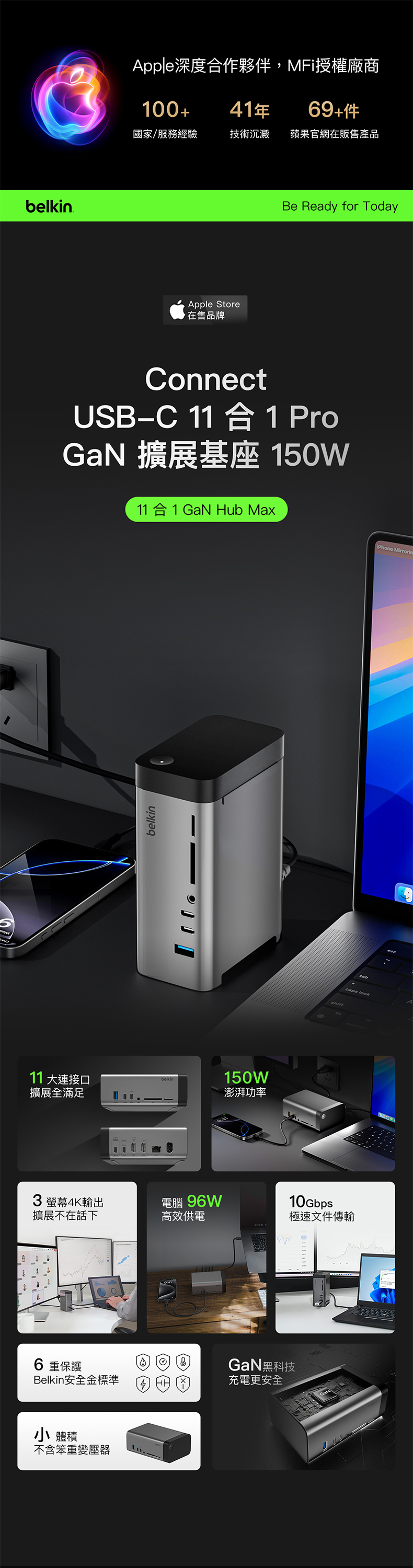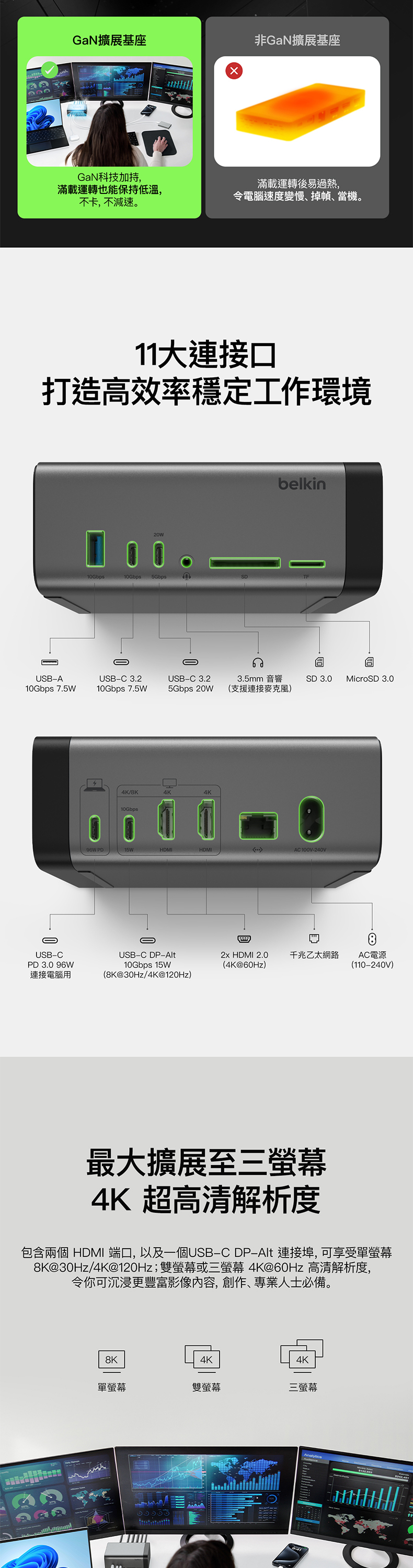 這款 USB-C 擴展基座採用 GaN 技術,能提供更快速、更有效率的充電體驗,為您的裝置即時充電。11 個連接埠提供電源、資料傳輸、儲存、視訊、音訊和以太網等多媒體連接功能;而支援三顯示器 (適用於 Windows OS) 的特點更備受創作者推崇,其小巧設計也可令工作環境更加簡潔。擴展基座內置纜線,您不必再攜帶笨重的電源,就能獲得兩位數的連接能力。