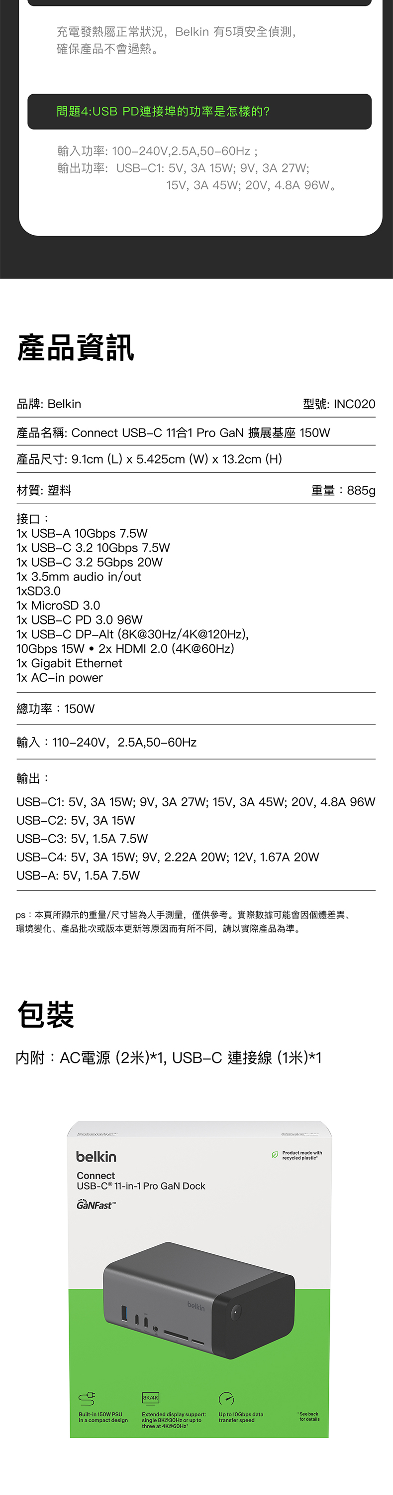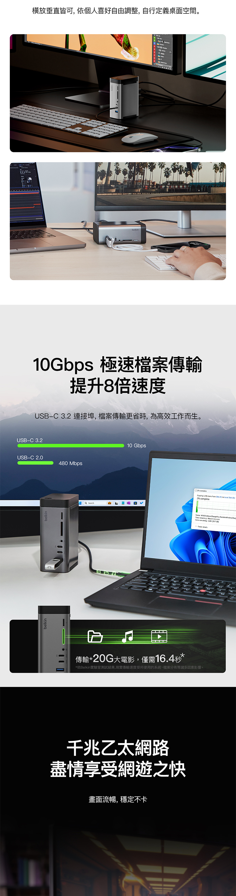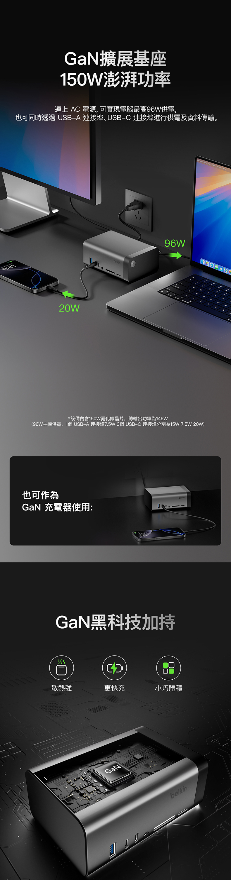 這款 USB-C 擴展基座採用 GaN 技術,能提供更快速、更有效率的充電體驗,為您的裝置即時充電。11 個連接埠提供電源、資料傳輸、儲存、視訊、音訊和以太網等多媒體連接功能;而支援三顯示器 (適用於 Windows OS) 的特點更備受創作者推崇,其小巧設計也可令工作環境更加簡潔。擴展基座內置纜線,您不必再攜帶笨重的電源,就能獲得兩位數的連接能力。