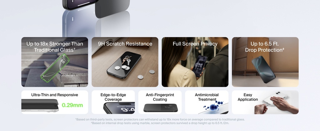 獲得出色的螢幕保護以及全螢幕私隱濾鏡‡,增加安全性。 離子交換技術讓 InvisiGlass 的強韌度比鋼化玻璃高出 62%。*我們的螢幕保護貼經過精心設計,外觀和觸感與您的原有螢幕相似,可防撞擊、刮傷、破裂、髒污、指紋等。以 60% 消費後再生 (PIR) 物料製成,†賦予廢玻璃新生命,避免浪費。