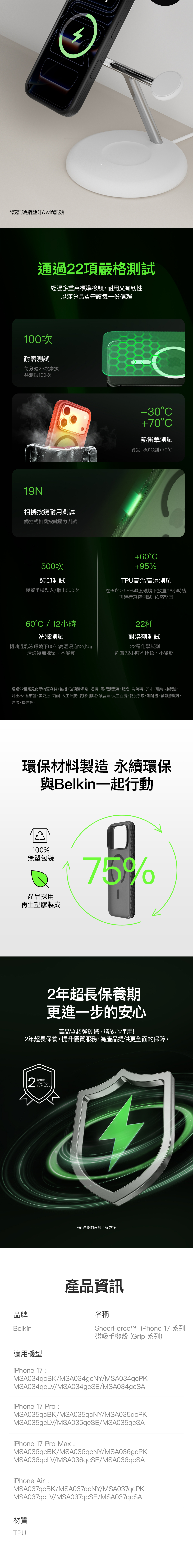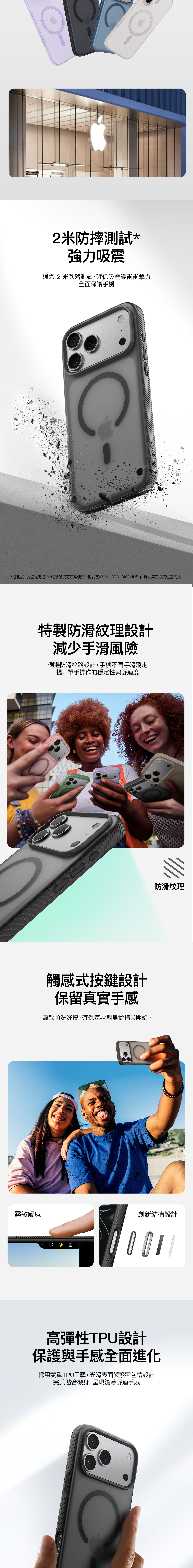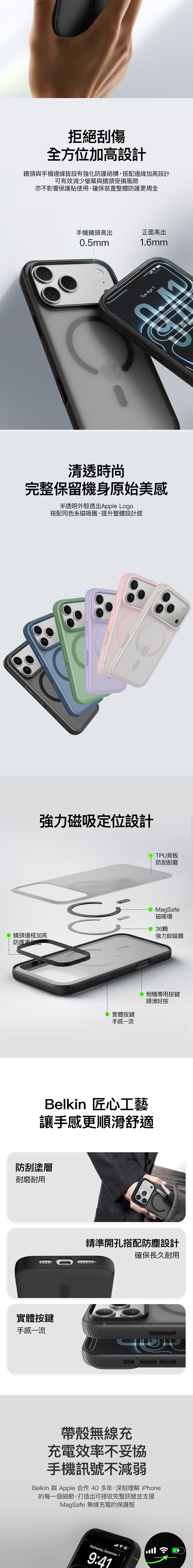 MagSafe 兼容磁吸手機保護殼可提供最高 2 米的掉落防護,專為保護 iPhone 17 而設計。† 採用抗黃** 物料,防止保護殼變色。微凸邊緣可保護相機和螢幕,避免手機正面朝下時被刮花。