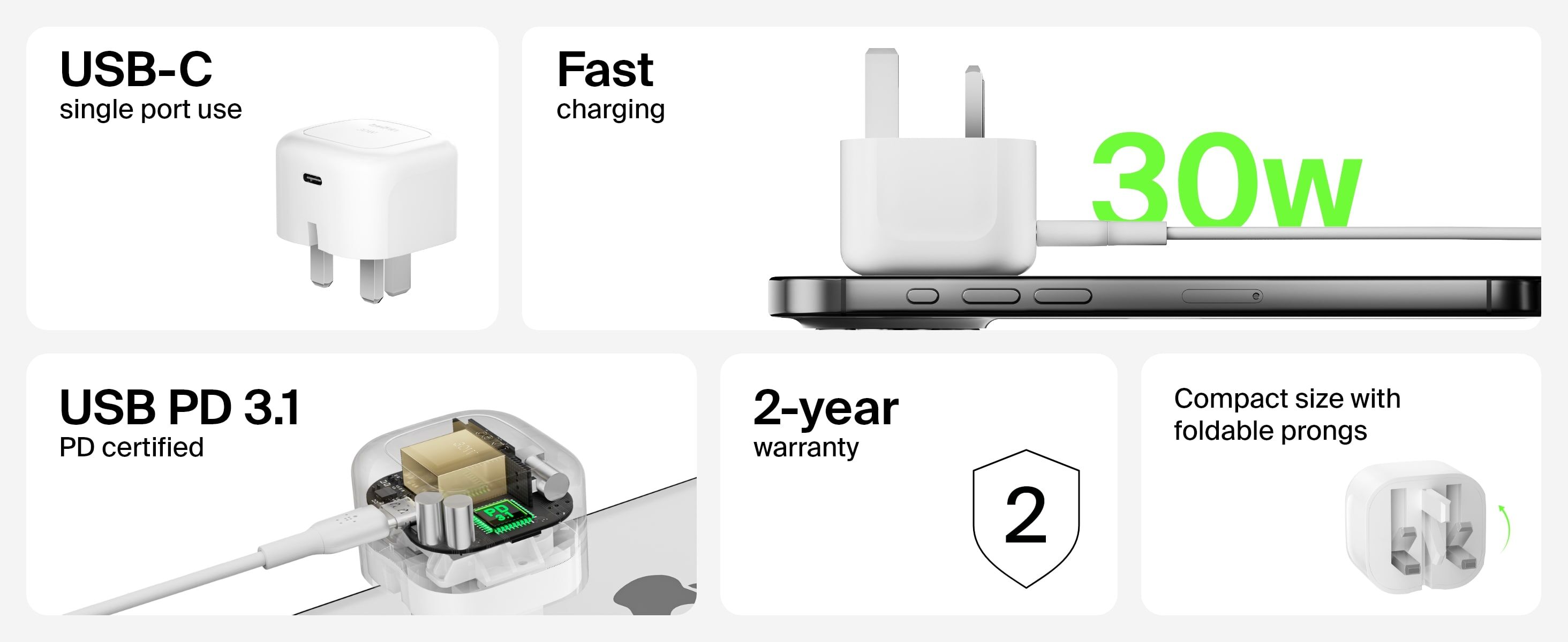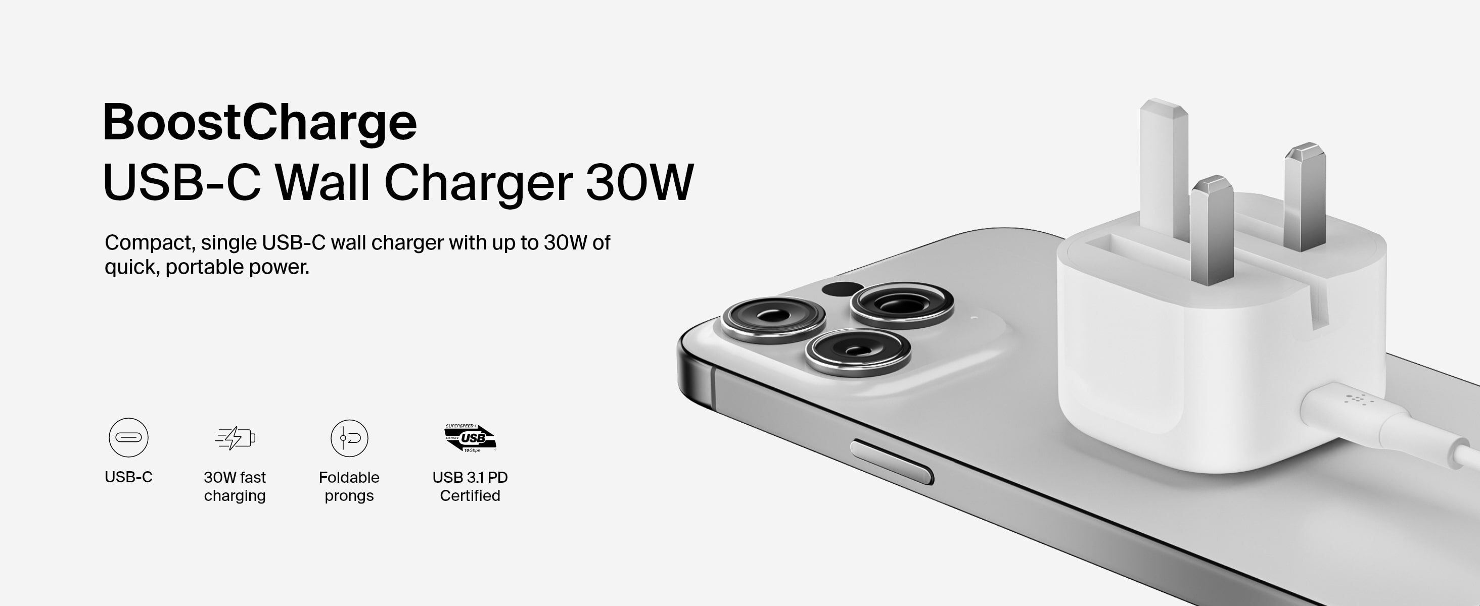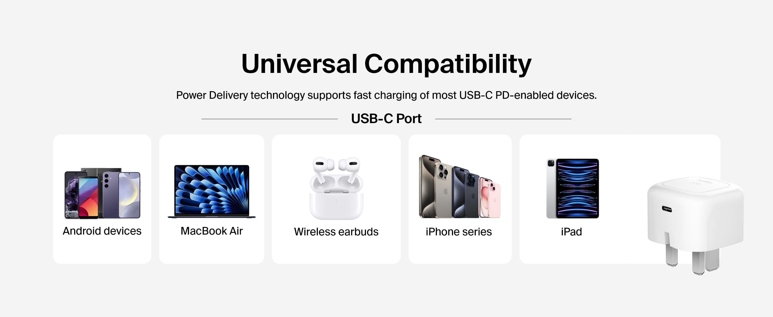 使用我們的 USB-C 迷你充電器 30W,快速為 iPhone、iPad 或其他兼容裝置充電。產品通過 USB-PD3.1 認證,支援多款裝置,包括 Apple、Google、Samsung 及其他具備 PD 功能的智能手機和平板電腦。