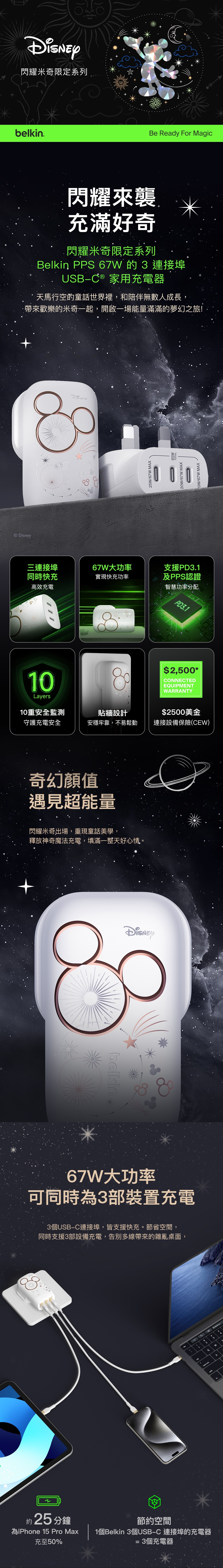 BoostCharge PPS 67W 的 3 連接埠 USB-C 家用充電器 (閃耀米奇, 迪士尼系列)