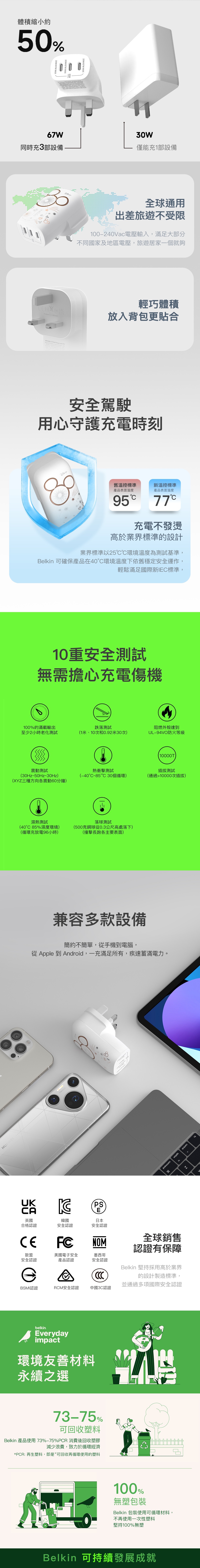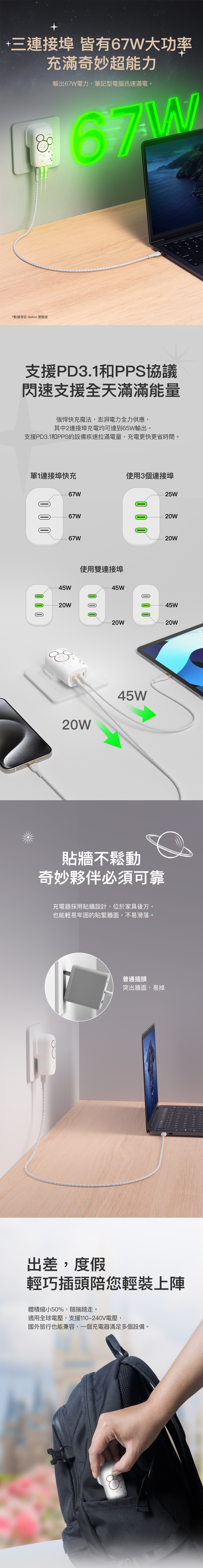 這款 3 埠 USB-C PPS 67W 家用充電器能讓您同時為三部裝置快速充電,或單一連接埠為筆電提供高達 67W 的功率。三個 USB-C PD 連接埠搭載 PPS 技術,為兼容裝置提供穩定且高效的快充體驗,並支援多種 USB-C 智能手機、平板及筆電。