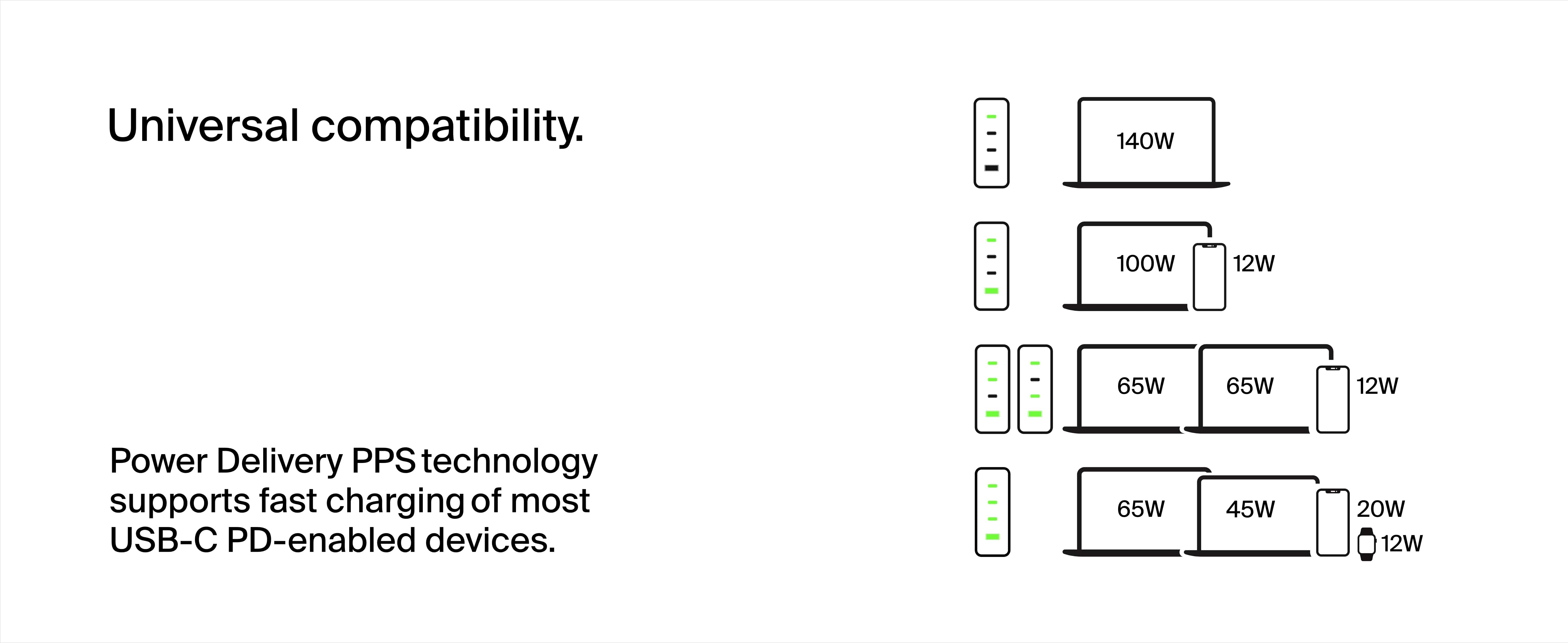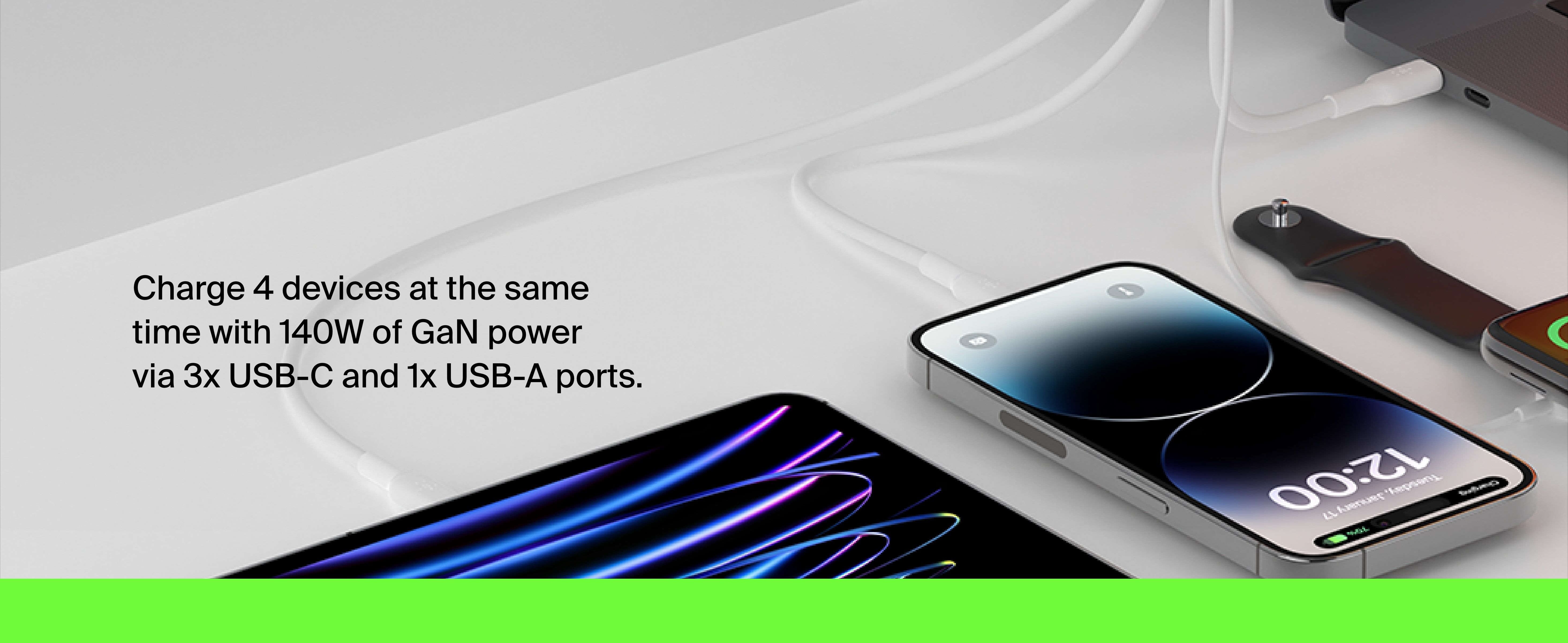 使用我們的 140W 4 連接埠 GaN 家用充電器為筆記本電腦和其他 3 台裝置供電。 三個 USB-C PD 連接埠可為所有兼容裝置提供快速充電,還有一個方便的 USB-A 連接埠用於標準充電。