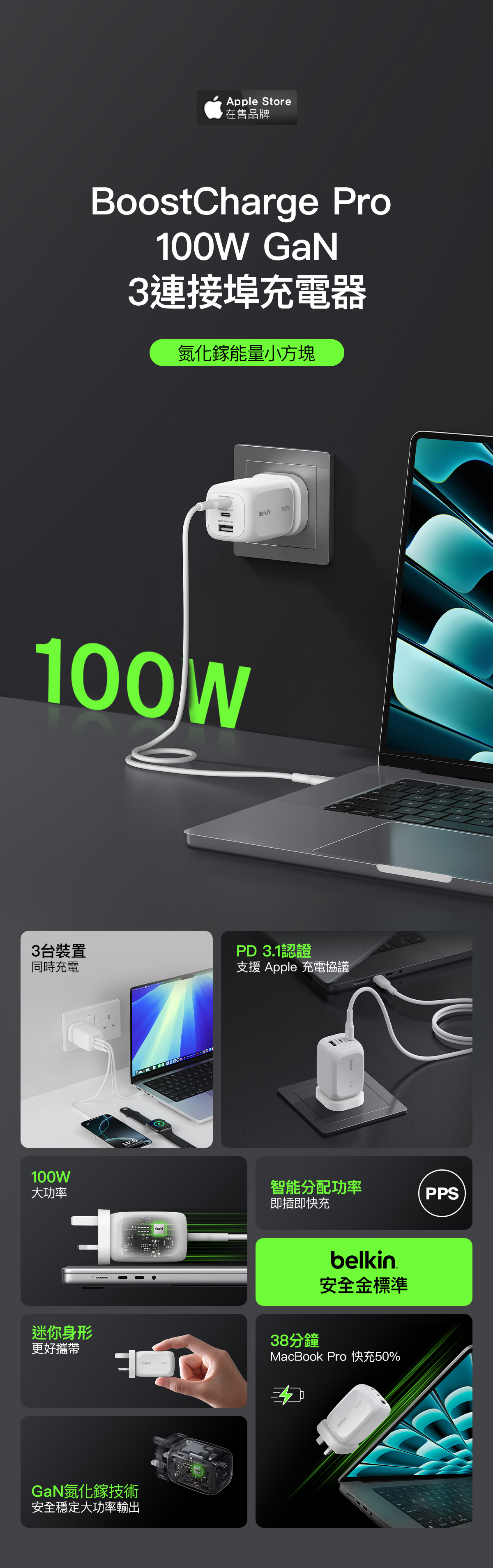 BoostCharge Pro 3 連接埠 GaN 旅行充電器 100W