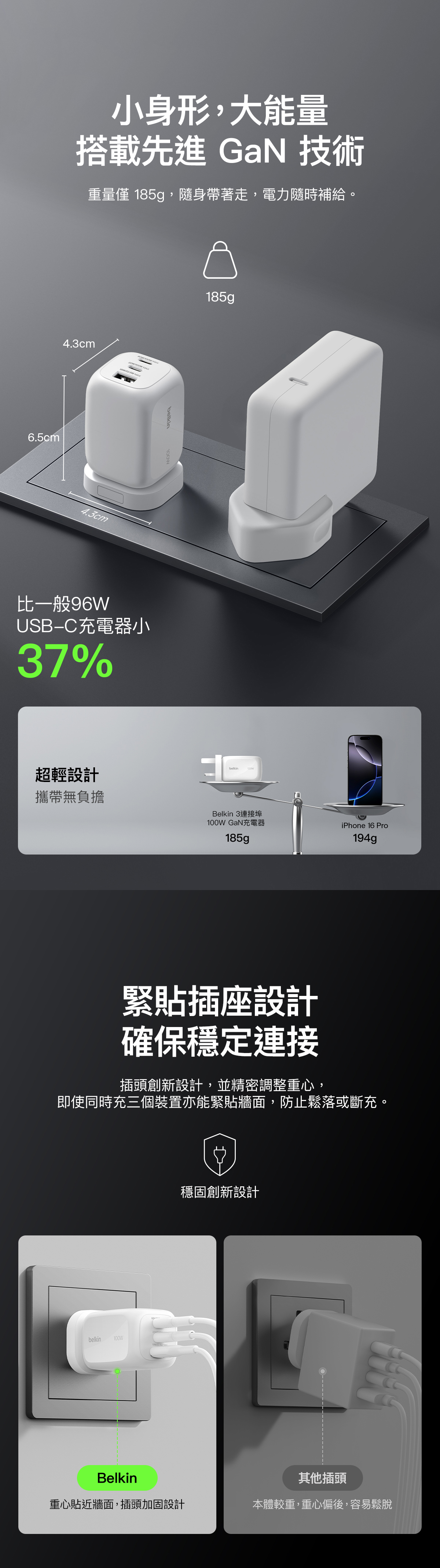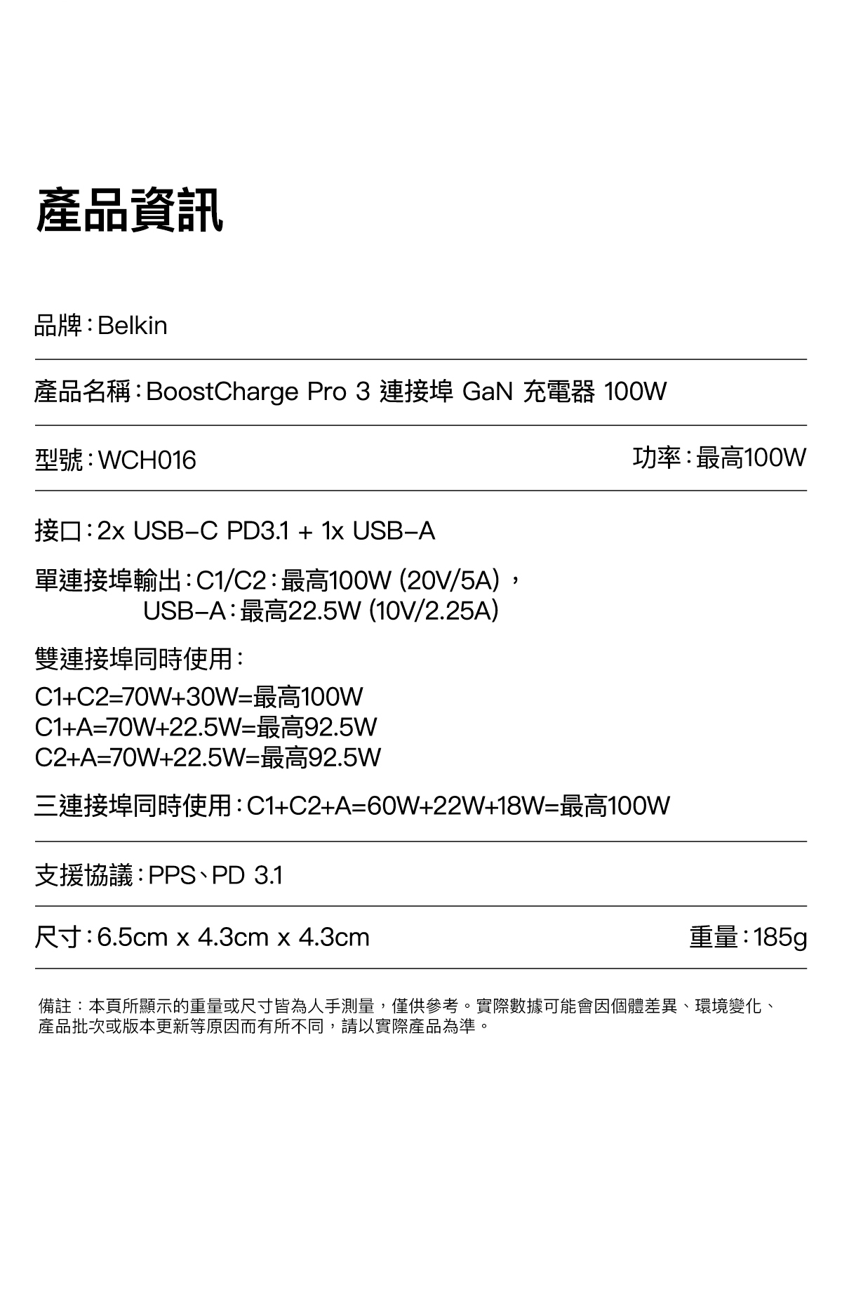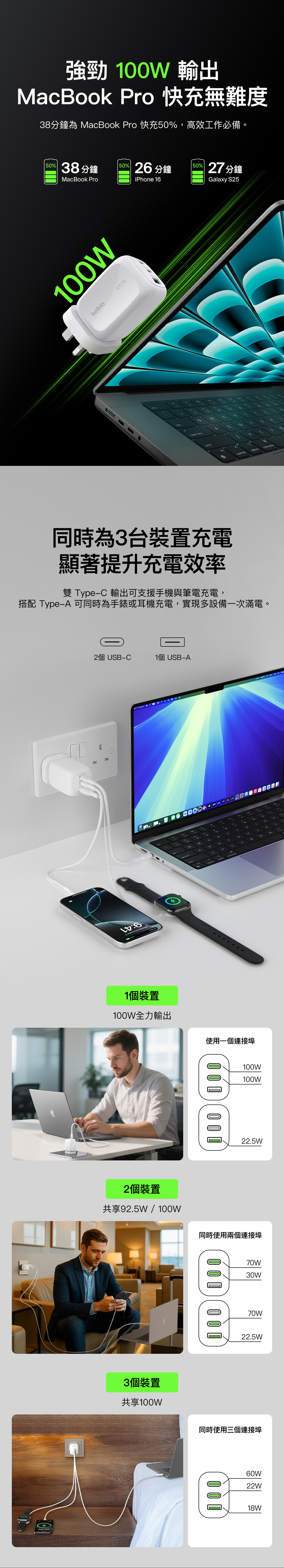 • 最多可同時為三部裝置充電,總電流輸出量達 100W