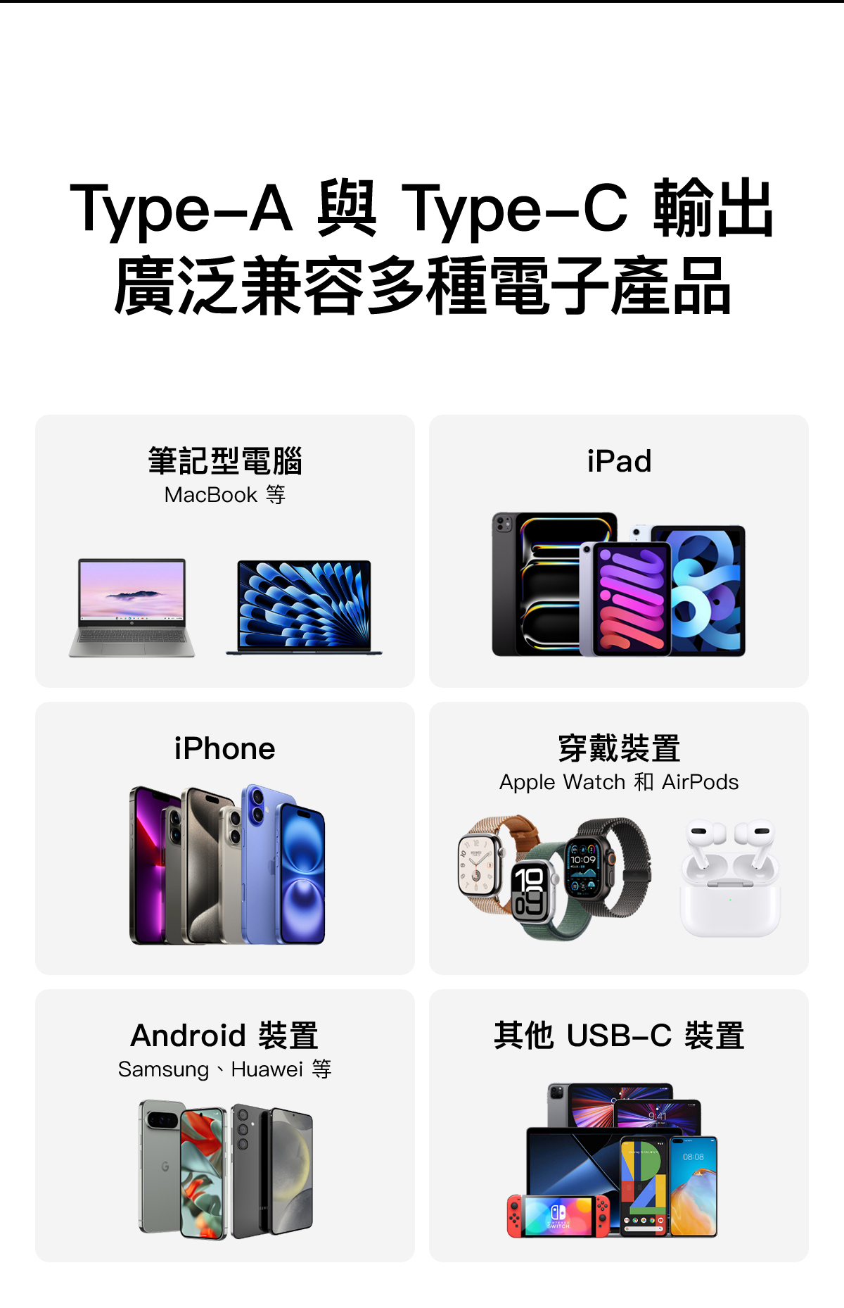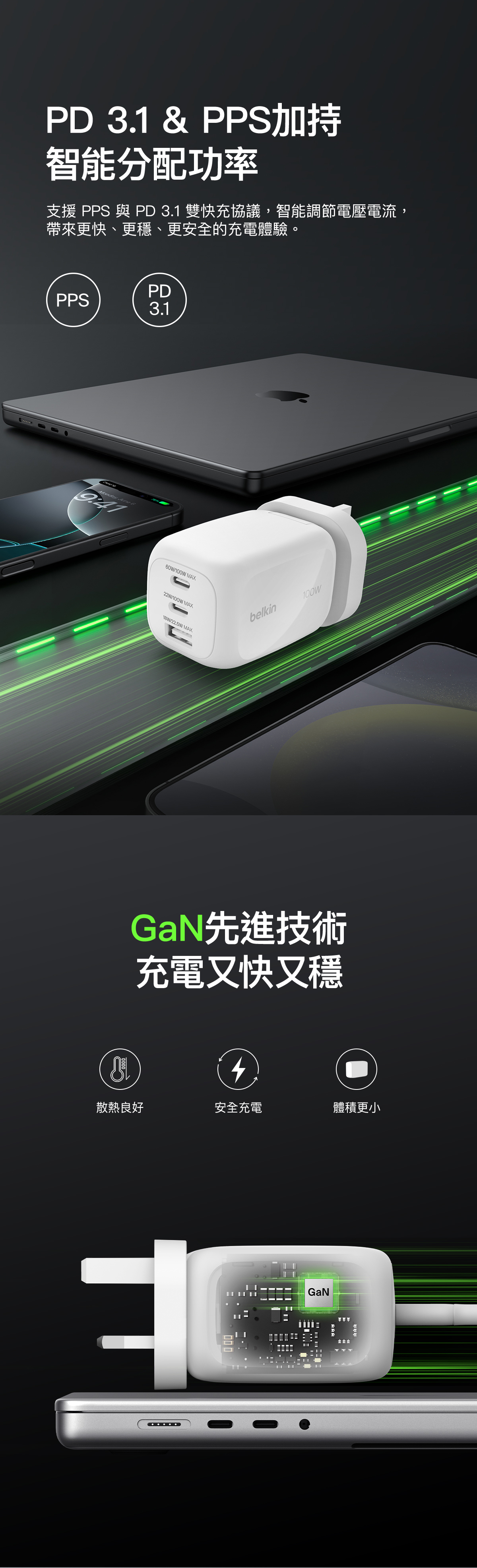 • 支援大多數 PD 3.1、PD 3.0 及 PPS 裝置的快速充電功能