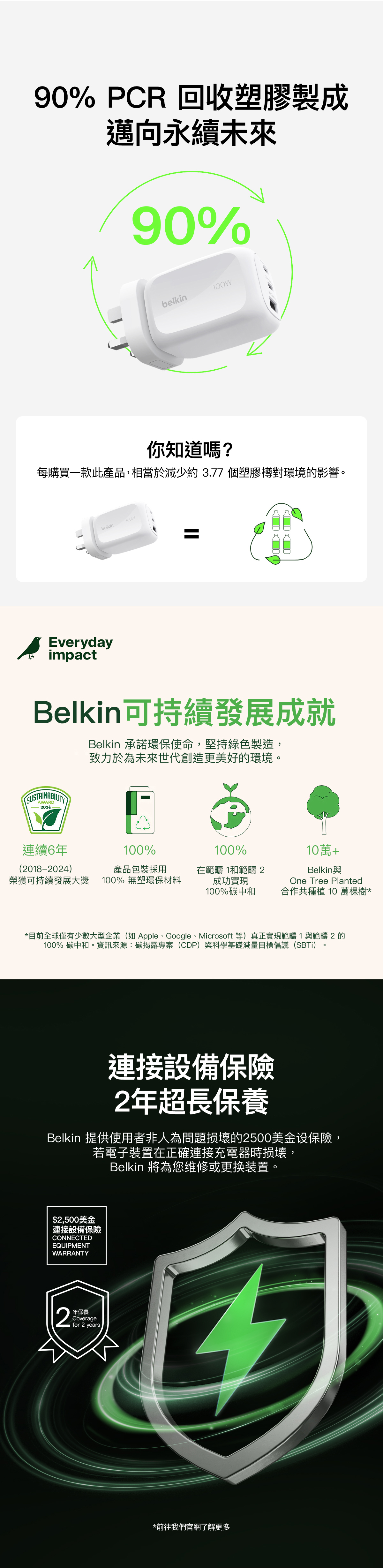 如果您的裝置正確連接至本產品時,因電流異常損壞,Belkin 將提供價值最高 HK$20,000 的維修或更換服務。請瀏覽 belkin.com/cew 了解詳情。