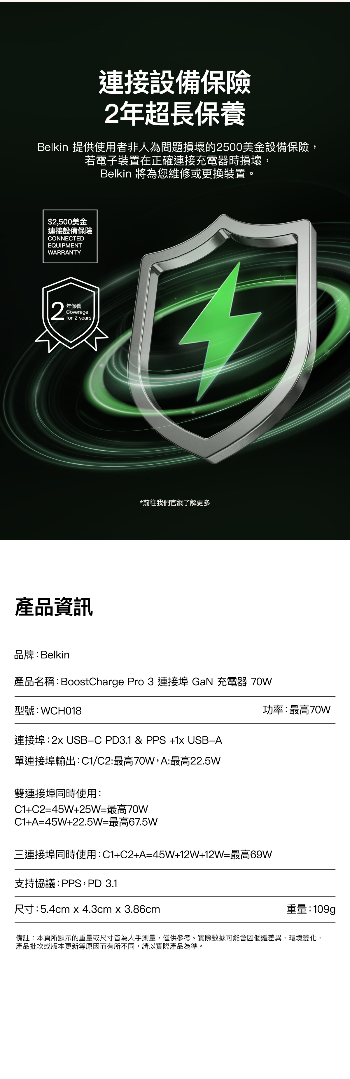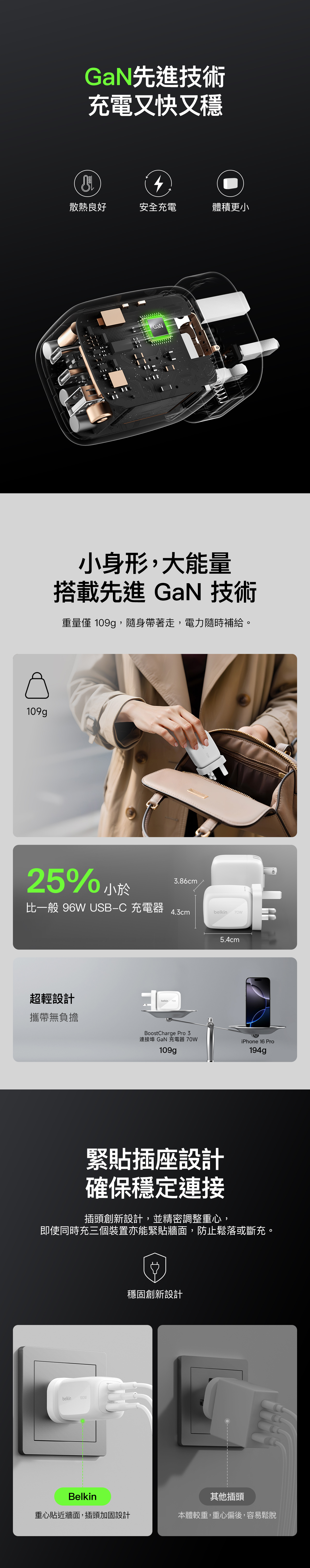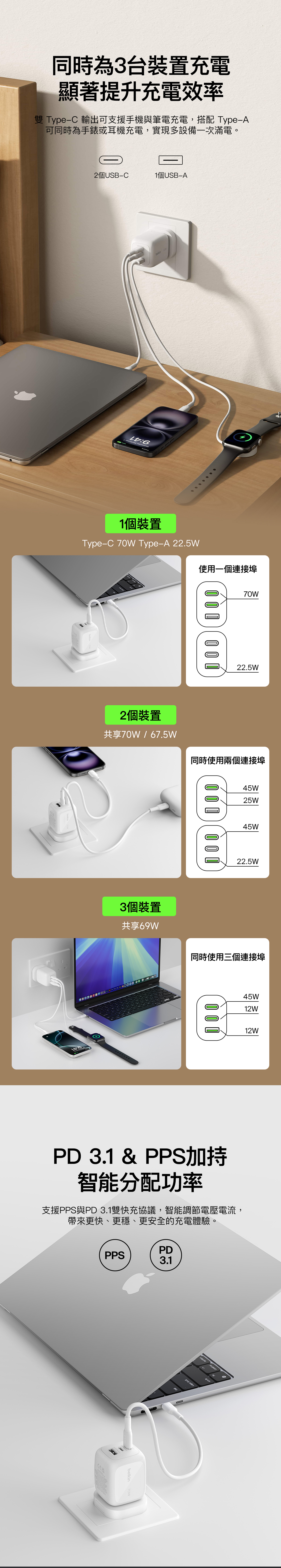 這款輕巧便攜的 GaN 旅行充電器快速有效率。除了提供 70W 電力外,更可一次為 3 部裝置充電,深受專業人士和旅客青睞。一個充電器即可為手機、手提電腦、耳塞式耳機、Apple Watch 和平板電腦提供電力,讓您的旅途更輕鬆。